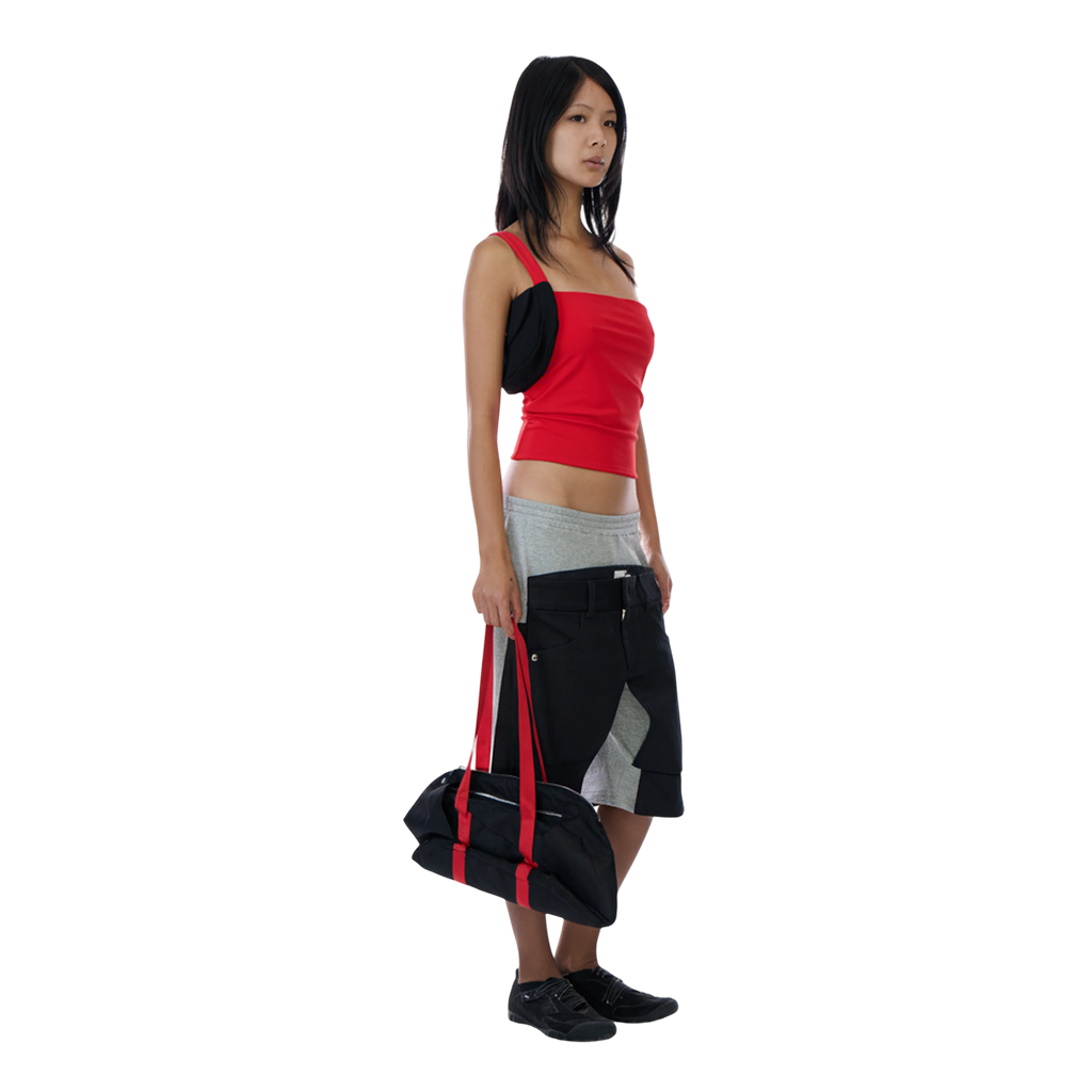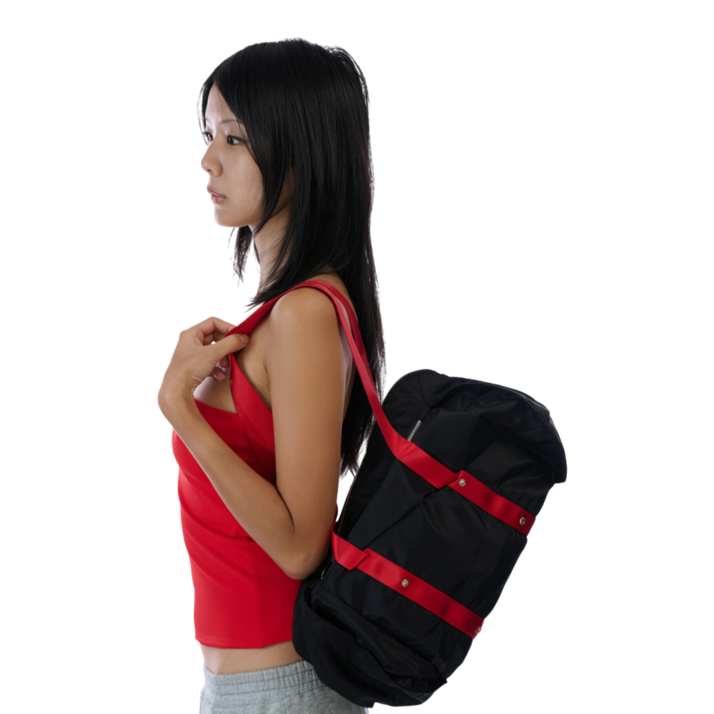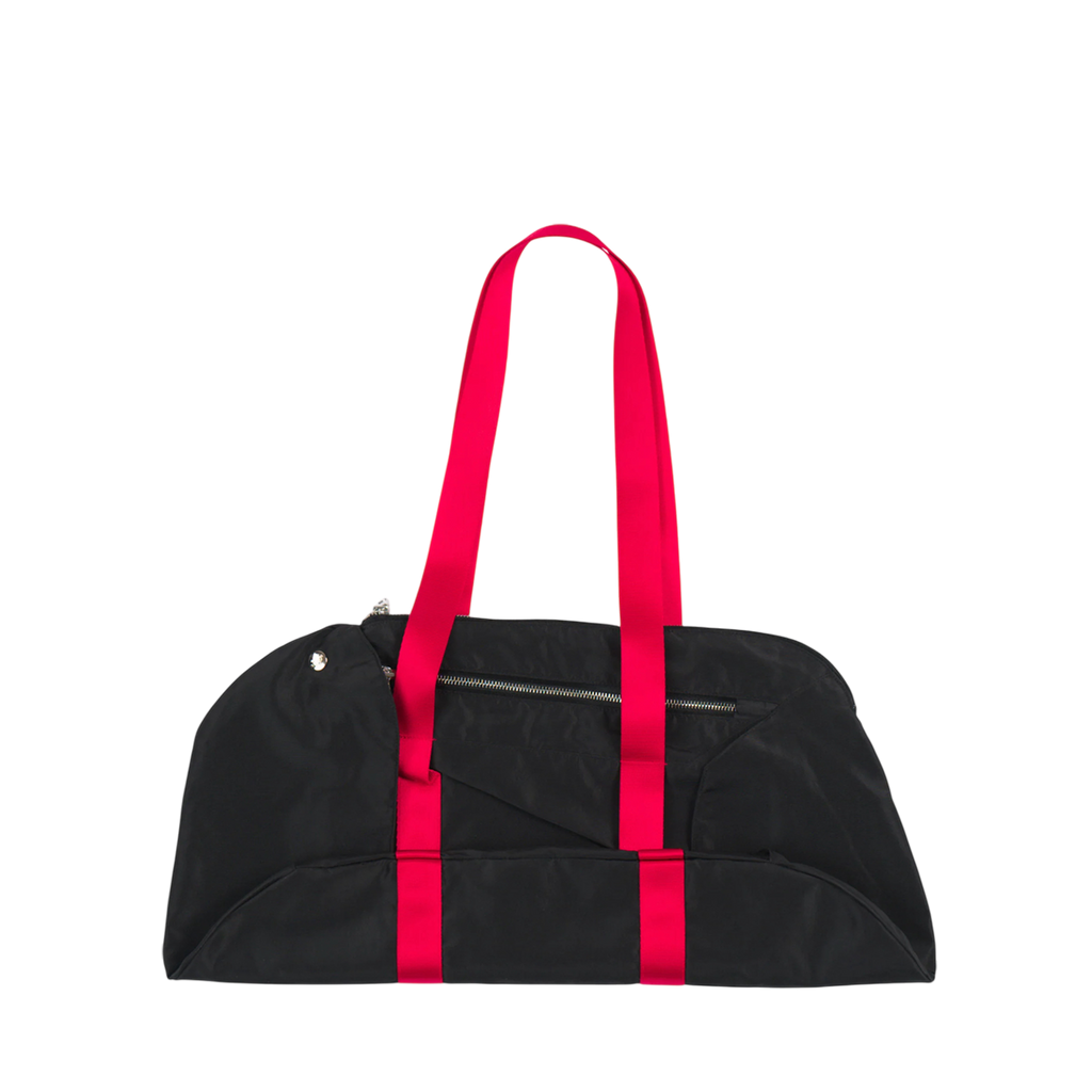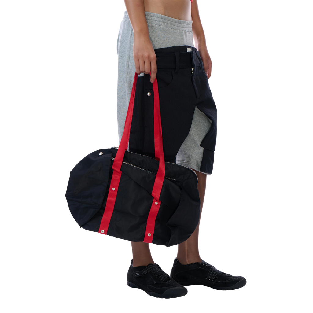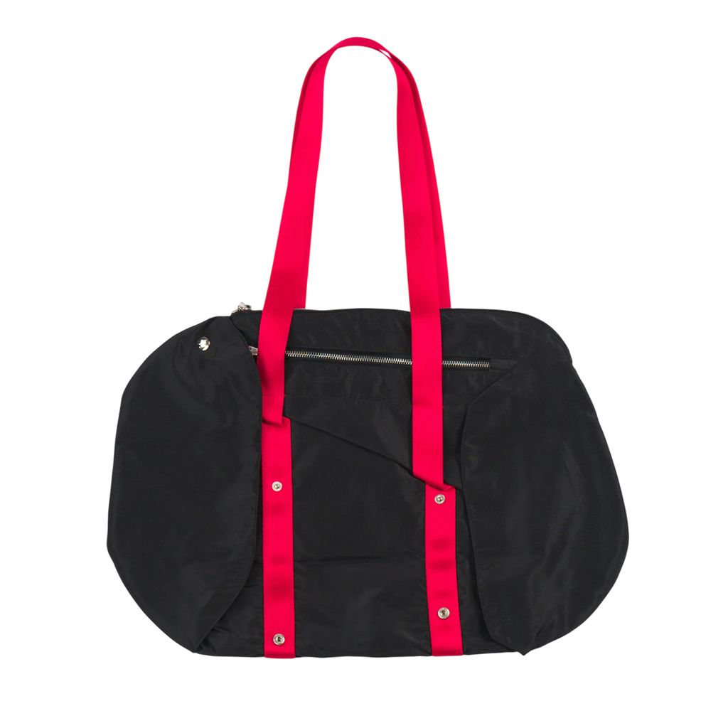 Lightweight Silk Taffeta Duffle bag in black. Constructed with a fixed pressed silhouette that can expand into larger volume when snaps are released.
