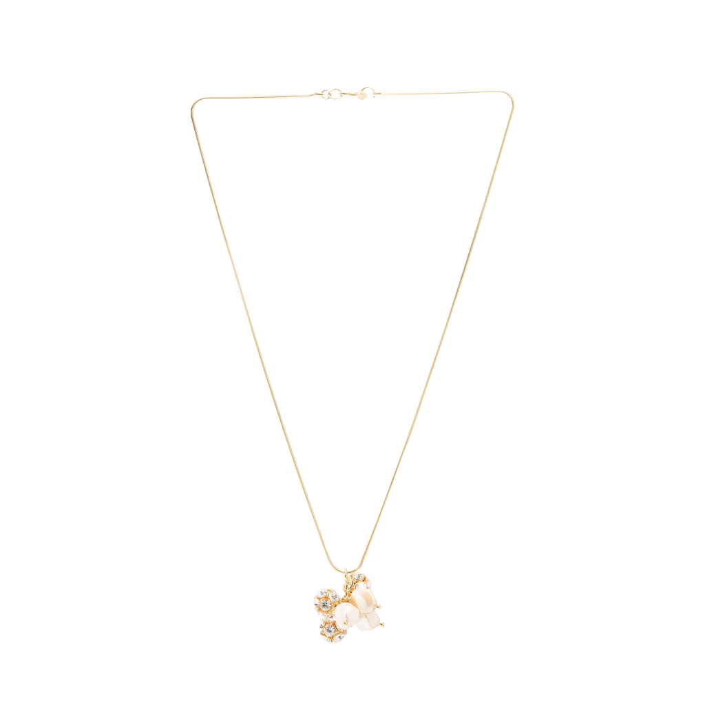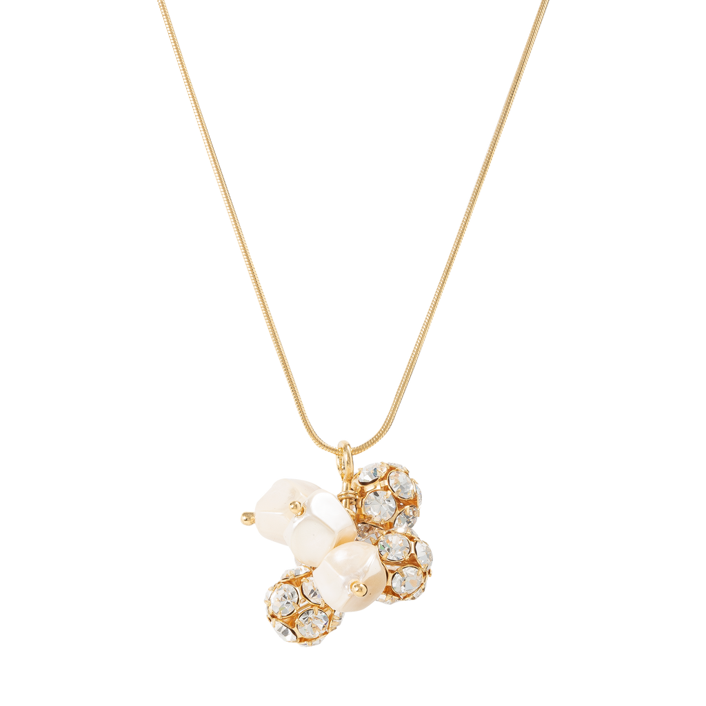 An 18” snake chain, featuring a pendant with a stacked cluster of faux pearl and rhinestone spheres. Clean gently with soft cloth.