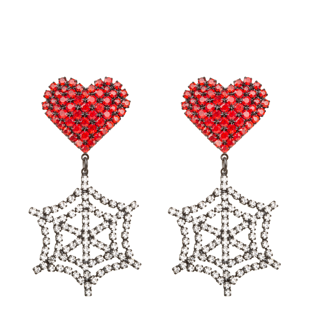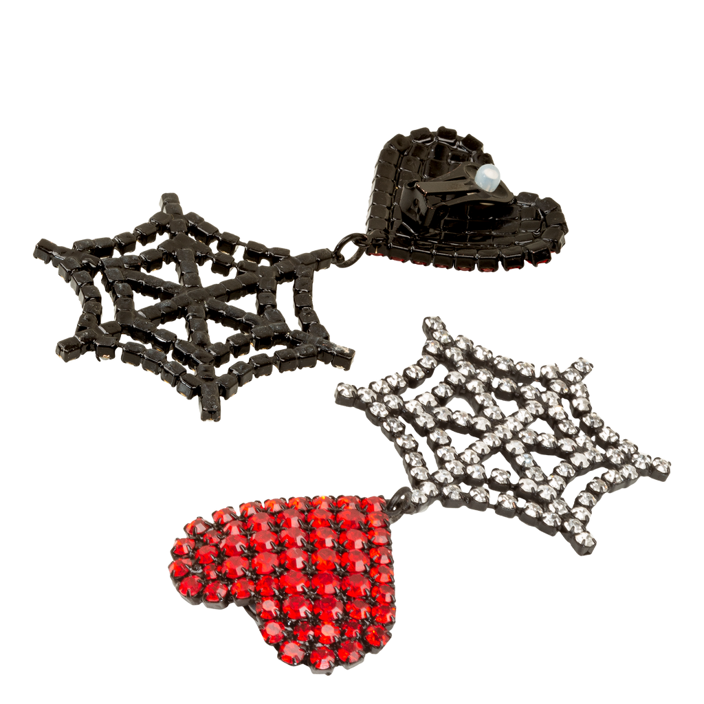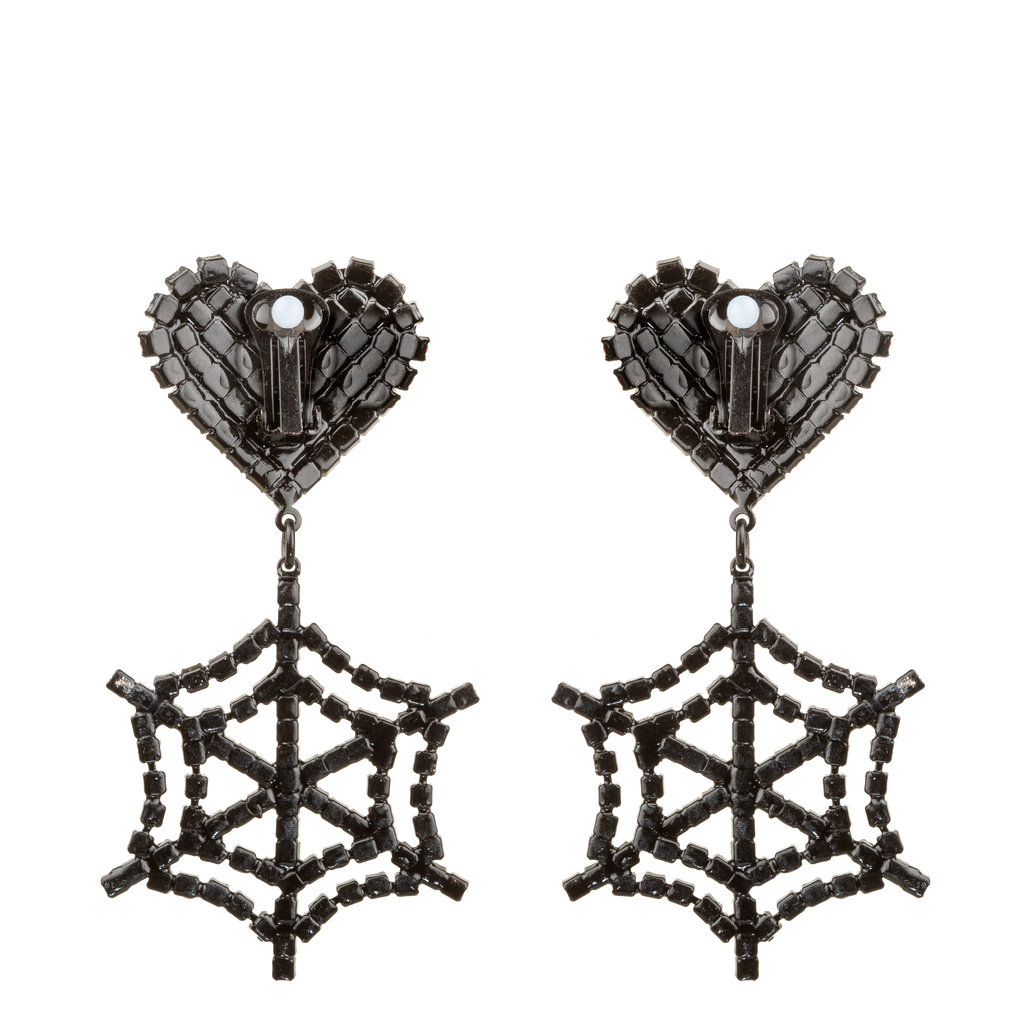 Pair of drop earrings in black metal.. Crystal-cut detailing throughout. Clip-on fastening. Approx. 3" drop.