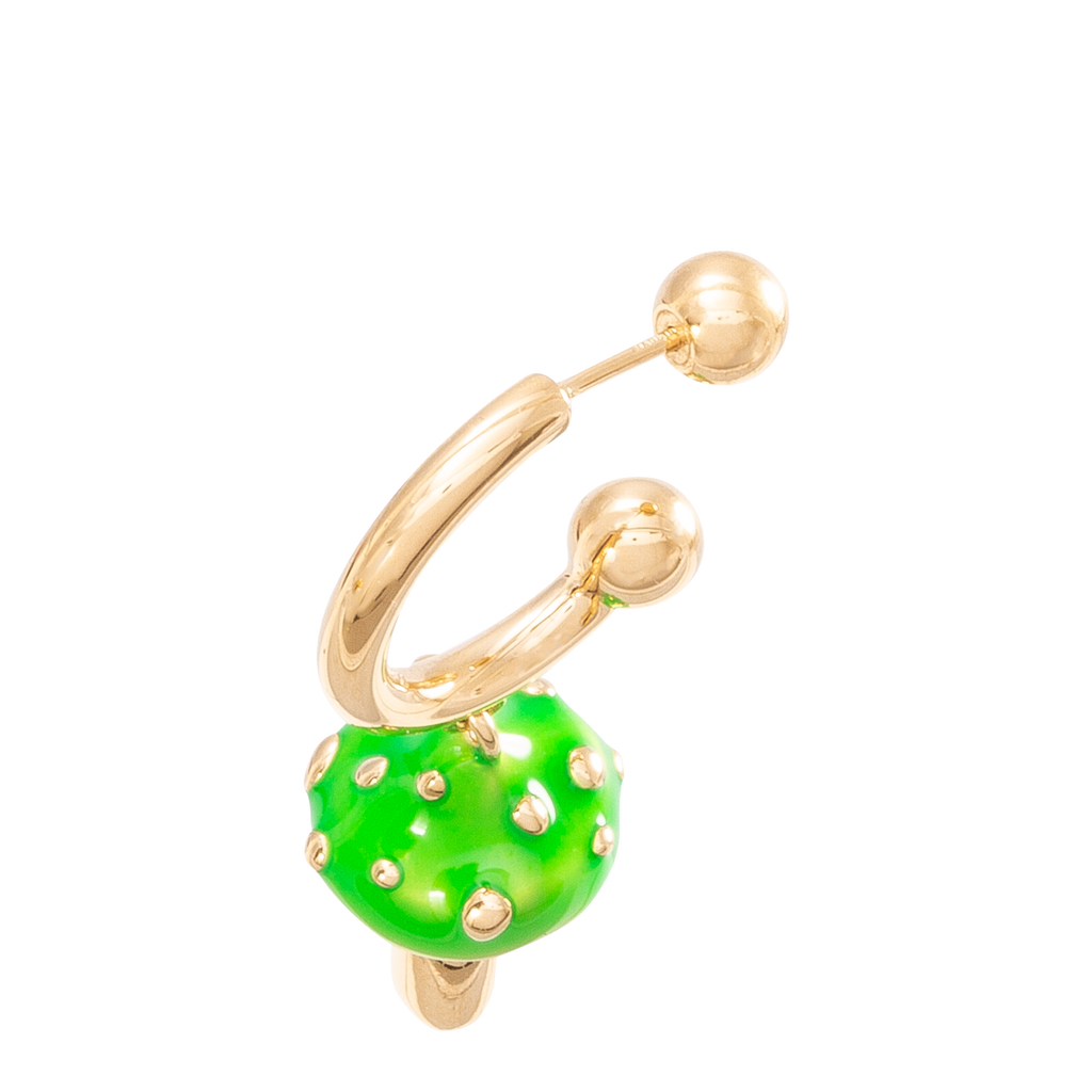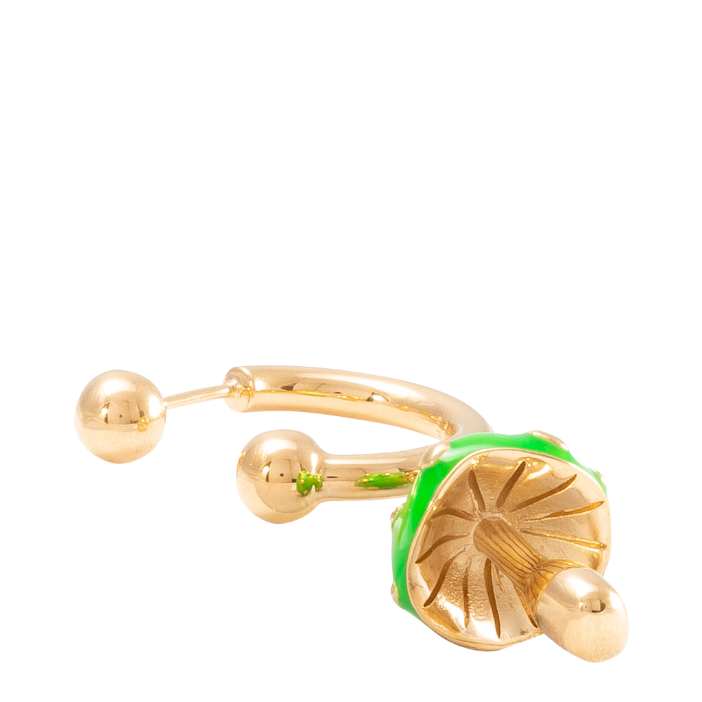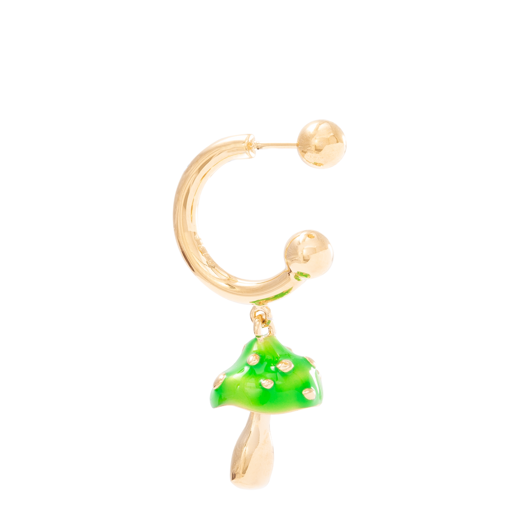 Get ready to join our magic fantasy with this cutie :) Iconic golden mini hoop earring with a green-topped magic mushroom.
