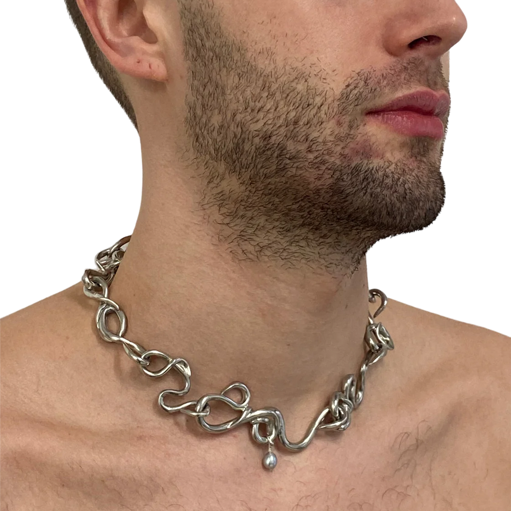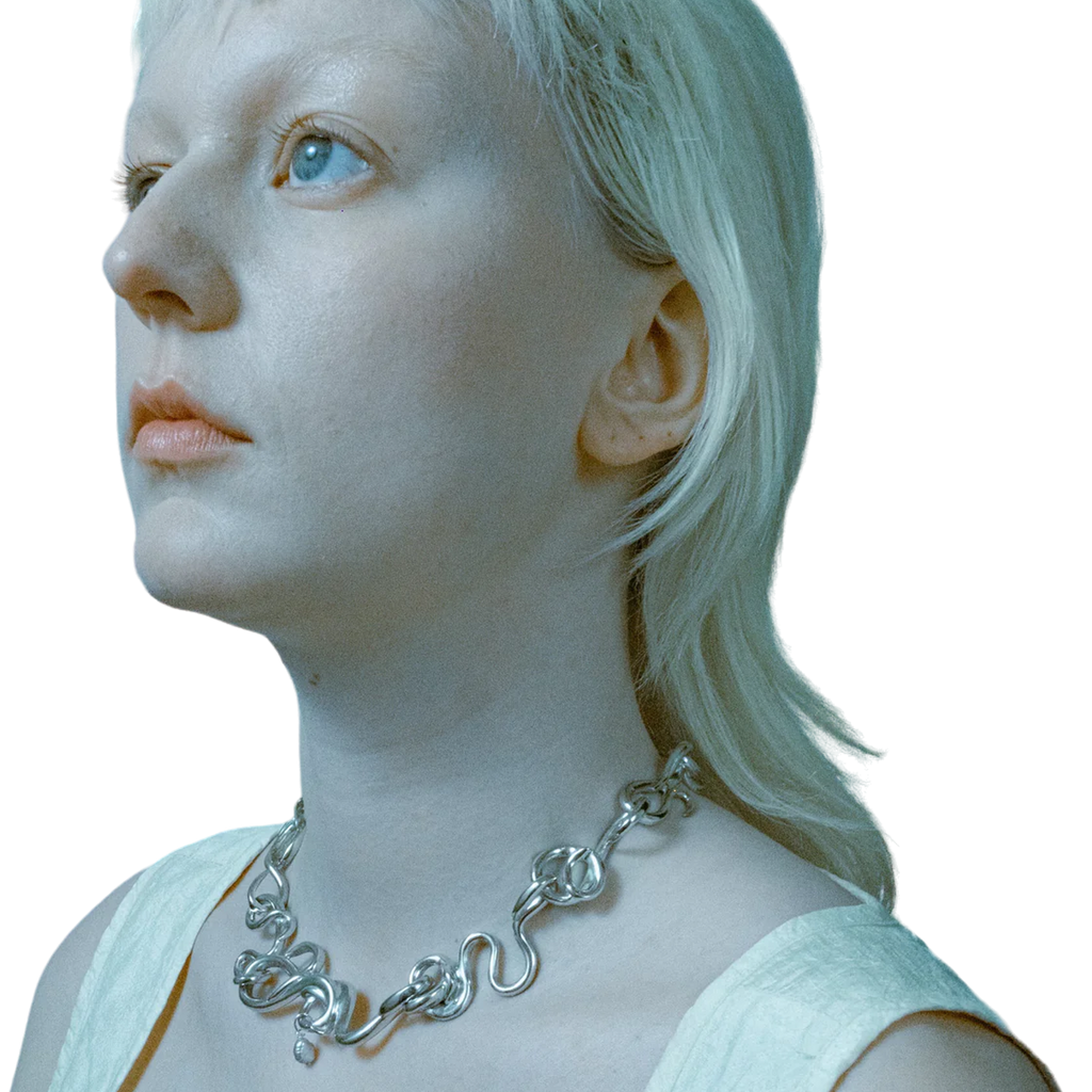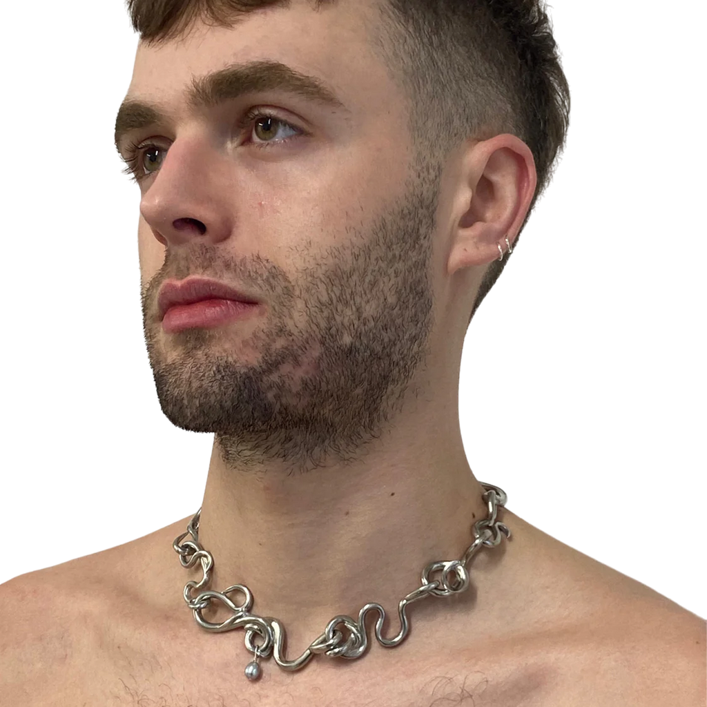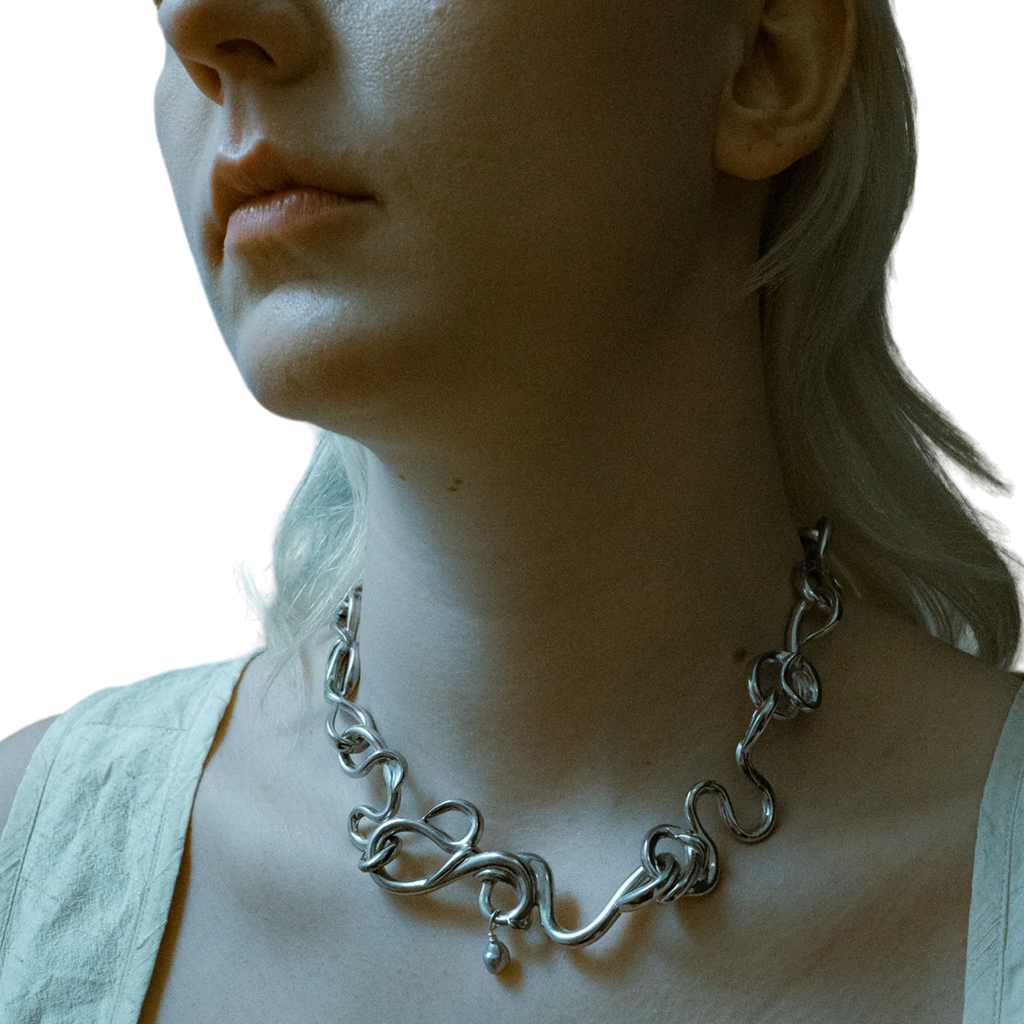 Rosie Grace Ward is a London-based multidisciplinary artist and jeweller, known for translating her sculptures into wearable art. Working primarily with cast pewter, resin, and silver, she meticulously crafts each piece by hand in her studio. Her standout creation, the 'Worm Necklace,' is characterized by its individual snaking links, each embellished with a single grey pearl.