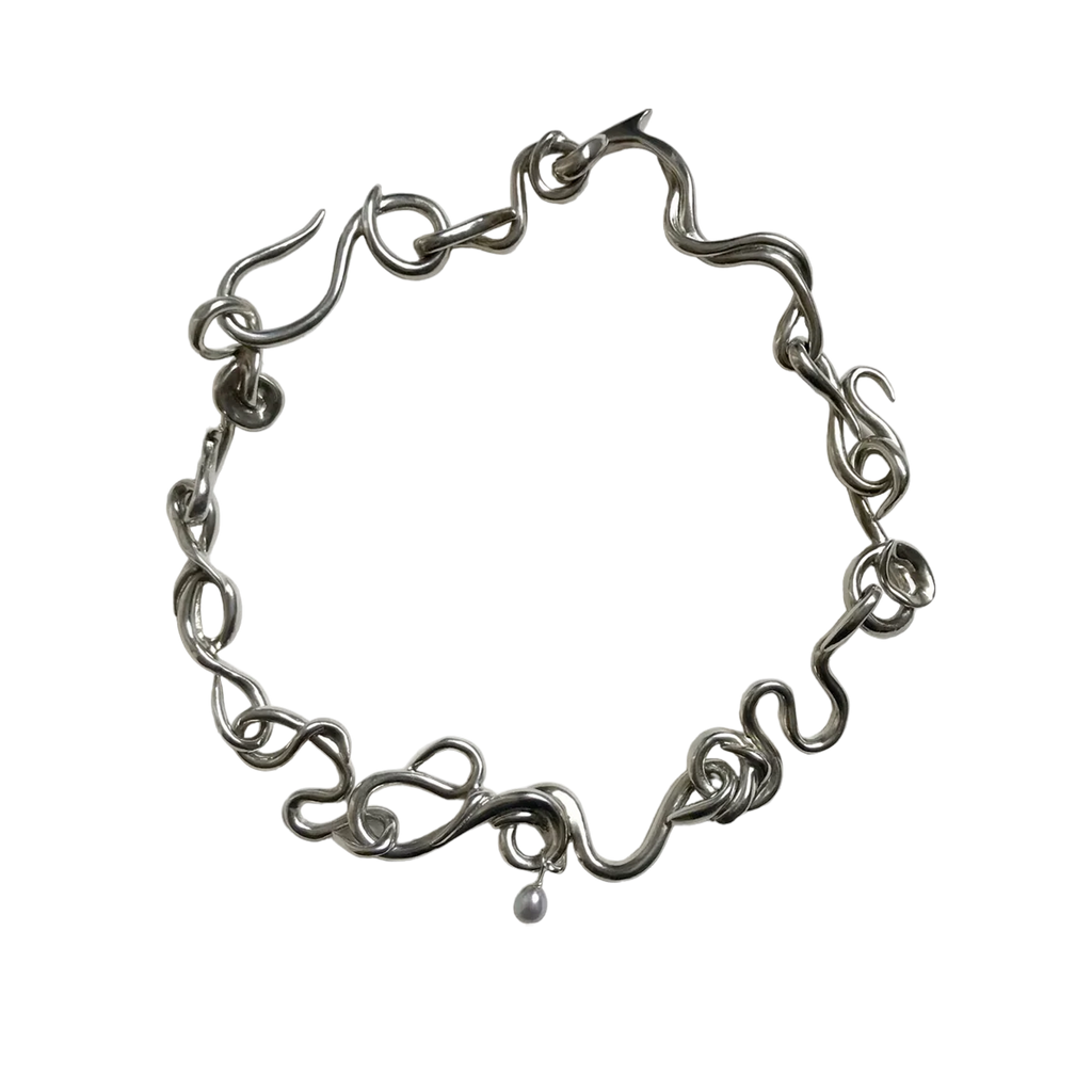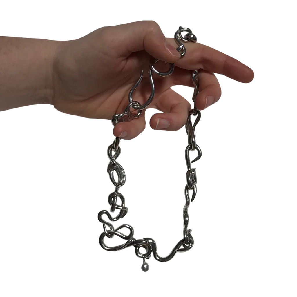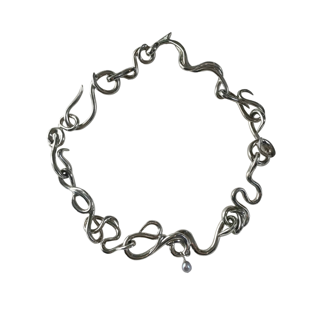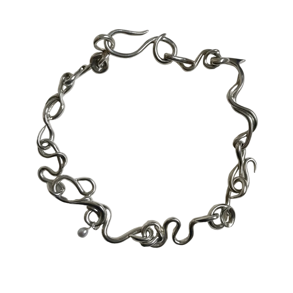 Rosie Grace Ward is a London-based multidisciplinary artist and jeweller, known for translating her sculptures into wearable art. Working primarily with cast pewter, resin, and silver, she meticulously crafts each piece by hand in her studio. Her standout creation, the 'Worm Necklace,' is characterized by its individual snaking links, each embellished with a single grey pearl.
