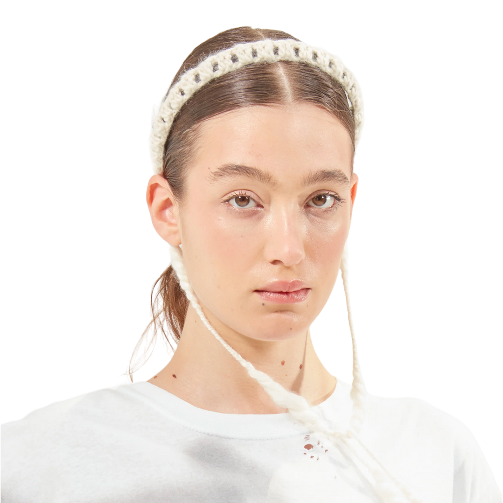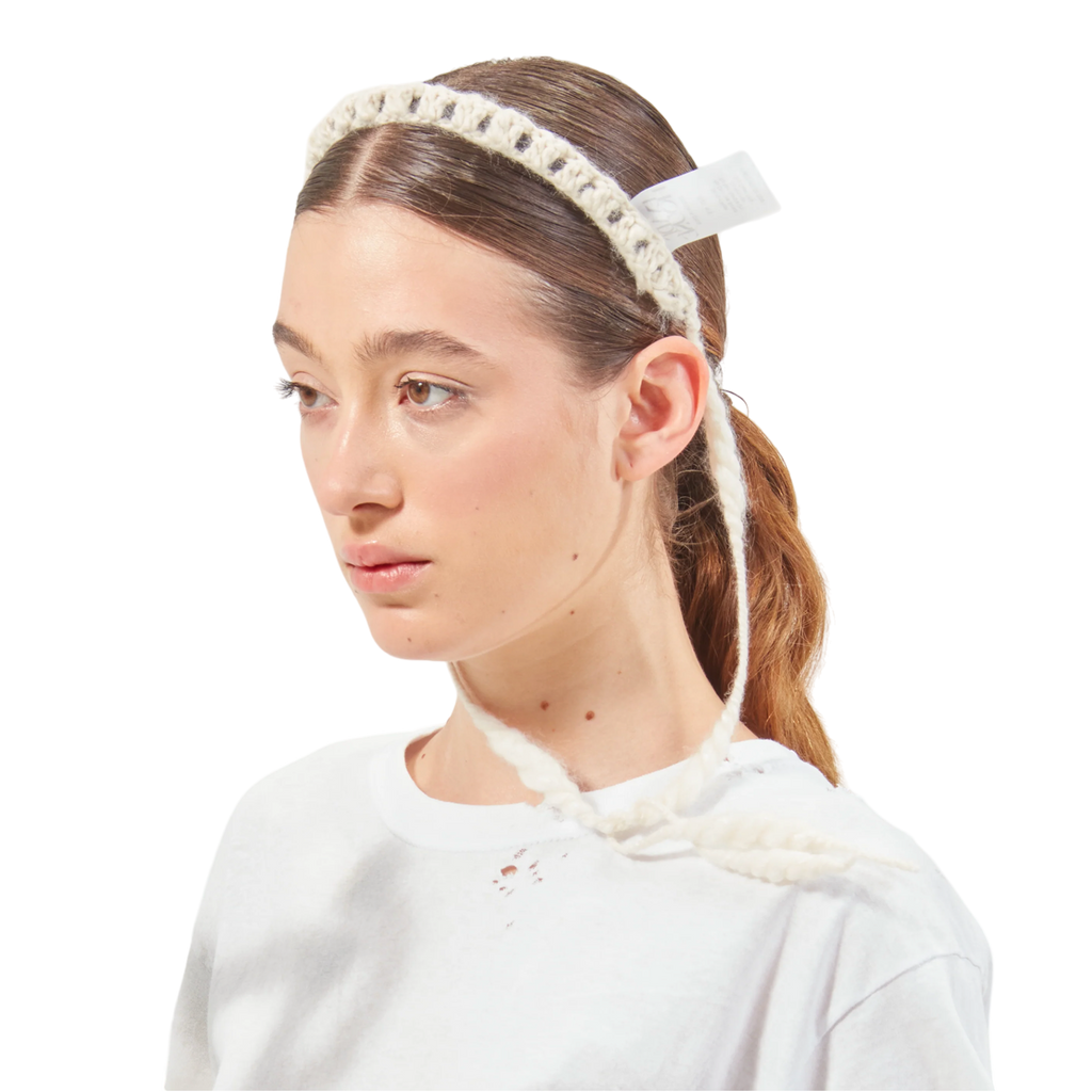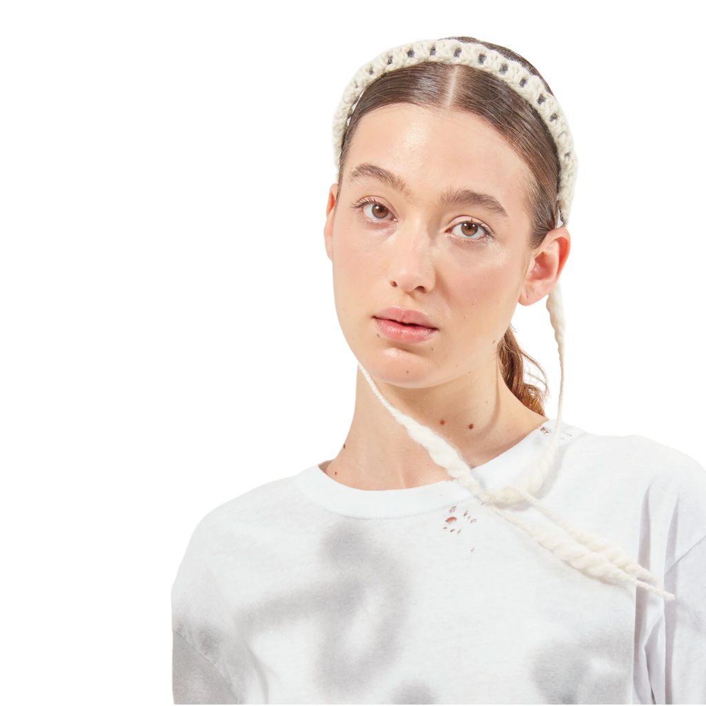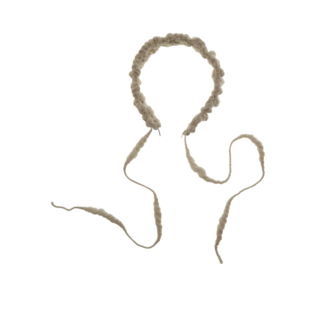The Isabellina Hairband is a crochet headpiece with decorative tassels, handcrafted by our artisans in Madrid using a textural slubbed wool yarn.