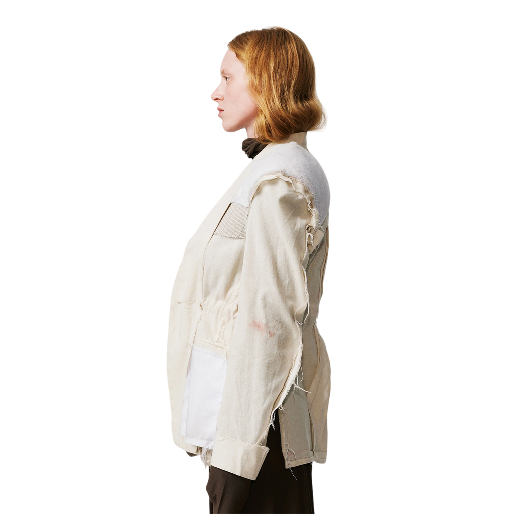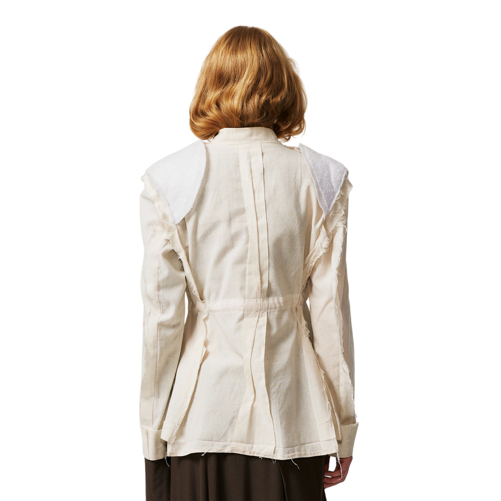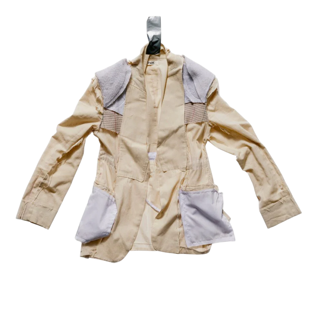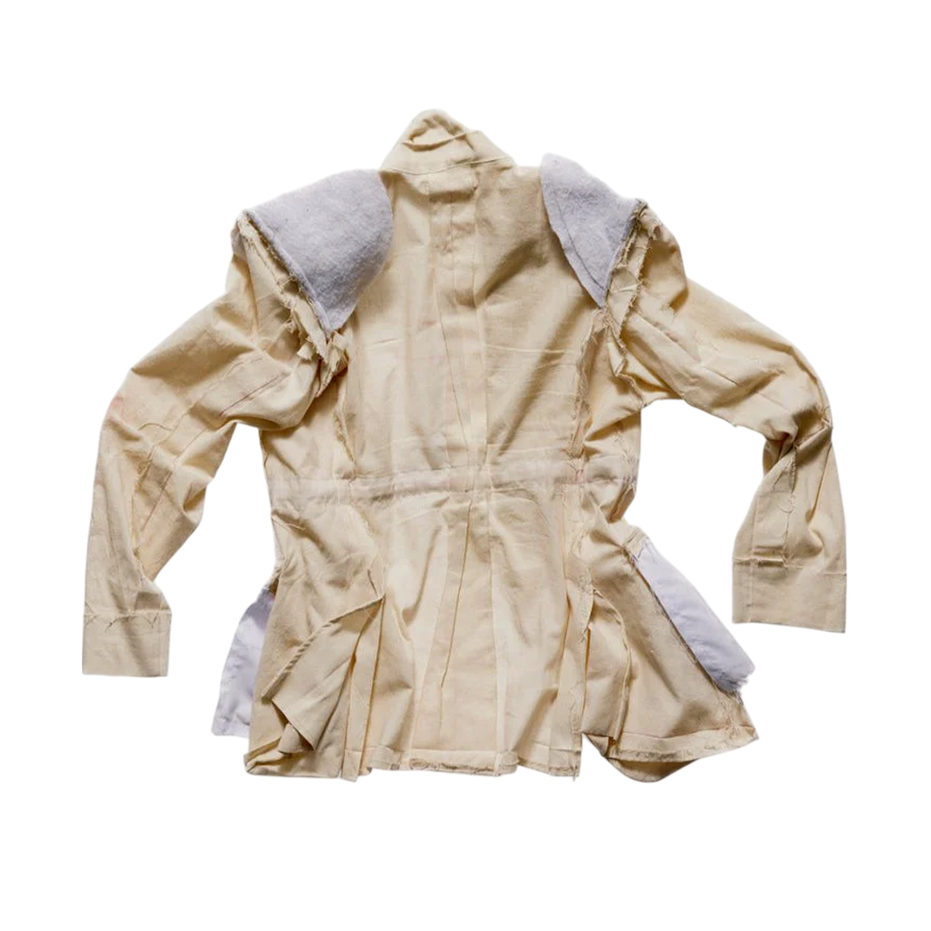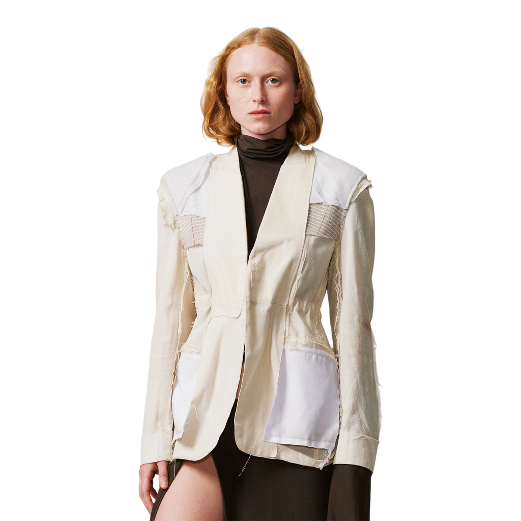 Handcrafted in our Madrid studio, this deconstructed jacket is deliberately reversed, revealing its raw seams and inner structures as a statement of intentional imperfection. Featuring exaggerated shoulder panels and contrasting white pockets, it embodies an artisanal aesthetic. Tailored with a cinched waist, it creates a flattering silhouette.