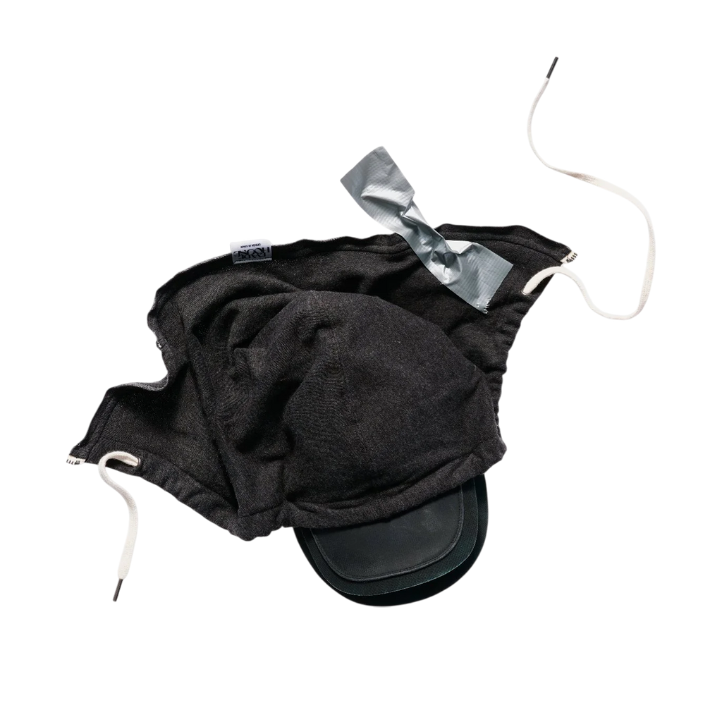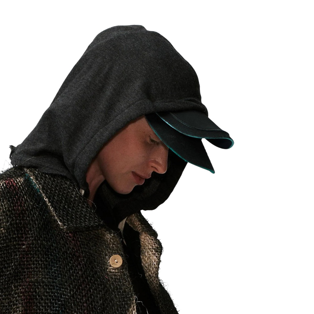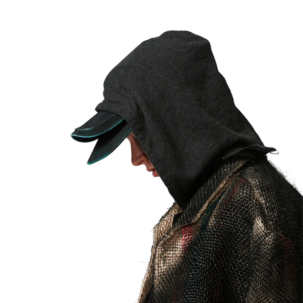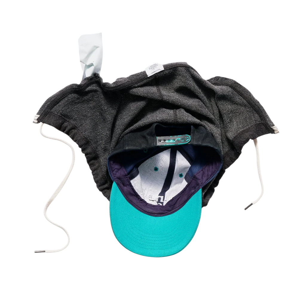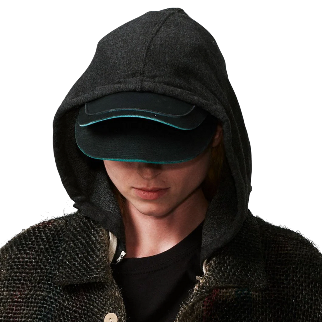 This cap is a unique upcycled design, created by layering two caps and sewing a repurposed sweatshirt hood over them. Spray-dyed black, it features a raw, textured finish. Due to the upcycling process, each cap is one of a kind, ensuring a truly unique piece.