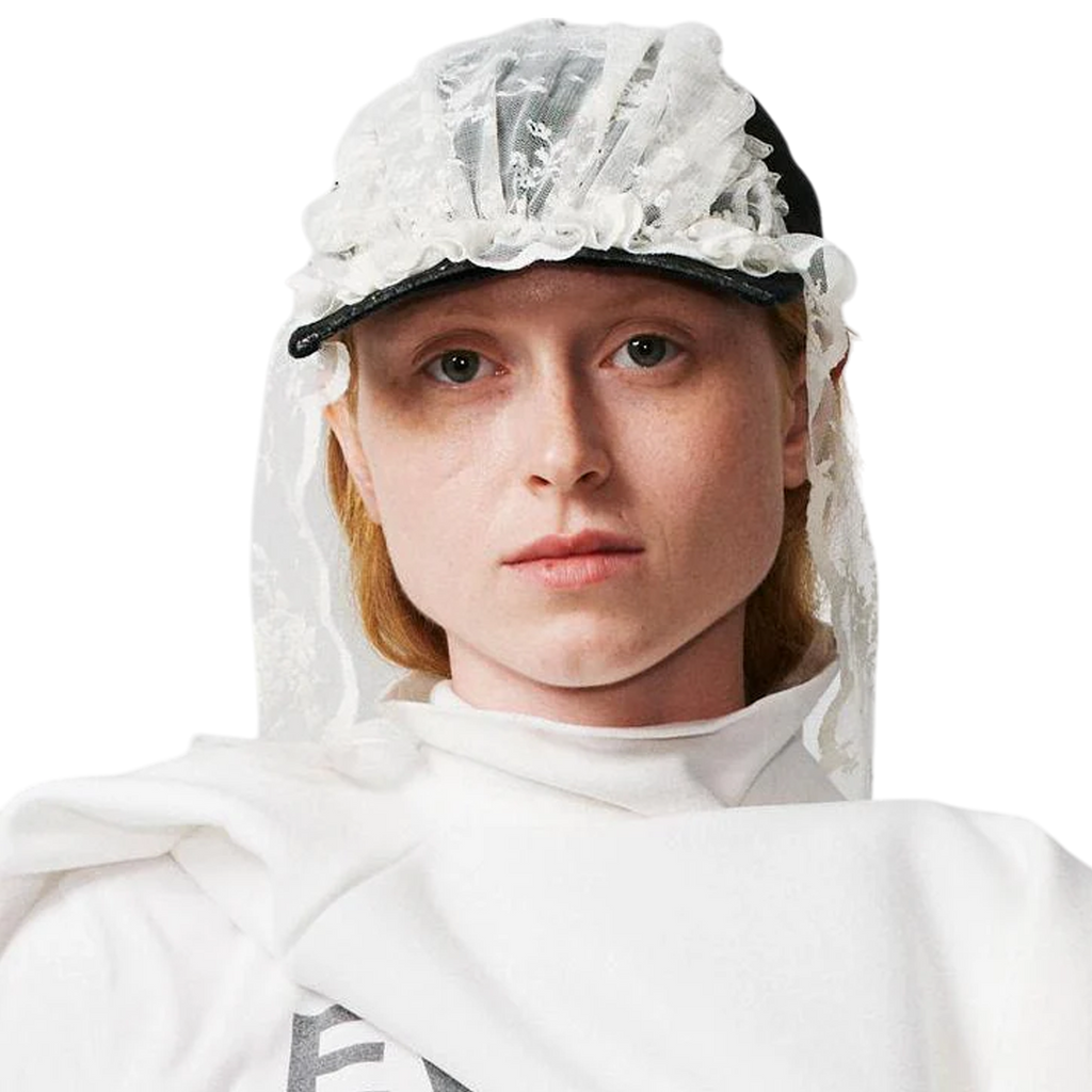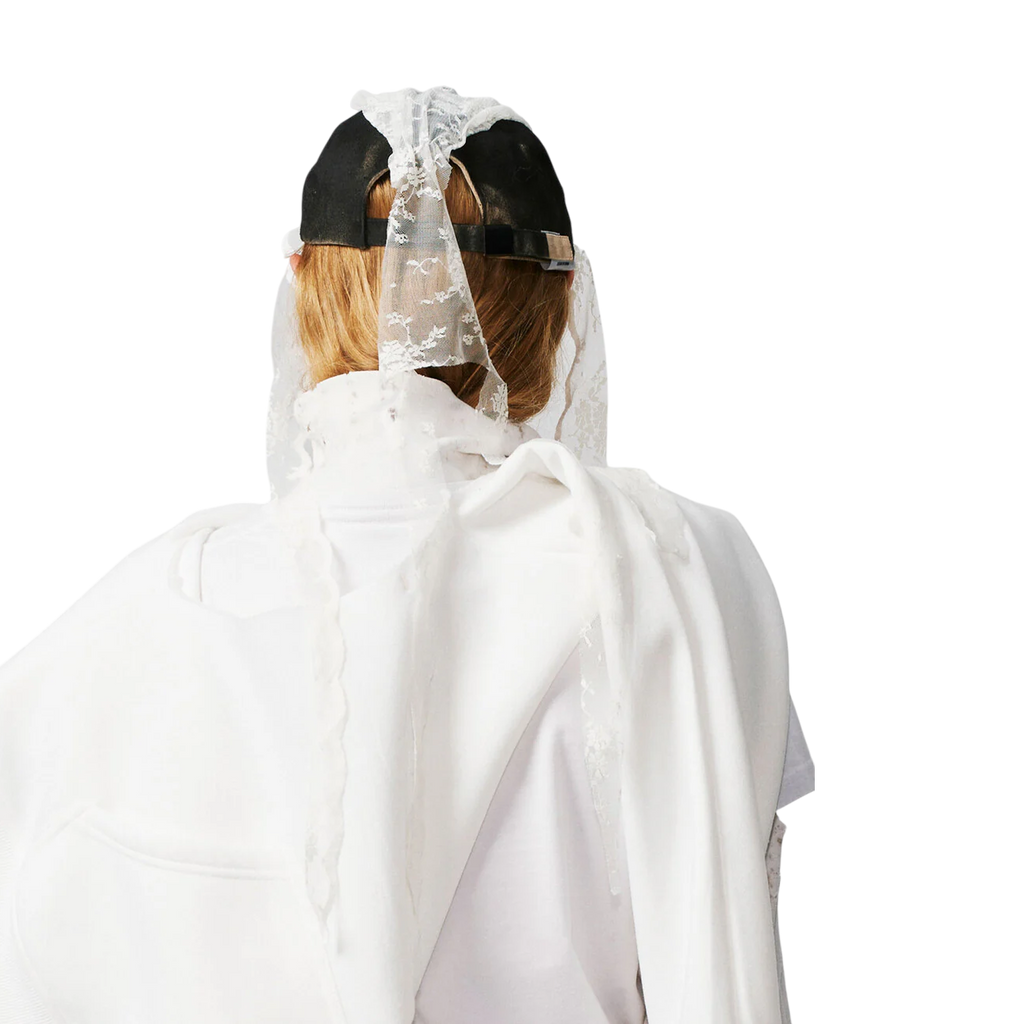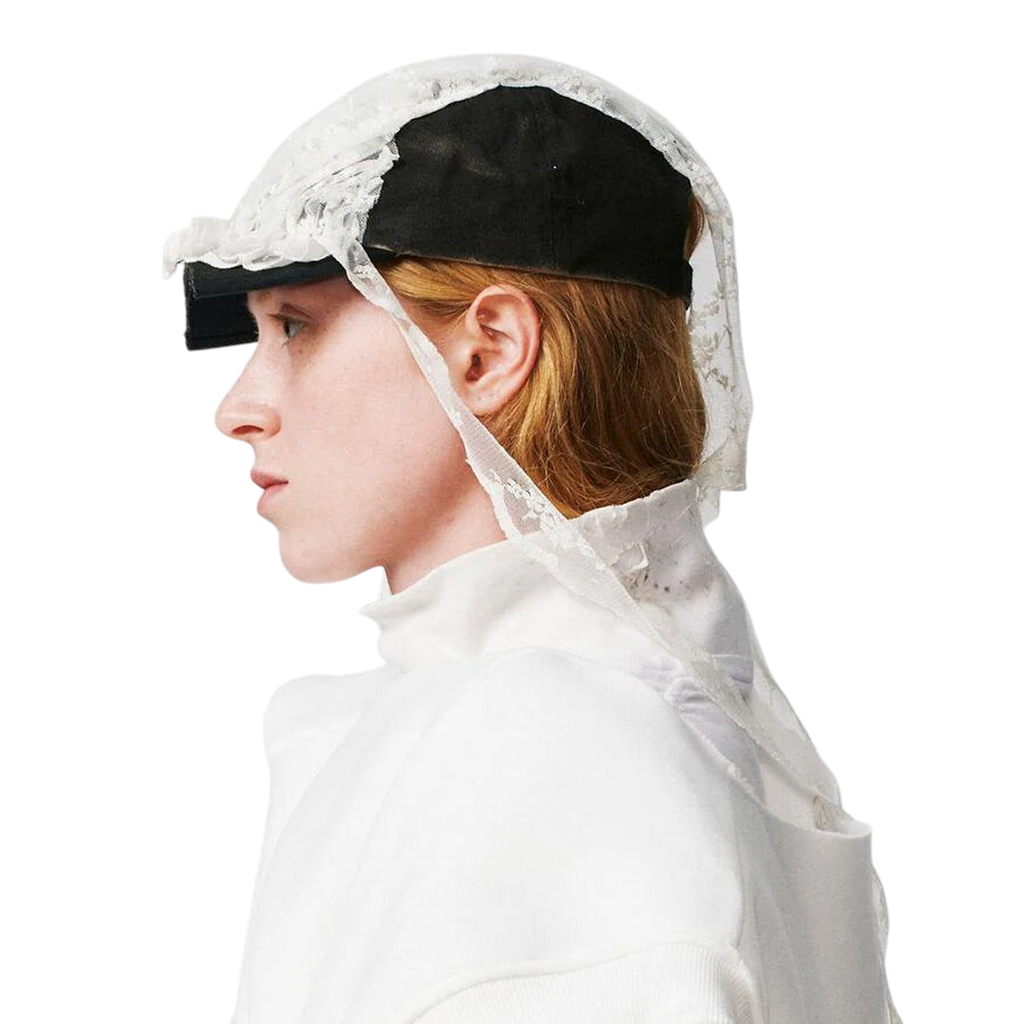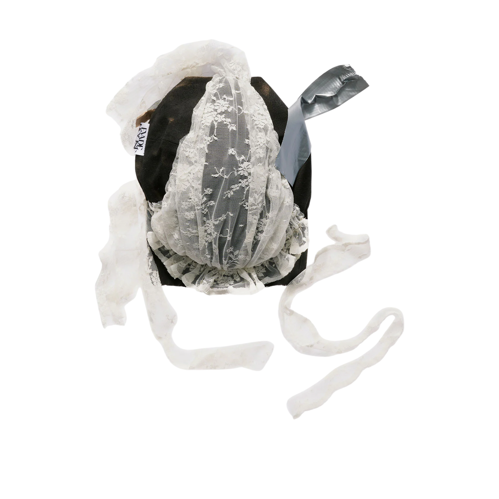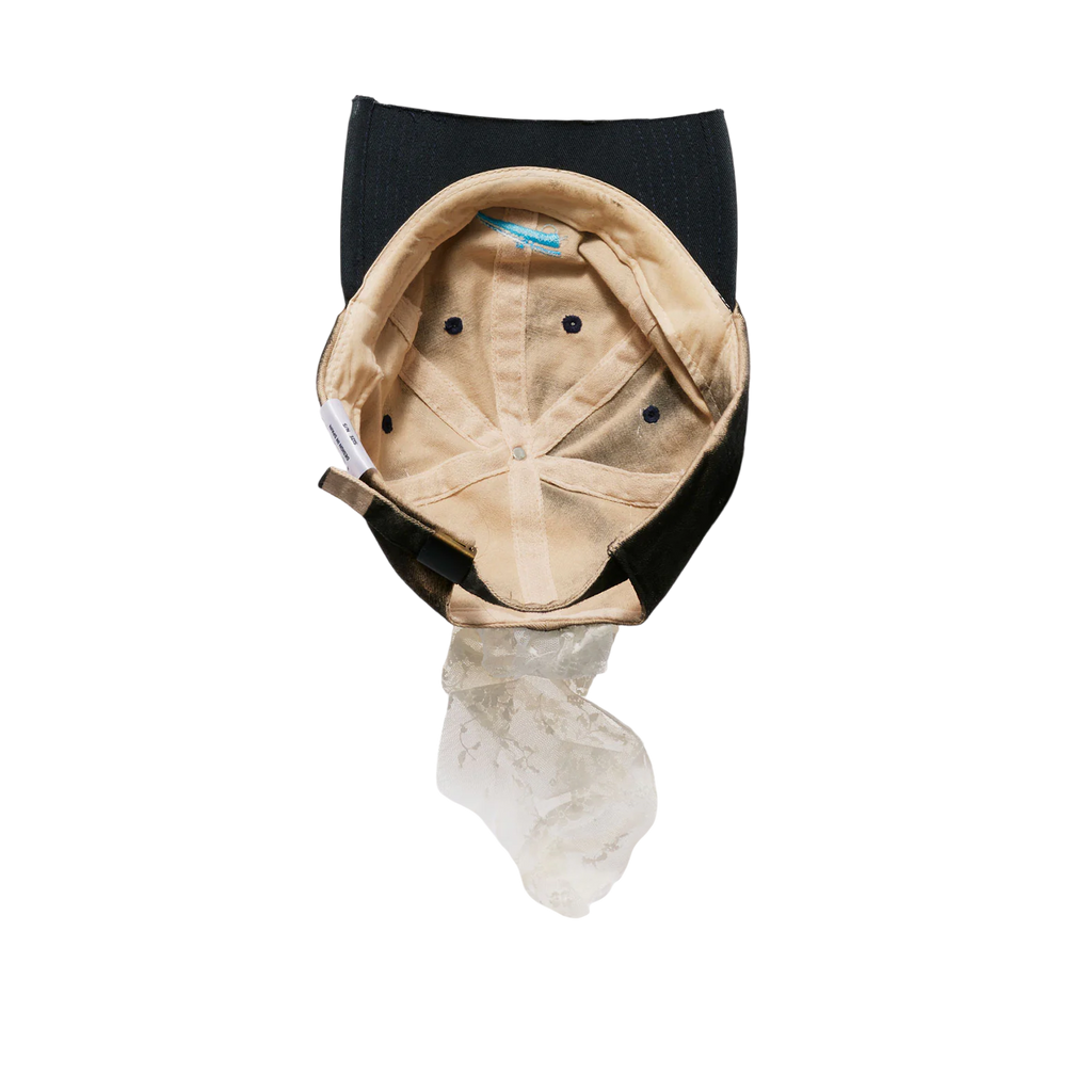 This cap is crafted from a black cap spray-dyed to achieve a textured finish. The visor has been carefully cut off, and deadstock fabric from our signature lace has been repurposed to adorn the crown with soft gathers. Tied lace ribbons extend from the design, allowing for an adjustable, personalized fit.