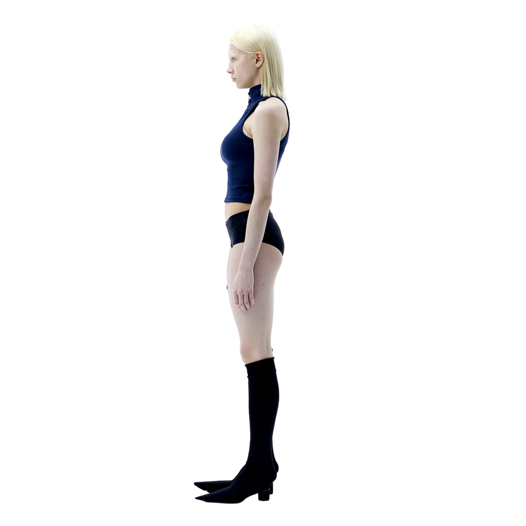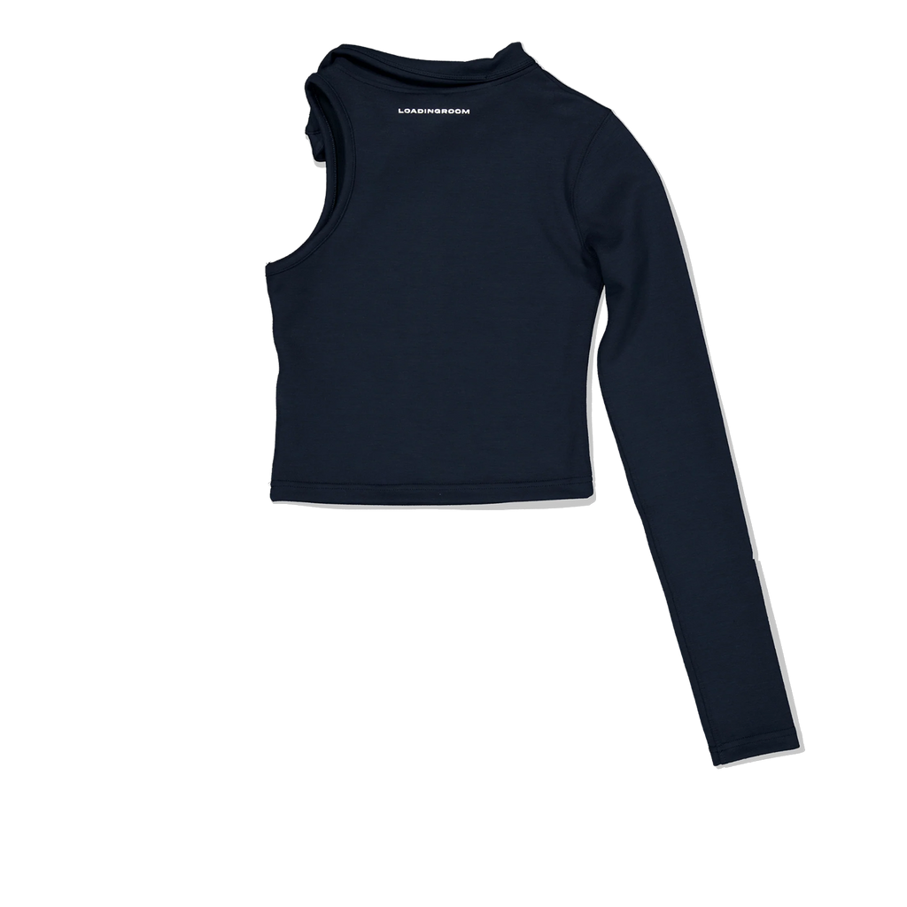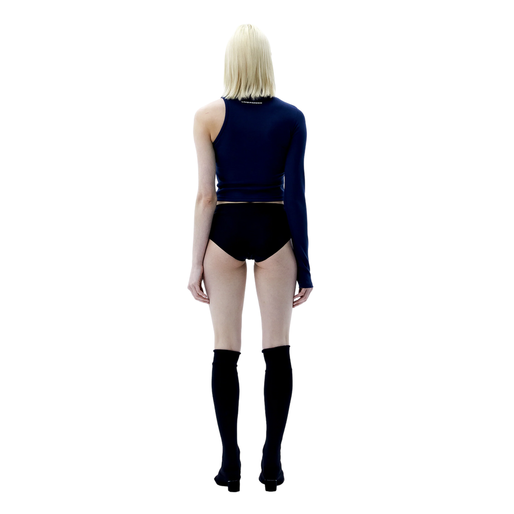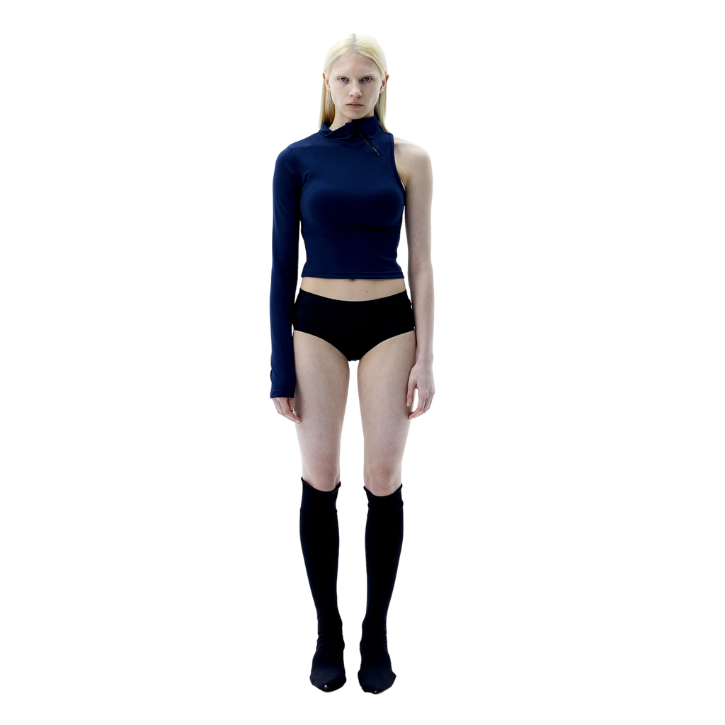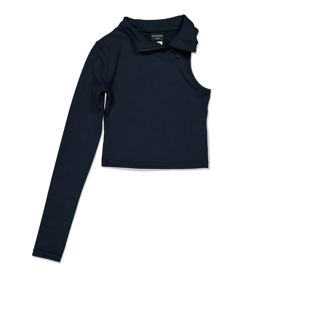 Made from Span Jersey, our top features a slim fit that flatters the figure. It includes a single long sleeve at the right side, adding a unique and asymmetrical touch. The front is designed with an asymmetric Metaluxe zipper for a modern look. A folded line detail at the right neck adds a subtle yet stylish element. The back is adorned with a logo print for added branding and style.