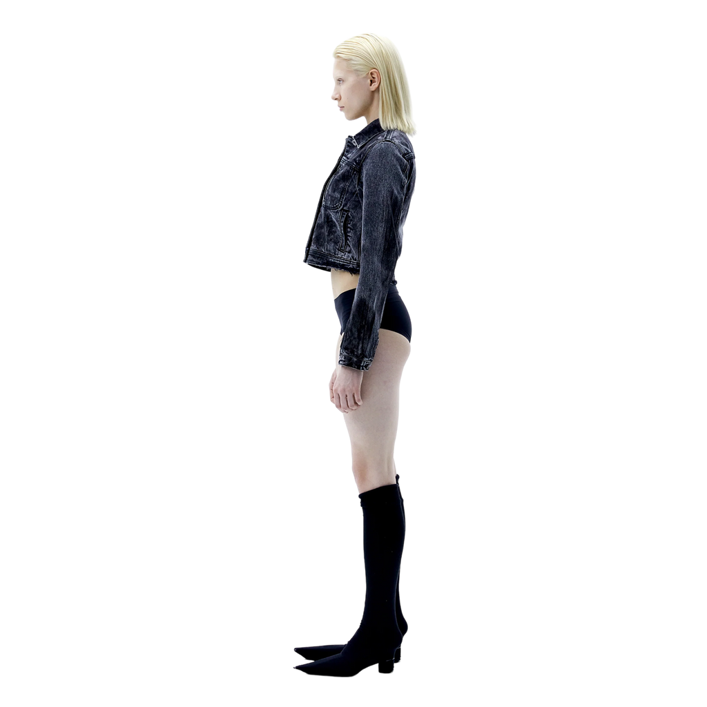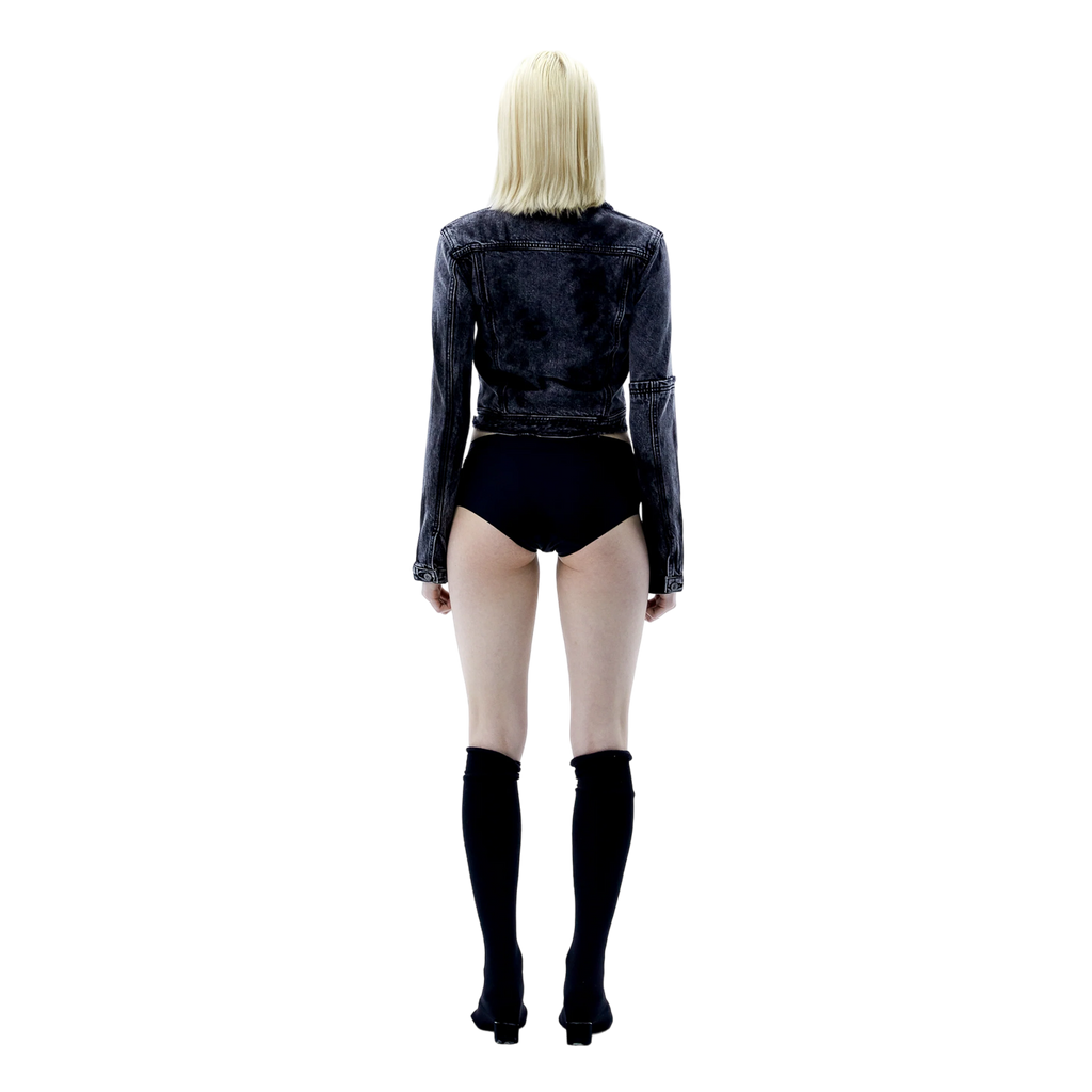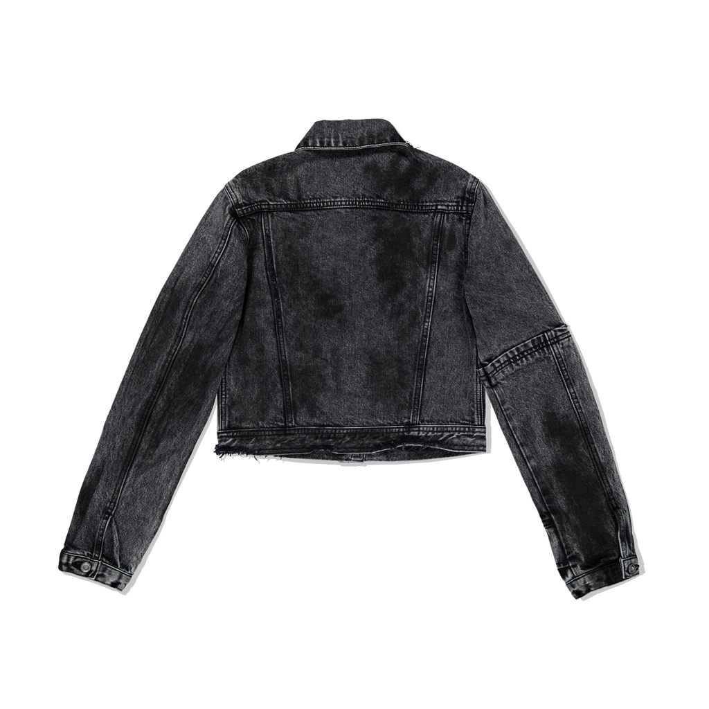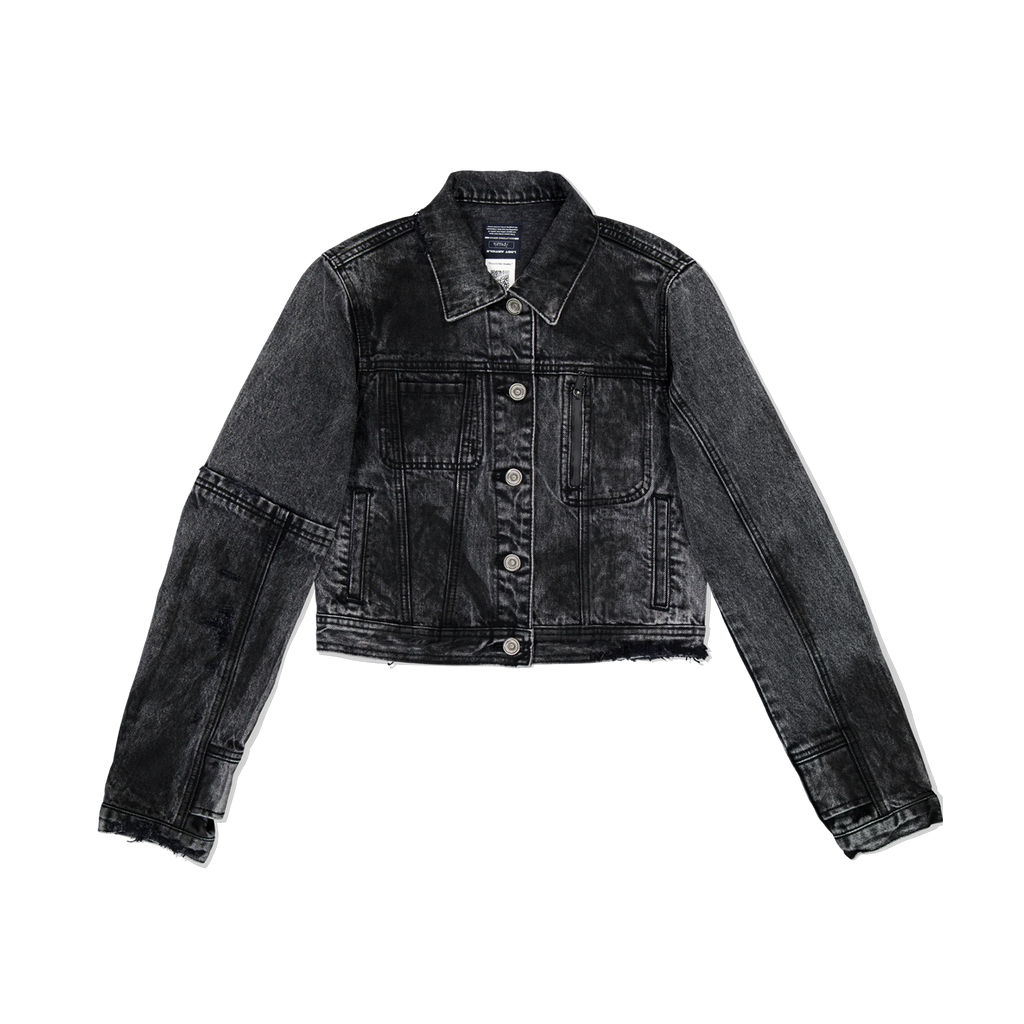 Crafted from premium black Japanese denim, our small-fit jacket features a sleek and flattering silhouette. It includes five buttons at the front for closure, adding a classic touch to the design. The jacket is designed with a waterproof zipper at the left chest for a modern and functional detail. Buttoned cuffs offer adjustable comfort, while the cropped length adds a contemporary edge. The jacket is finished with logo-engraved flex buttons and is adorned with a trendy dirty and damage effect, as well as a salt snow washing, for a unique and stylish look.