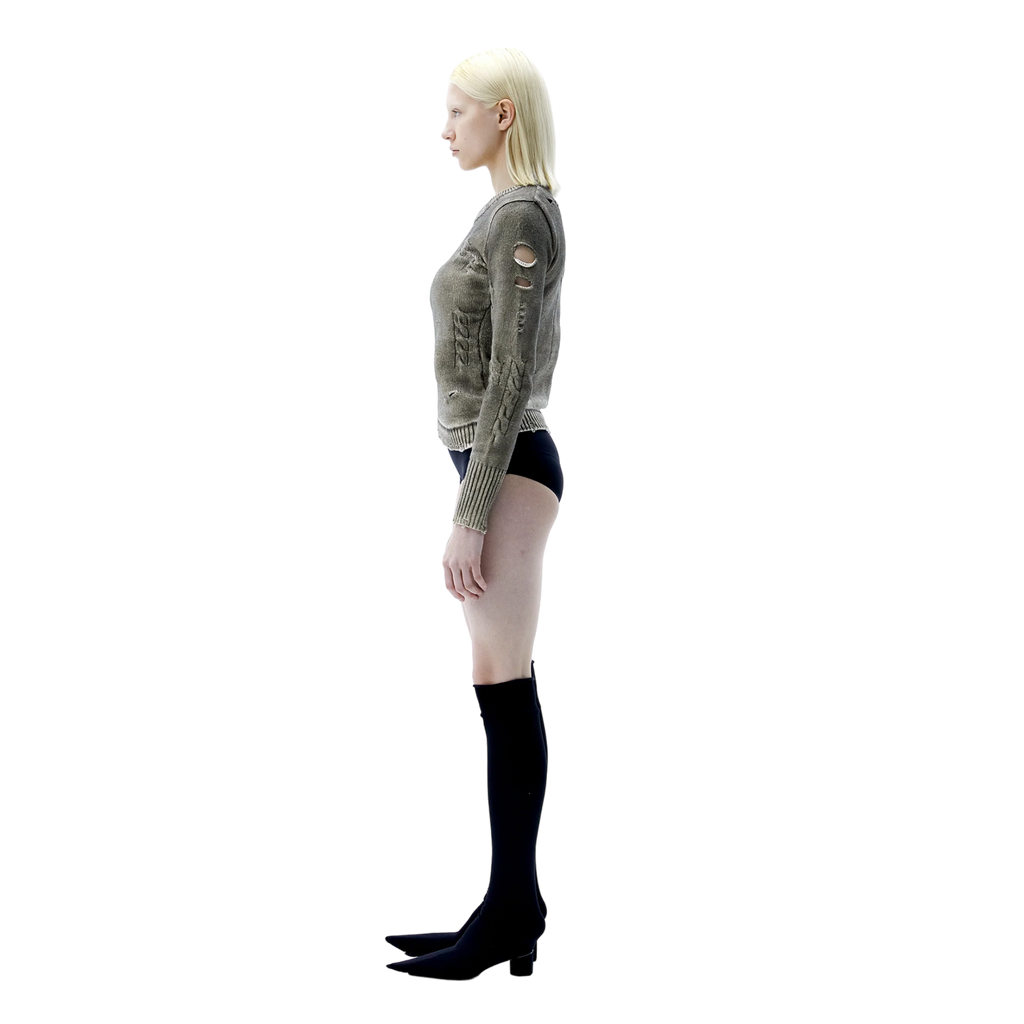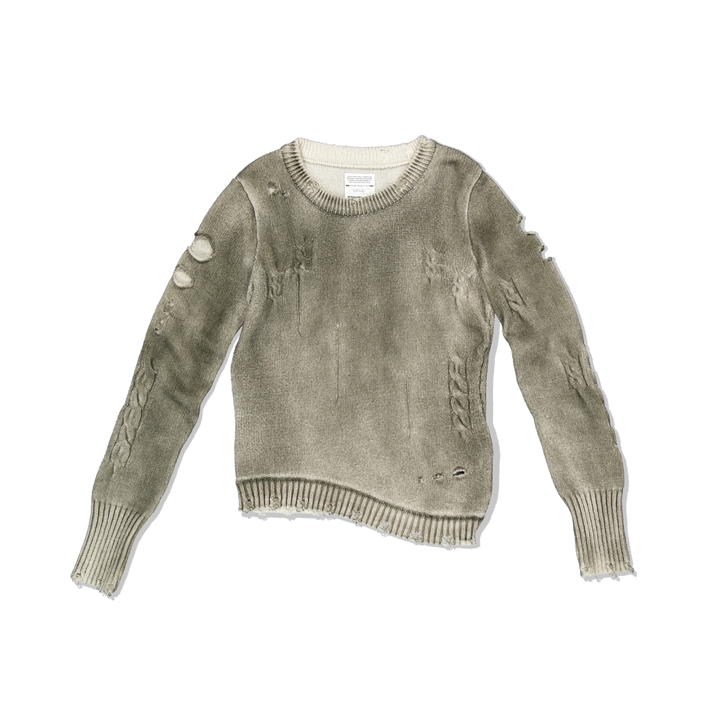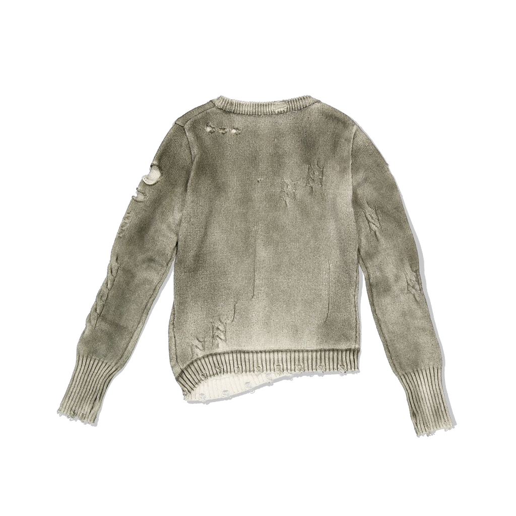 Crafted from soft cotton knit, our sweater offers a regular fit with a classic crew neck design. It features finger hole cuffs and ribbed finishing at the collar, cuffs, and bottom for a comfortable fit. The sweater showcases an irregular cable pattern for a unique and textured look. The sleeves are intentionally unbalanced for added interest. Additionally, the sweater includes worn-out effect holes and a washed-out effect for a trendy, distressed appearance.