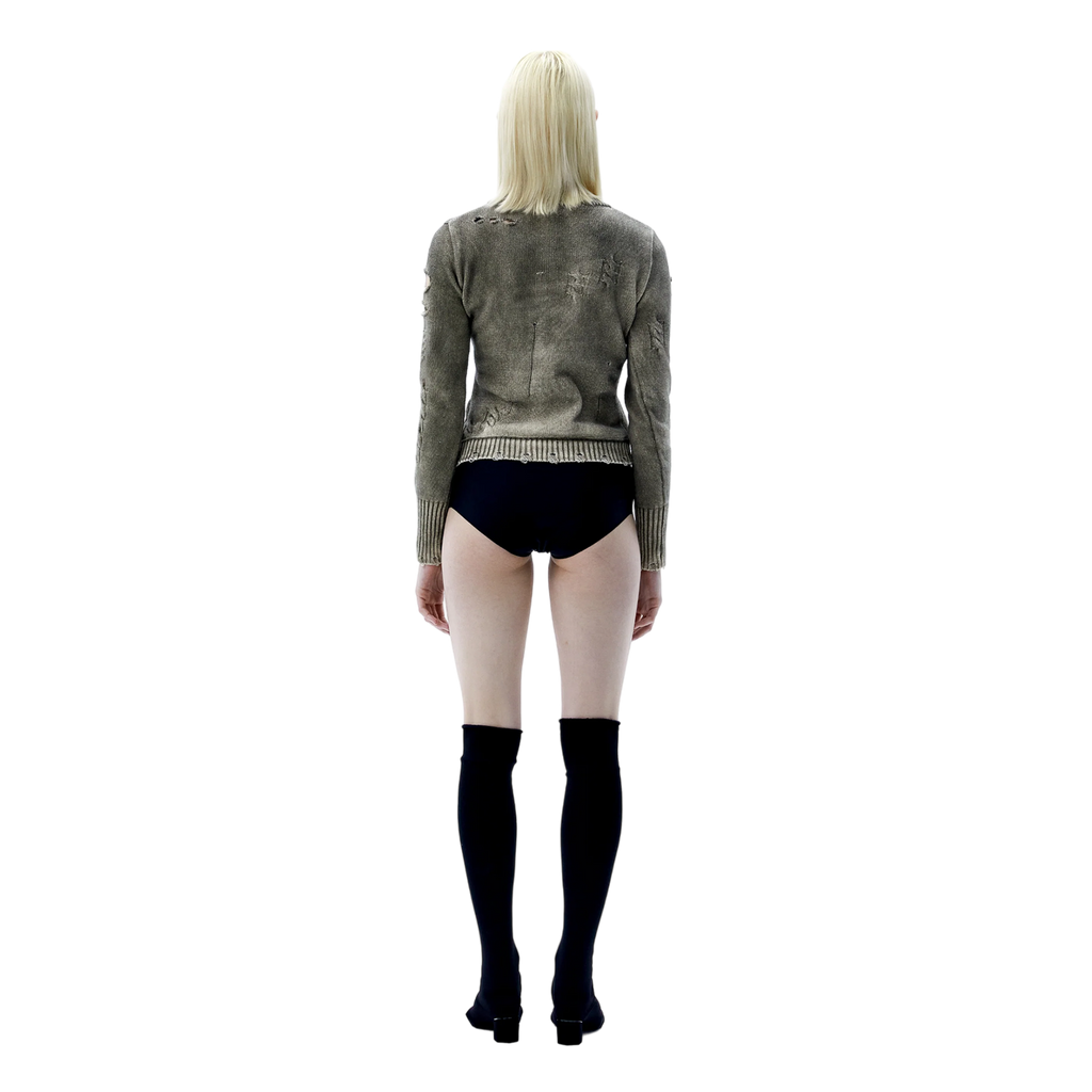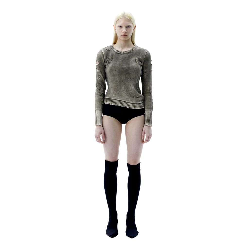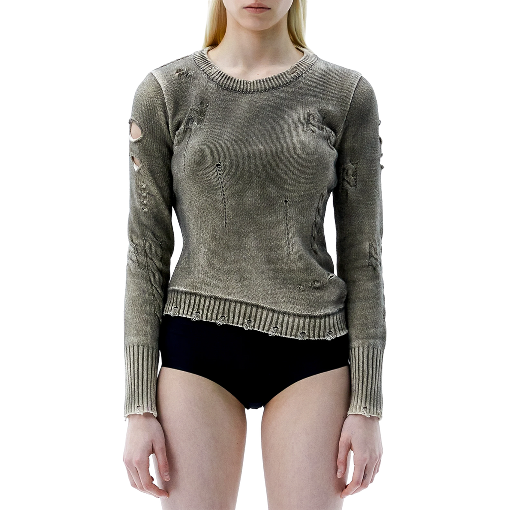 Crafted from soft cotton knit, our sweater offers a regular fit with a classic crew neck design. It features finger hole cuffs and ribbed finishing at the collar, cuffs, and bottom for a comfortable fit. The sweater showcases an irregular cable pattern for a unique and textured look. The sleeves are intentionally unbalanced for added interest. Additionally, the sweater includes worn-out effect holes and a washed-out effect for a trendy, distressed appearance.