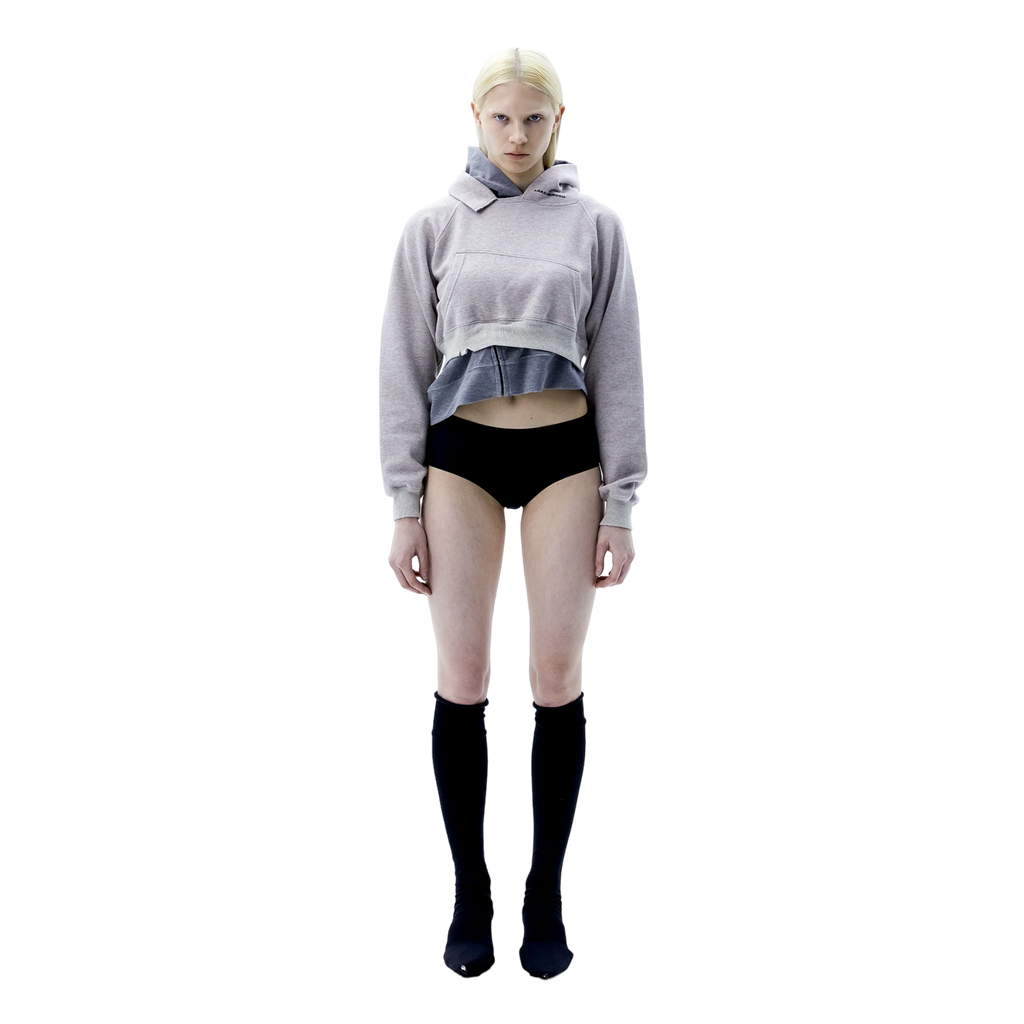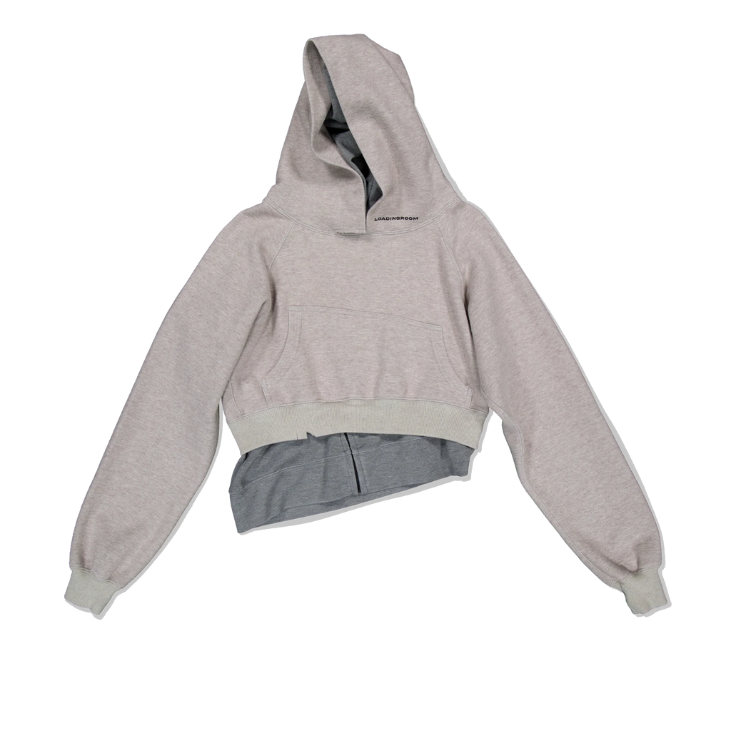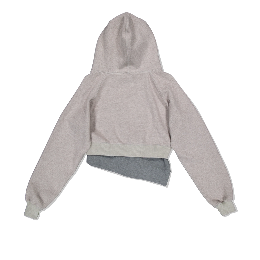 This hoodie combines two different materials for a unique look and feel. It offers a medium fit and features hoods without drawstrings for a sleek appearance. The hoodie includes an asymmetric zipper on the inside layer, adding a modern touch to the design. It is mineral washed for a soft, worn-in feel. The left neck is adorned with a logo print for subtle branding. The hoodie also features an unbalanced front pocket, adding a dynamic element to the overall look.