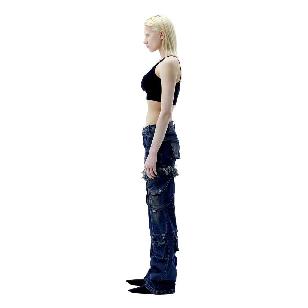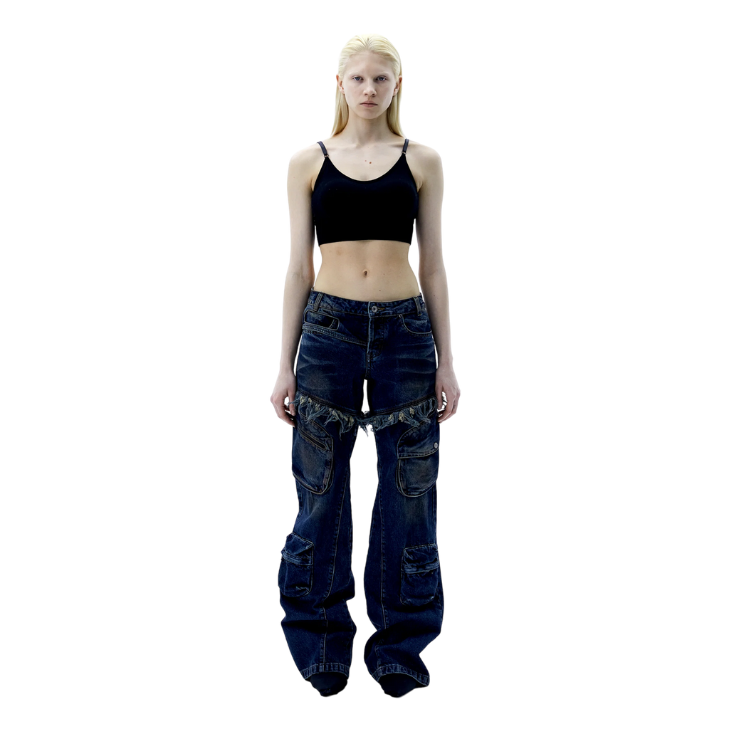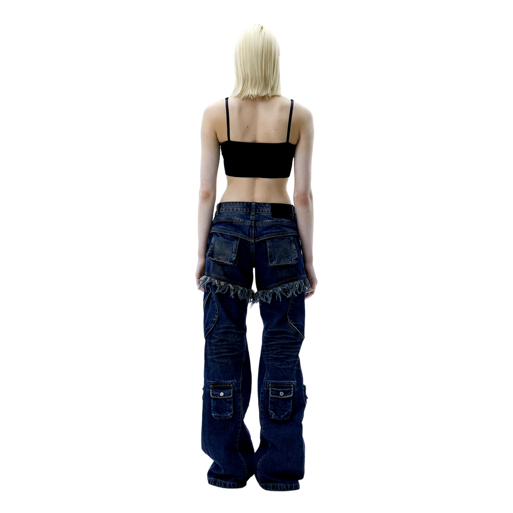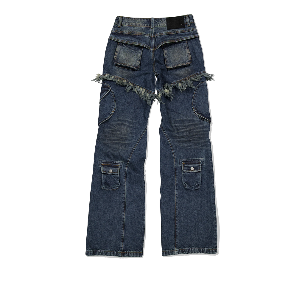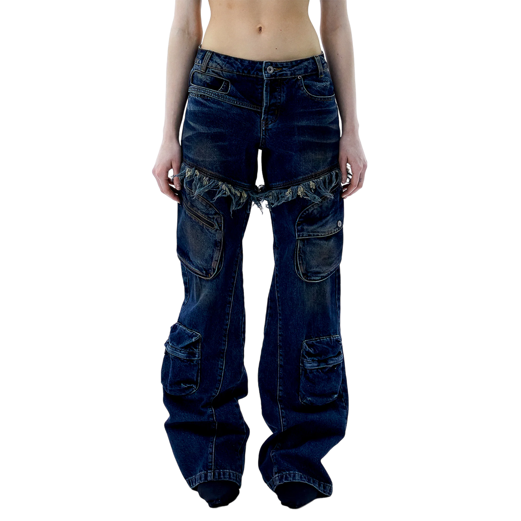 Crafted from high-quality blue Japanese denim, our mid-waist jeans feature logo-engraved flex buttons and a logo inlaid suede patch at the back for a touch of luxury. They are designed with one covered flap at the front pocket, one patch pocket with a water-resistant zip, and one patch pocket with snap buttons at the front. Additionally, there are two patch pockets with Metaluxe zips at the front, two cargo pockets at the back, and two patch pockets with snap buttons at the back. The jeans are finished with a trendy destroyed effect and flared hem for a stylish look.