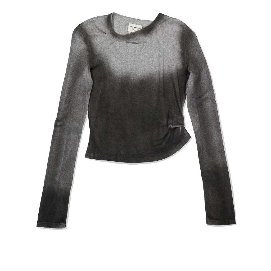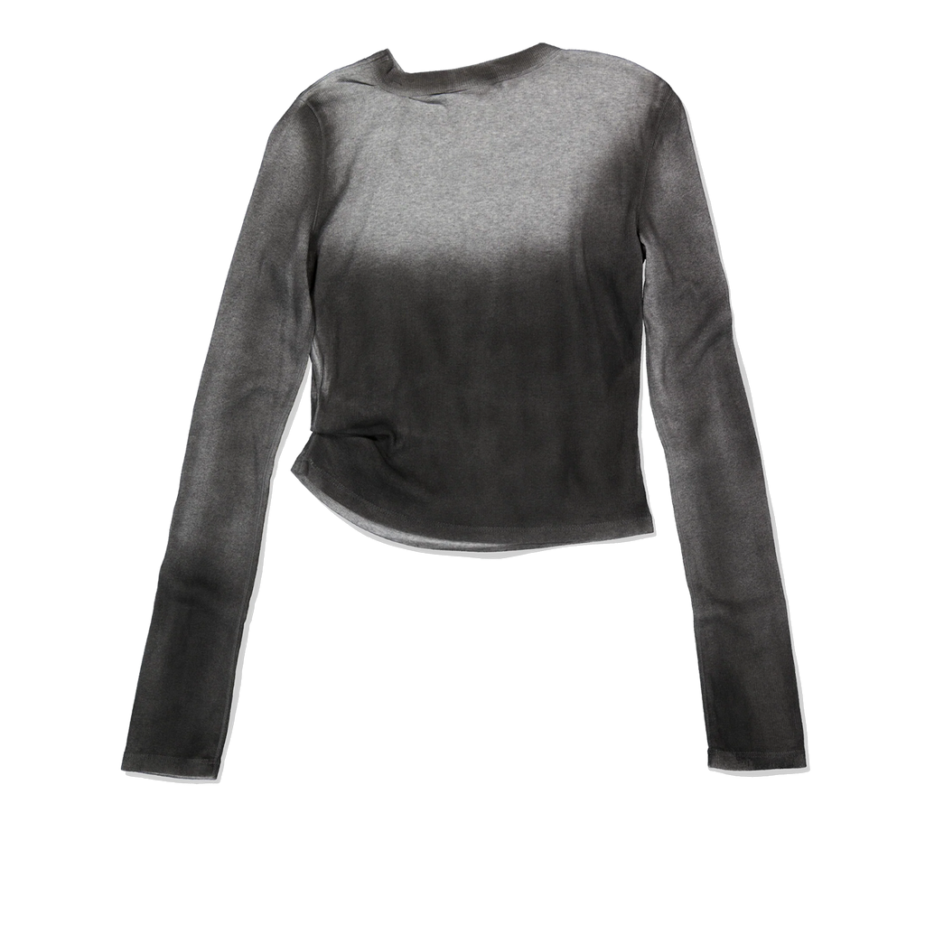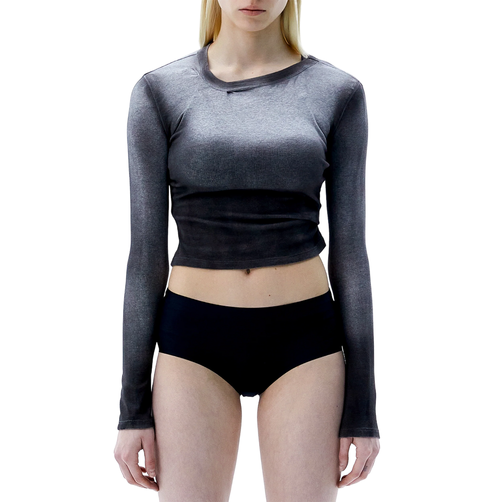 Crafted from rib jersey, our top features long sleeves for a classic look. It is designed with a trendy dirty spray effect, adding a touch of edginess to the style. The top includes folded lines at the front and back neck, as well as the left waist, for added texture and detail.