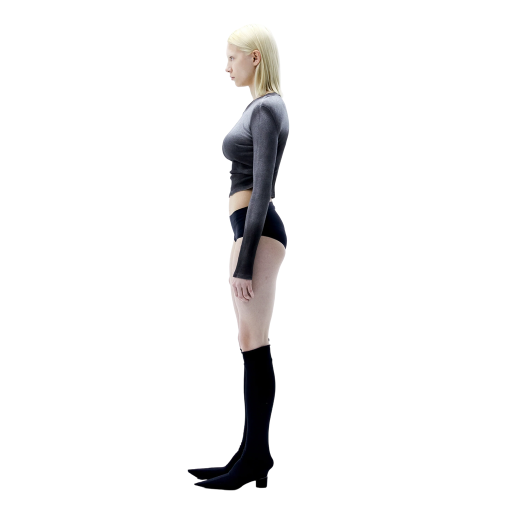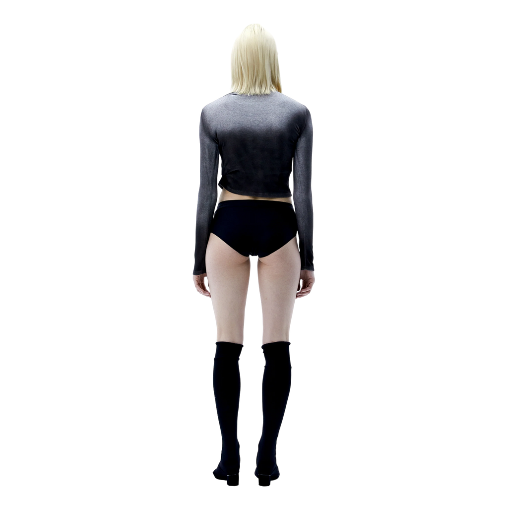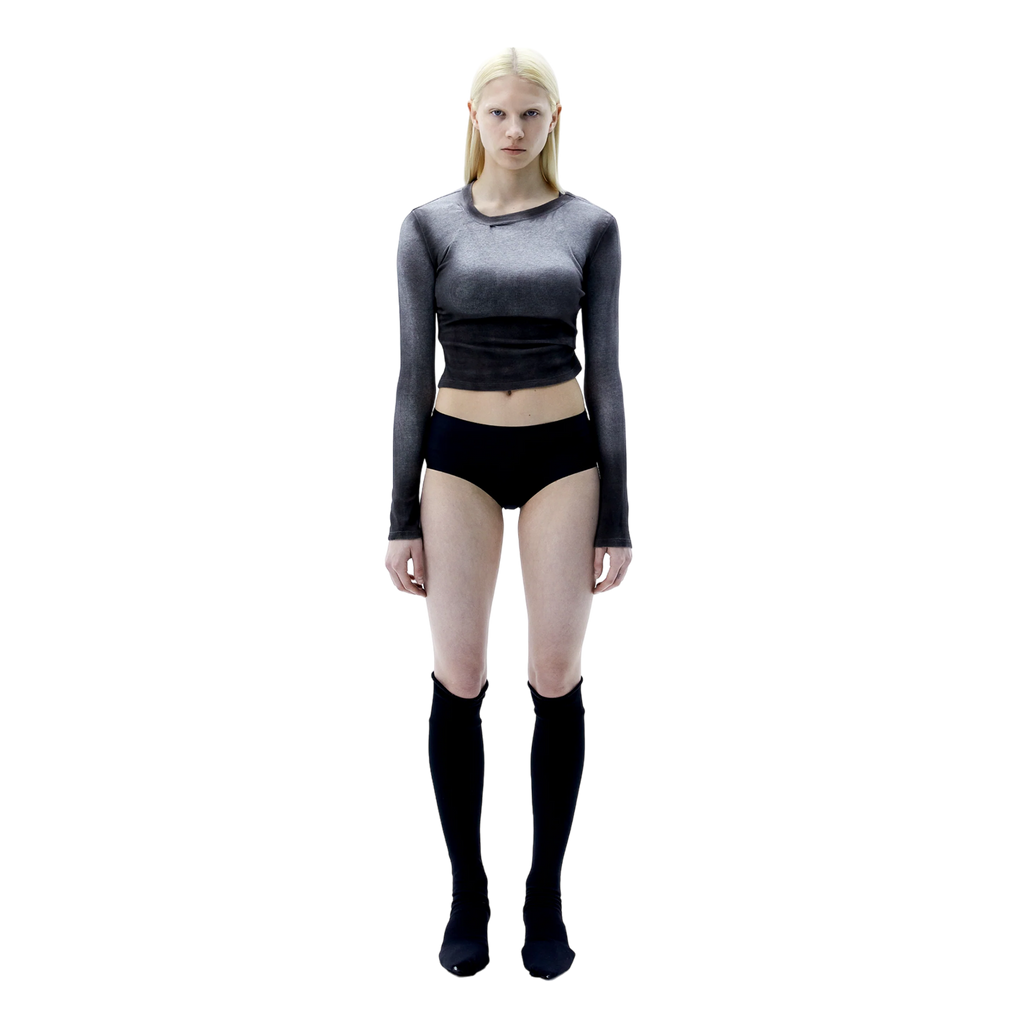 Crafted from rib jersey, our top features long sleeves for a classic look. It is designed with a trendy dirty spray effect, adding a touch of edginess to the style. The top includes folded lines at the front and back neck, as well as the left waist, for added texture and detail.