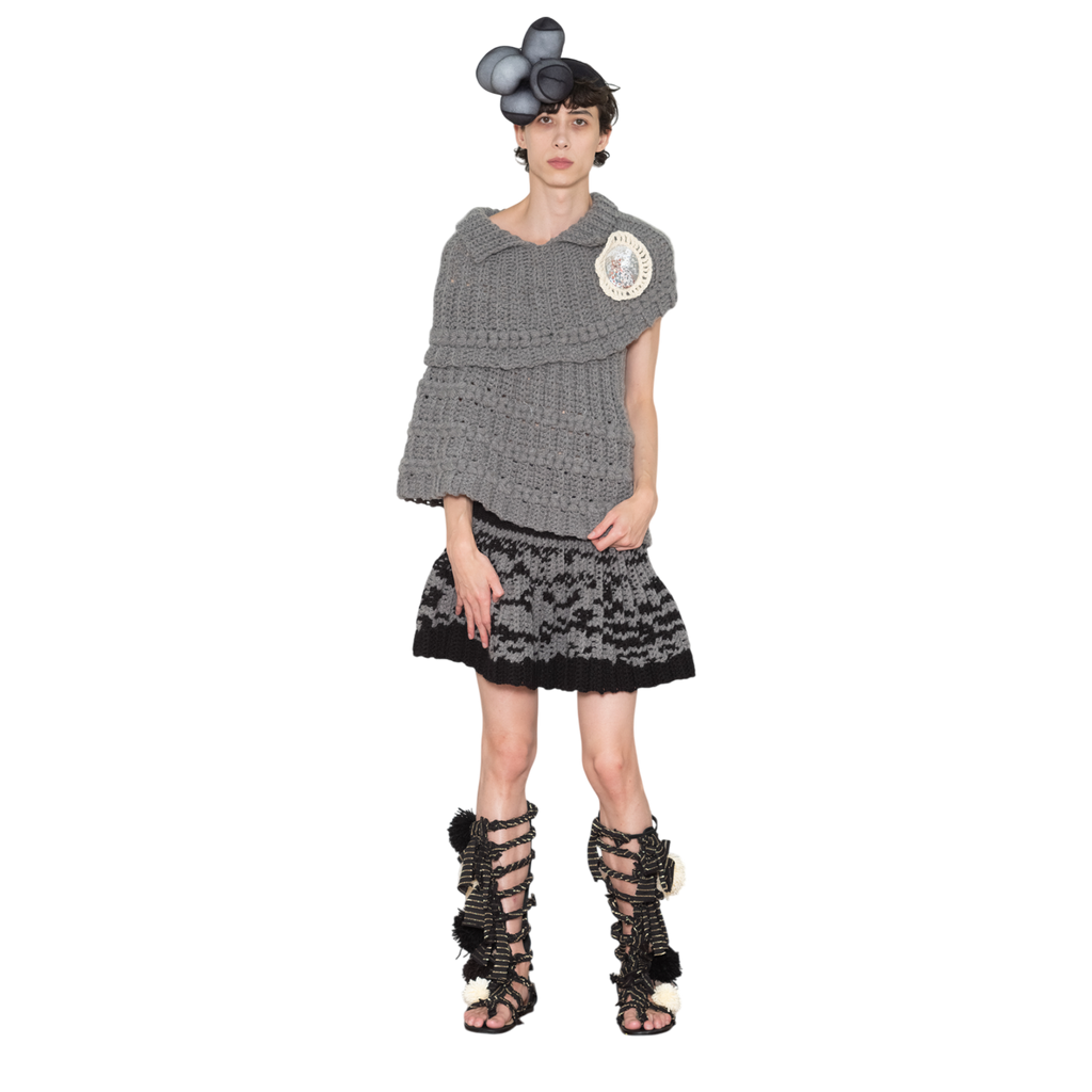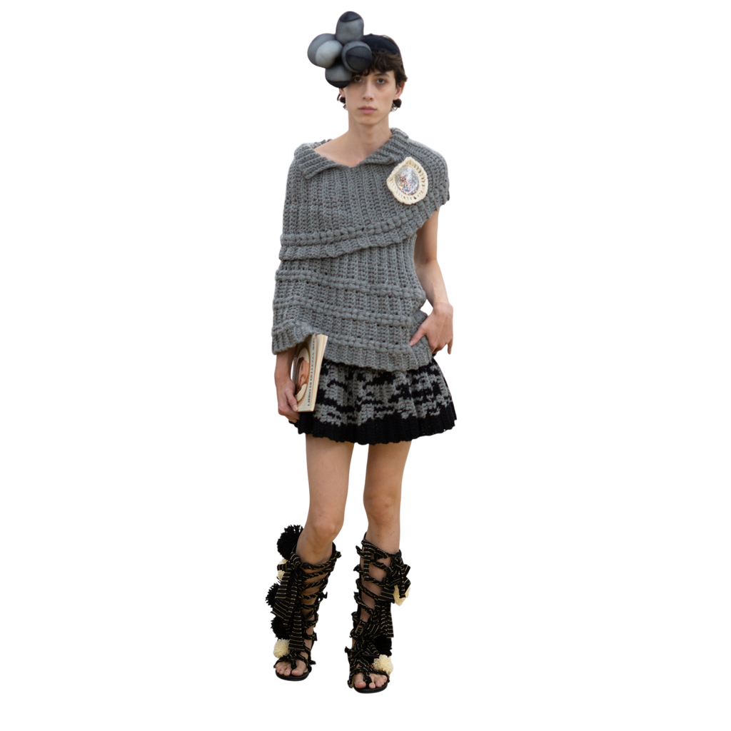 Lewis is a Paris-based French designer specializing in crochet, a technique he likens to "drawing clothes." Embracing spontaneity, he allows the creation process to guide him, resulting in playful and unique pieces. Inspired by the uncanny facets of personality, the transition from adolescence to adulthood, and our connection to the domestic, his recent collection, La Coiffeuse, explored the intimate world of dressing tables and their contents.