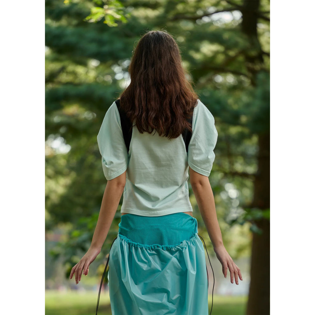 What happens when city girls go camping - not prepared, not practical, but stepping into an uncanny dream? They don’t pack and the backpack dissolves into graphic straps on shirts. Mint cotton t-shirts with FAERIE print and black wool rib band armhole.