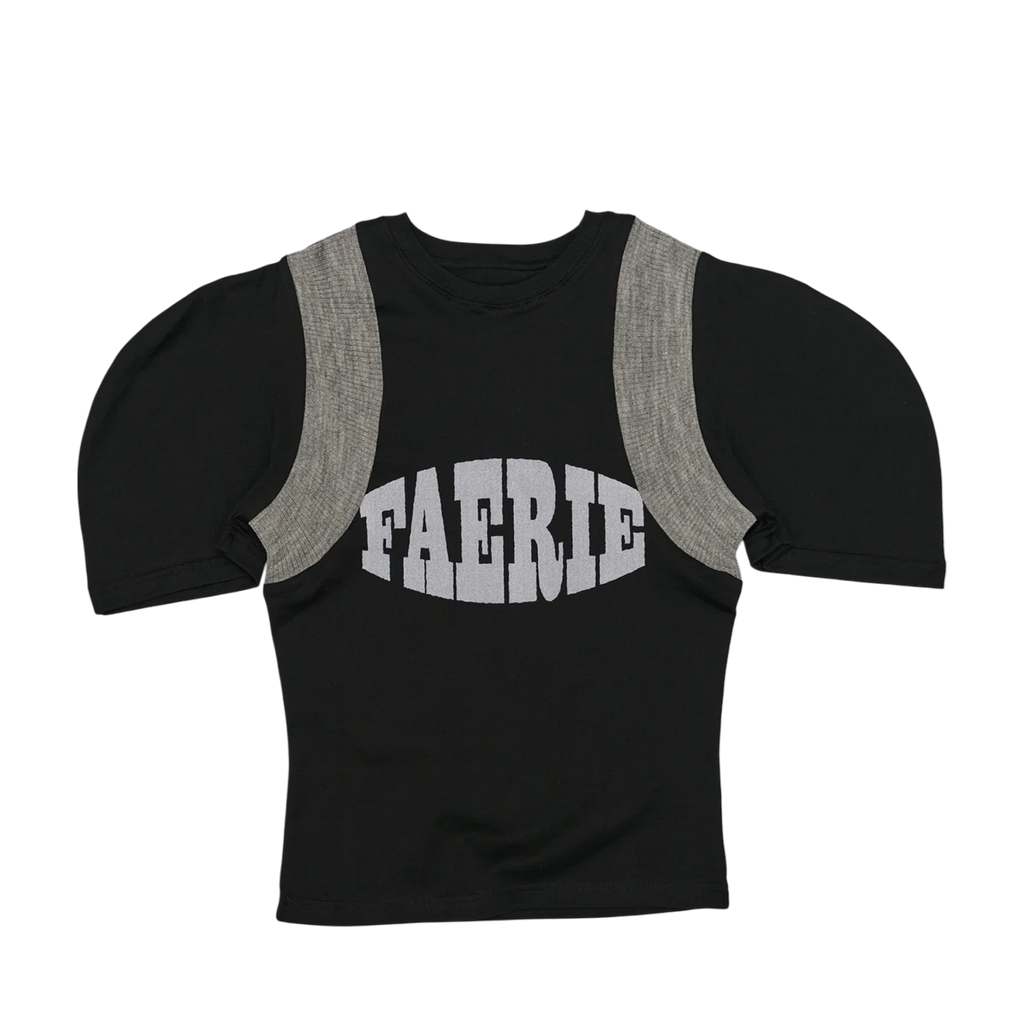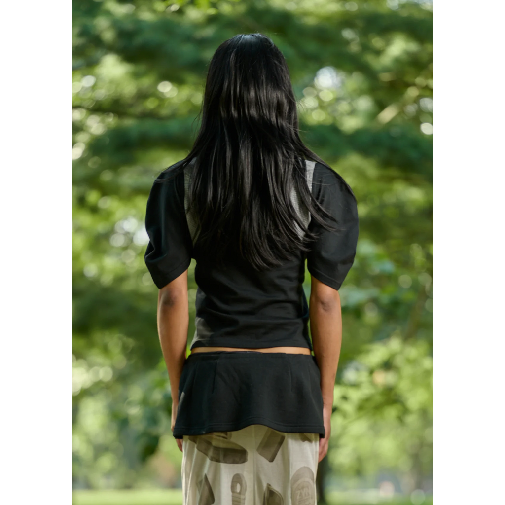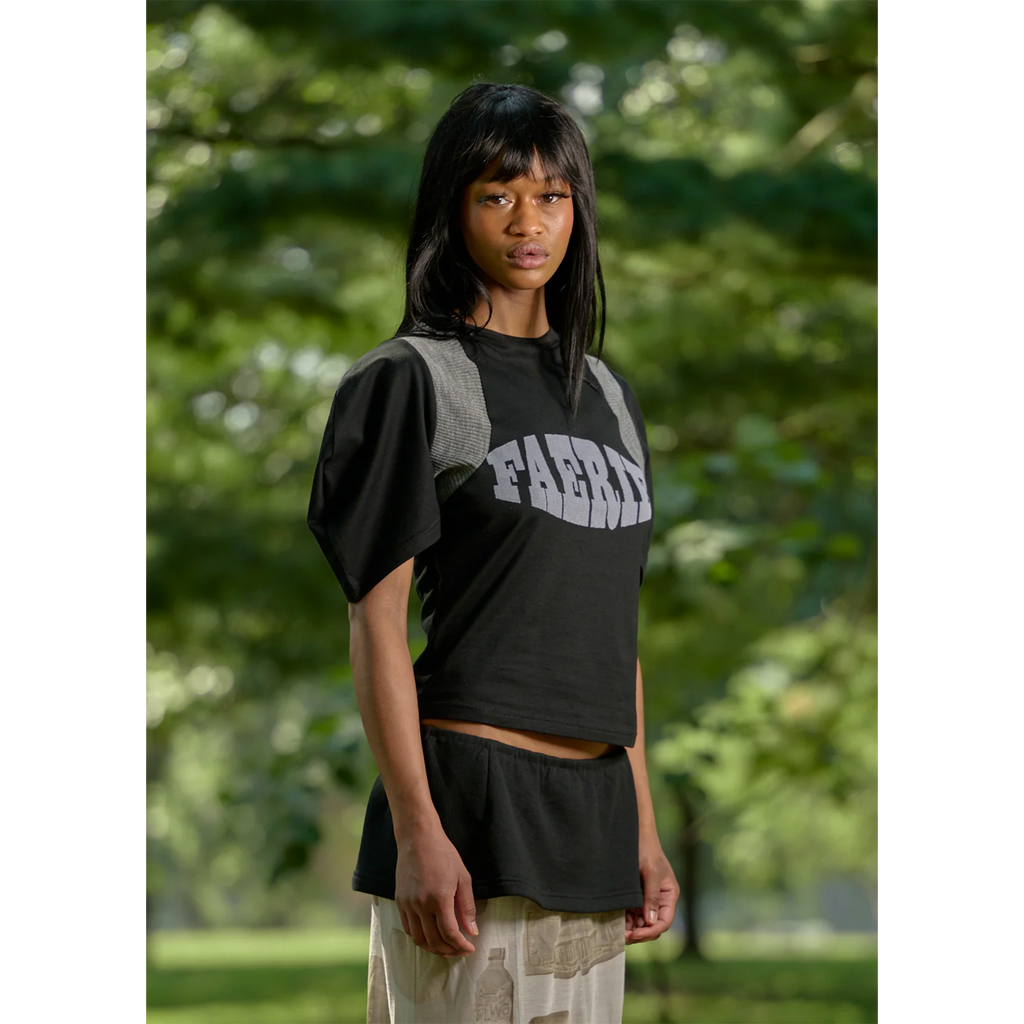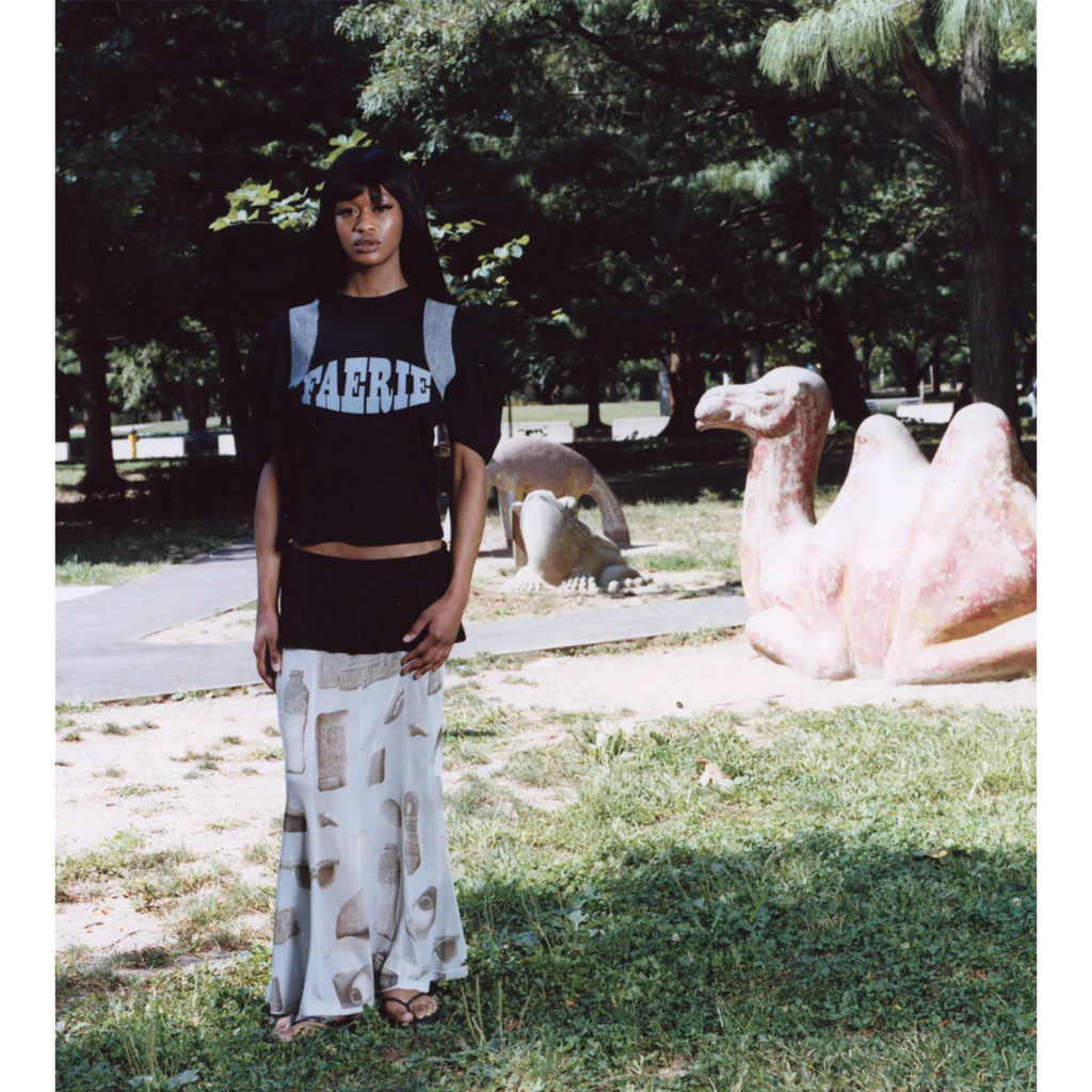 What happens when city girls go camping - not prepared, not practical, but stepping into an uncanny dream? They don’t pack and the backpack dissolves into graphic straps on shirts. Mint cotton t-shirts with MERMAID print and black wool rib band armhole.