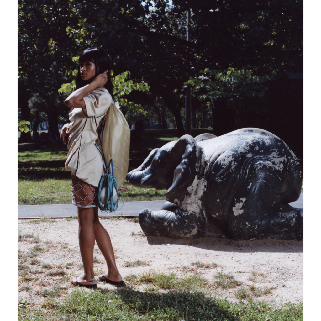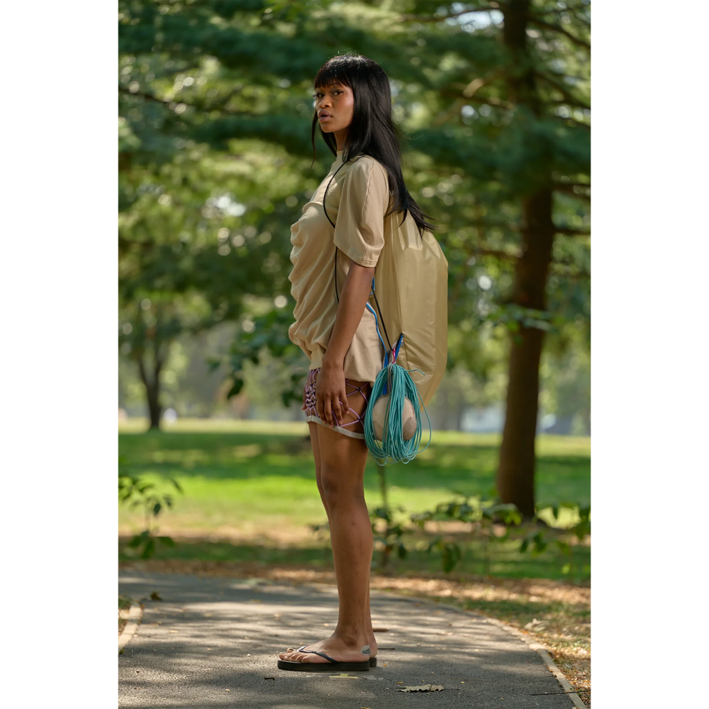 What happens when city girls go camping - not prepared, not practical, but stepping into an uncanny dream? They don’t pack and the backpack dissolves into graphic straps on shirts. Cottont-shirt dress with draped front and wool rib band armhole.