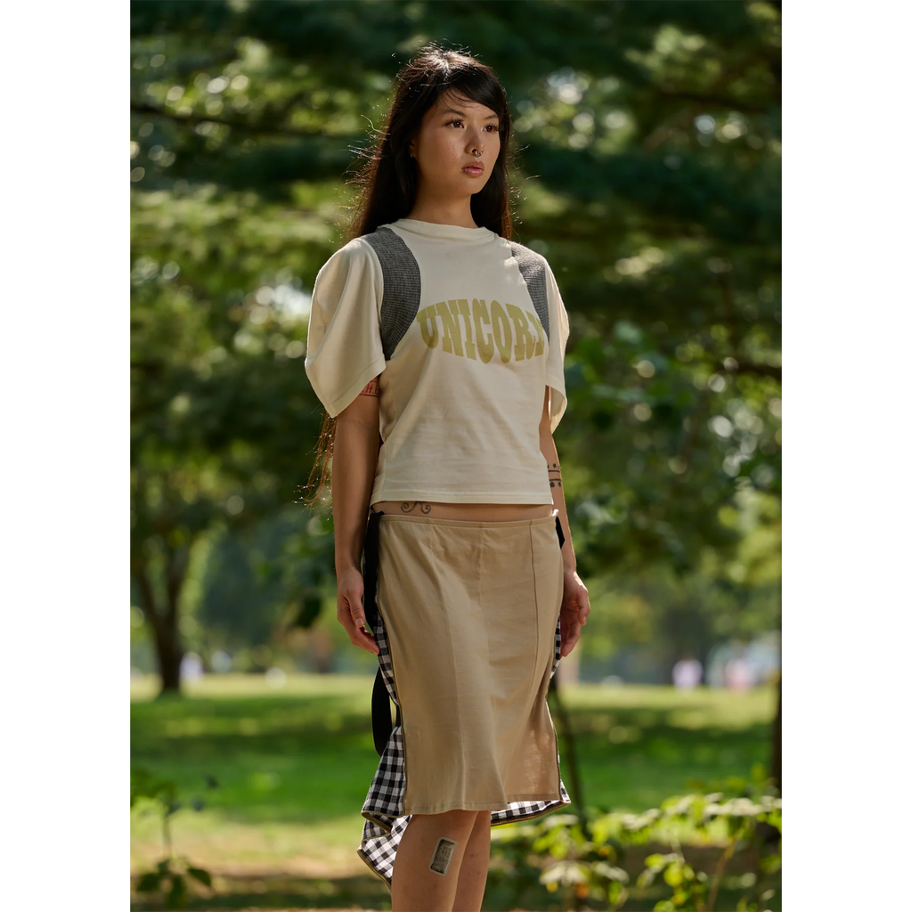 What happens when city girls go camping - not prepared, not practical, but stepping into an uncanny dream? They don’t pack and the backpack dissolves into graphic straps on shirts. Mint cotton t-shirts with UNICORN print and black wool rib band armhole.