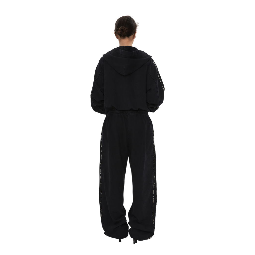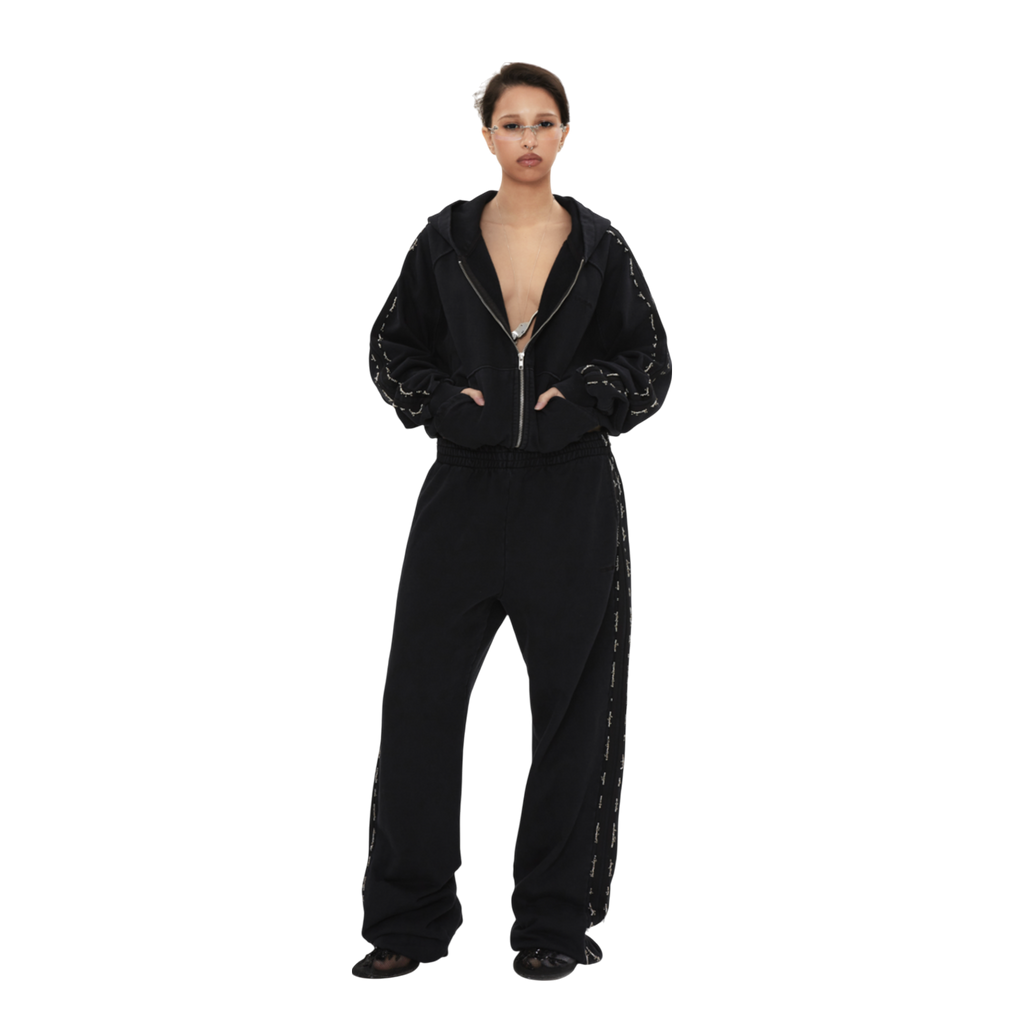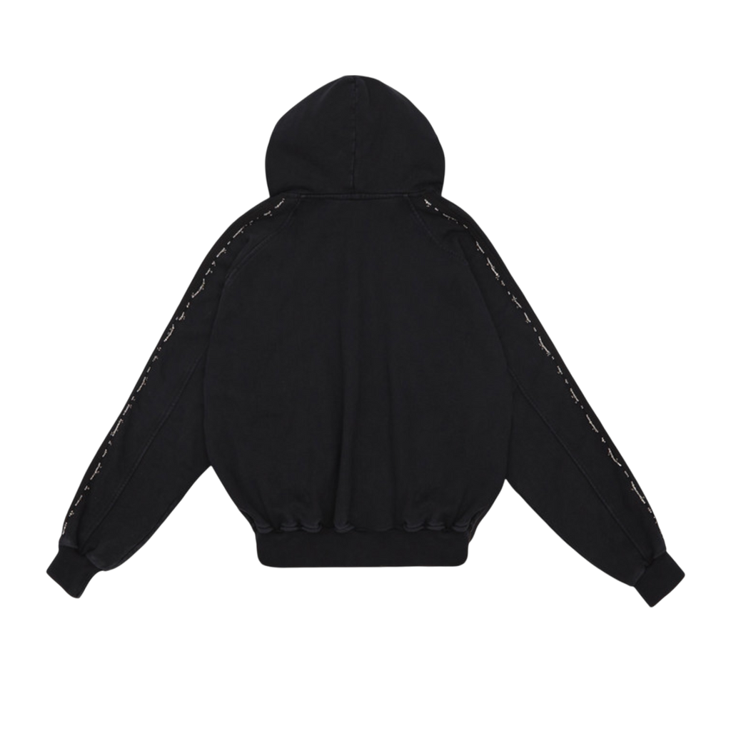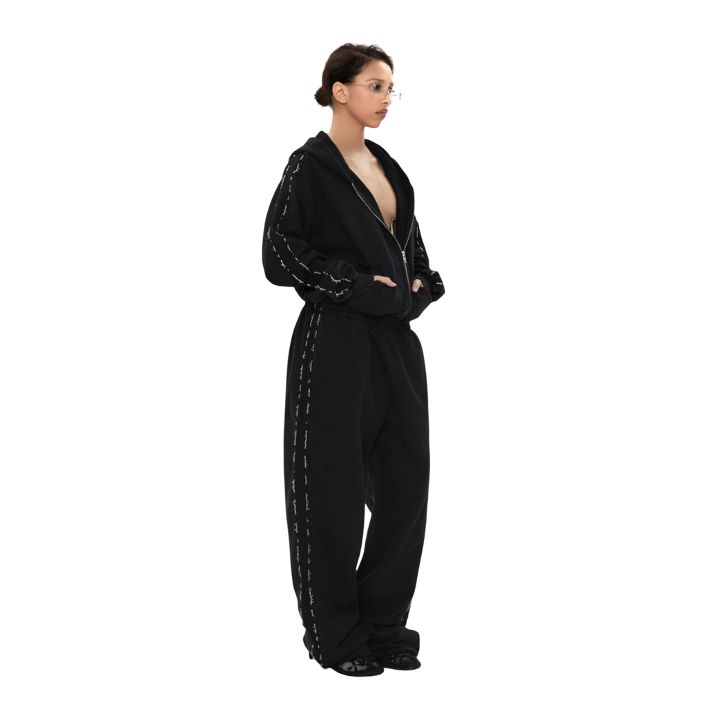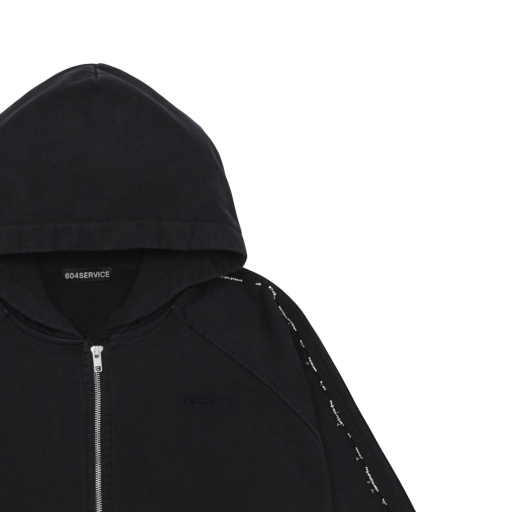 This unisex zip hoodie is crafted from heavy brushed vintage jersey, featuring a track-inspired design with an overdyed light grey washed-out effect. Made in 604Service, the hoodie is adorned with irregular-shaped zinc charms that are randomly beaded and hand-sewn for a unique, artisanal touch.