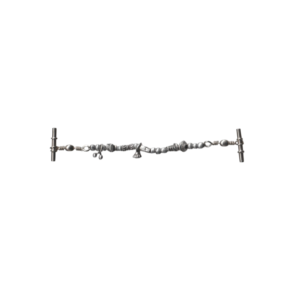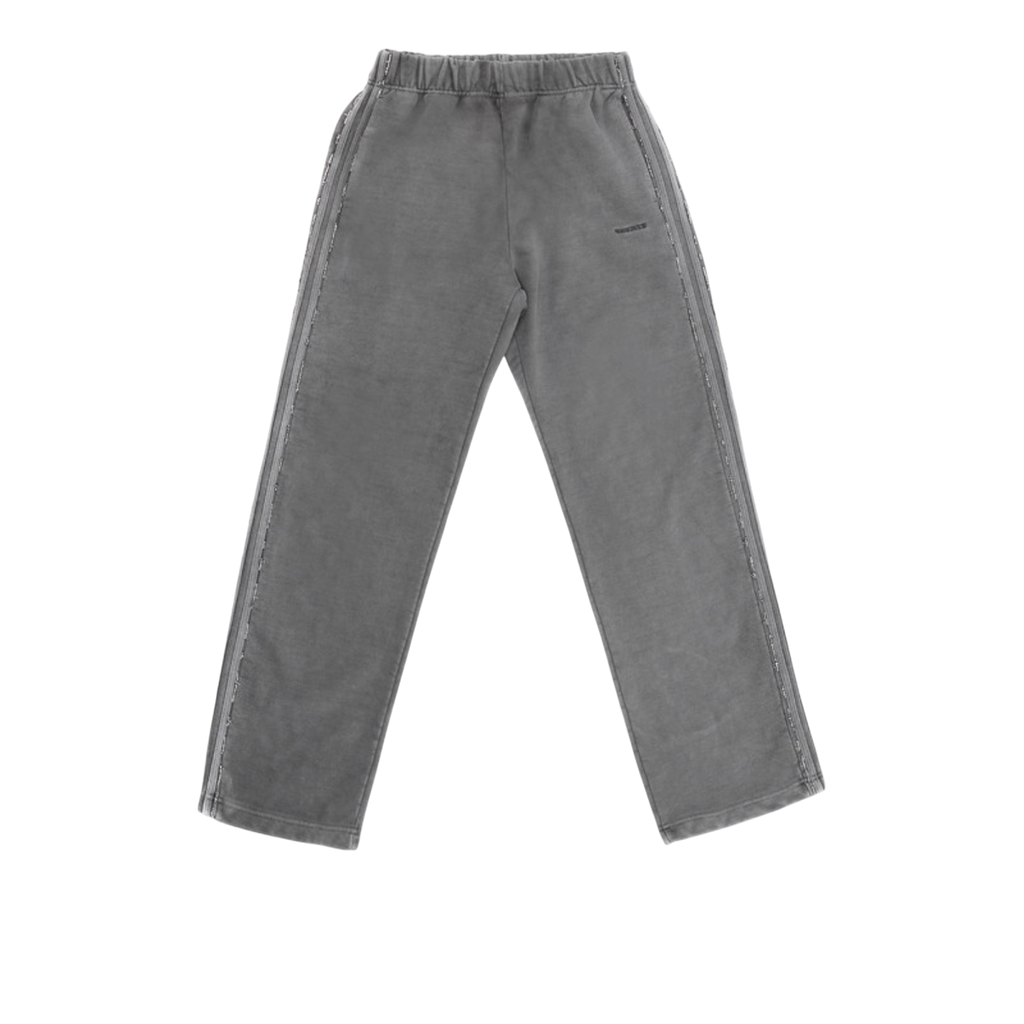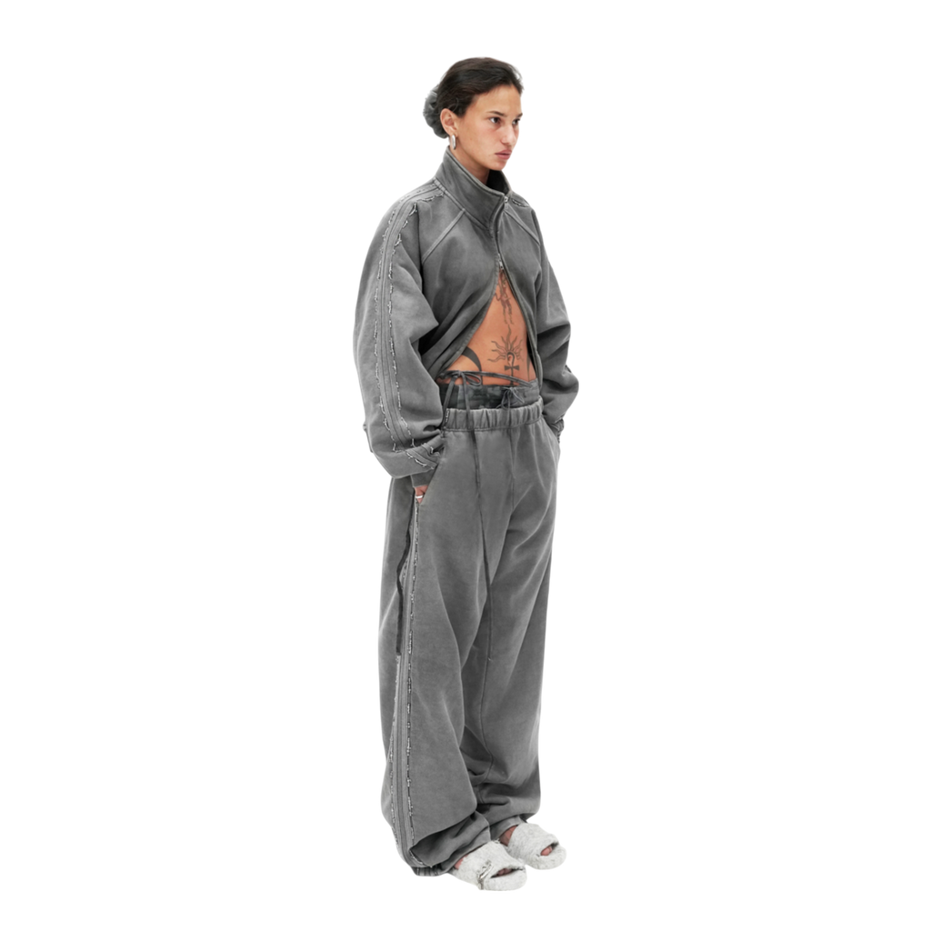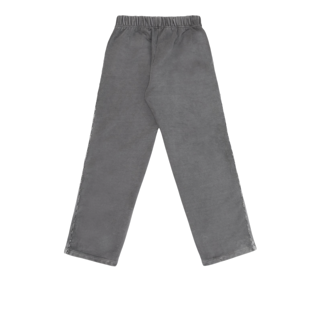 These unisex sweatpants feature a wide-leg silhouette crafted from heavy brushed vintage jersey. Finished with an overdyed light grey wash, the pants have a washed-out effect for a distinct, worn-in look. Made in 604Service, the sweatpants are decorated with irregular-shaped zinc charms that are randomly beaded and hand-sewn for an artisanal touch.