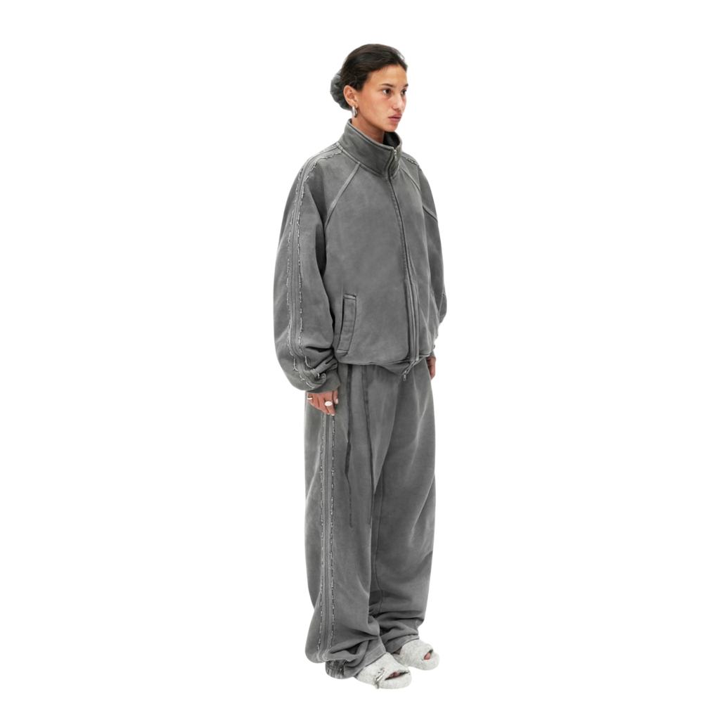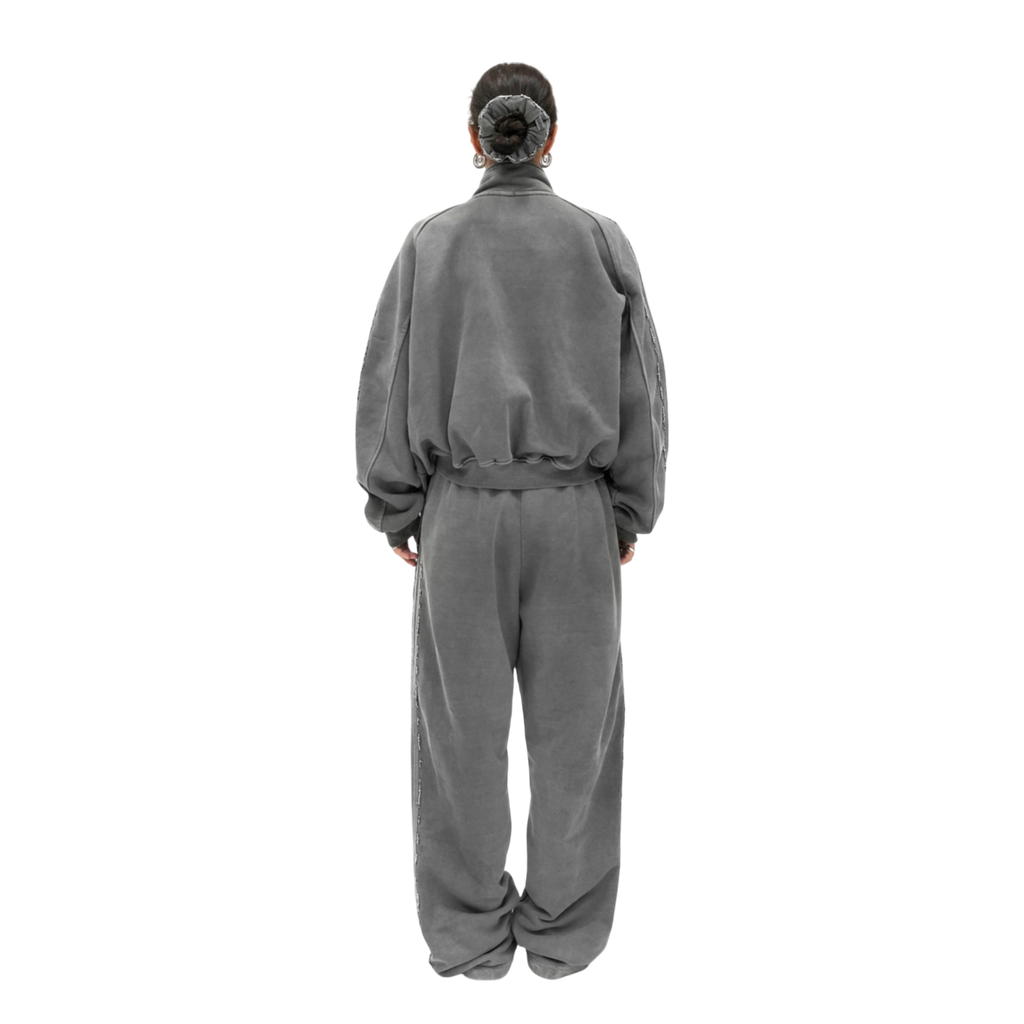Styled with the matching beaded track jacket and beaded hair scrunchie in pigment light grey for a cohesive look.
