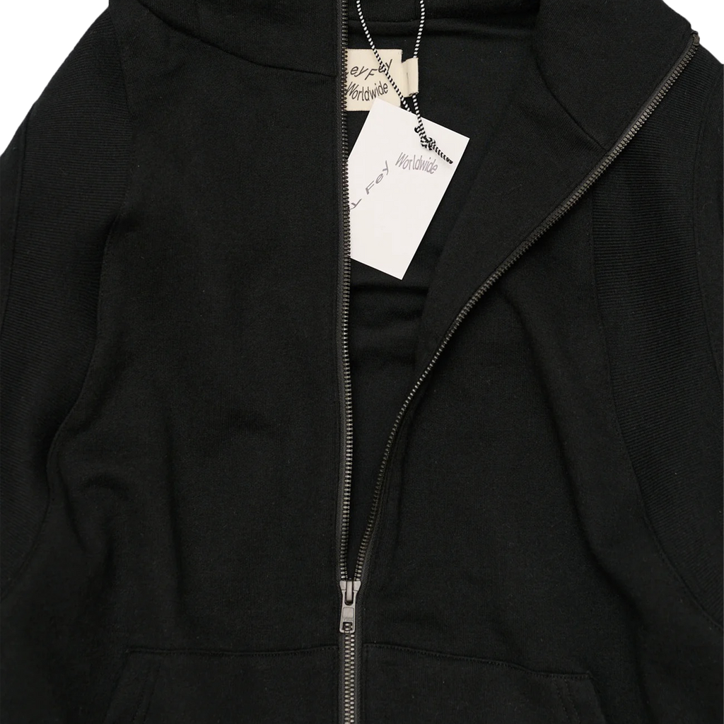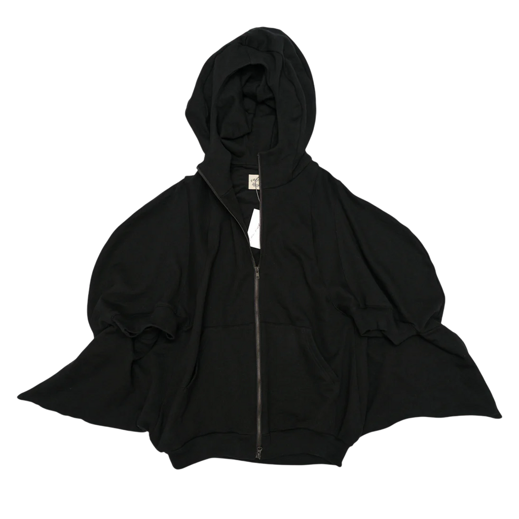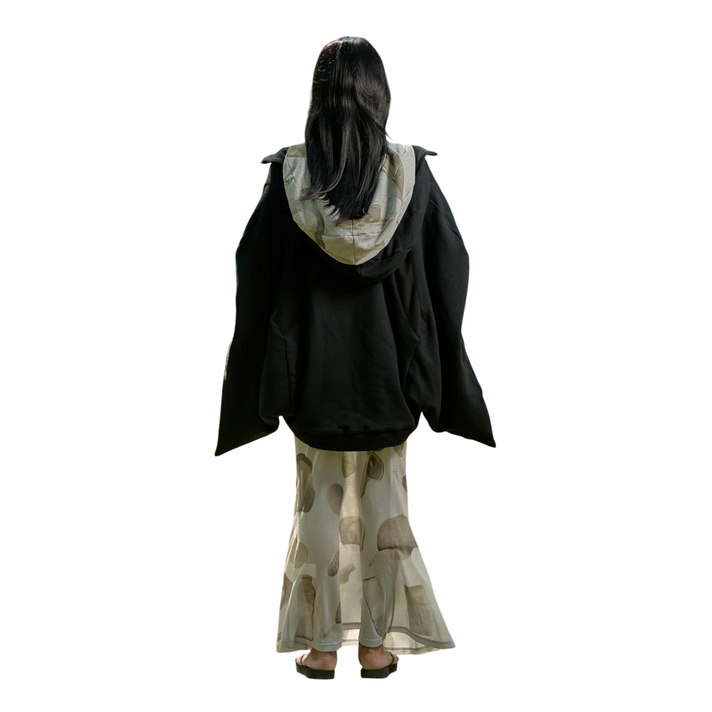 Bl They don’t pack and the backpack dissolves into graphic straps on the jacket. Black cotton terry cape hoodie with a wing-like silhouette. Black wool rib band armhole