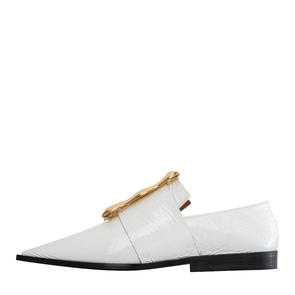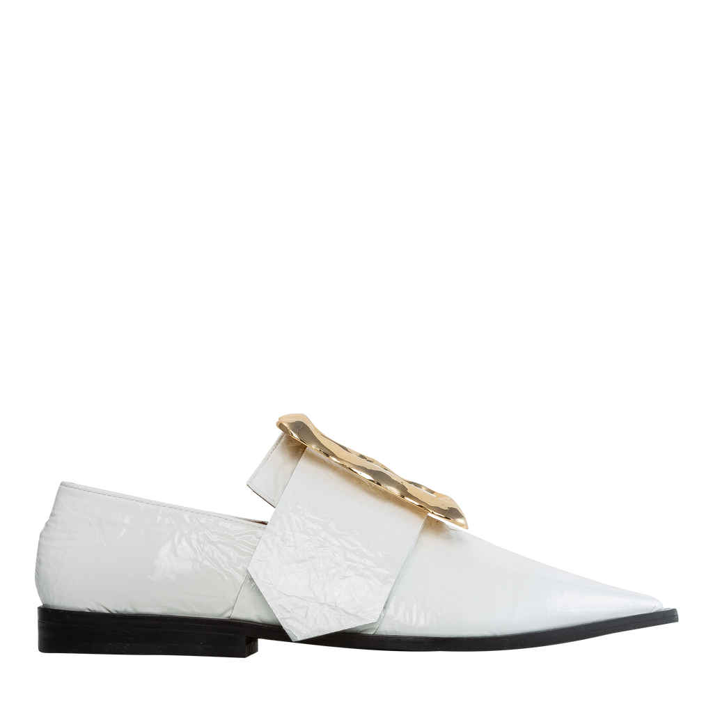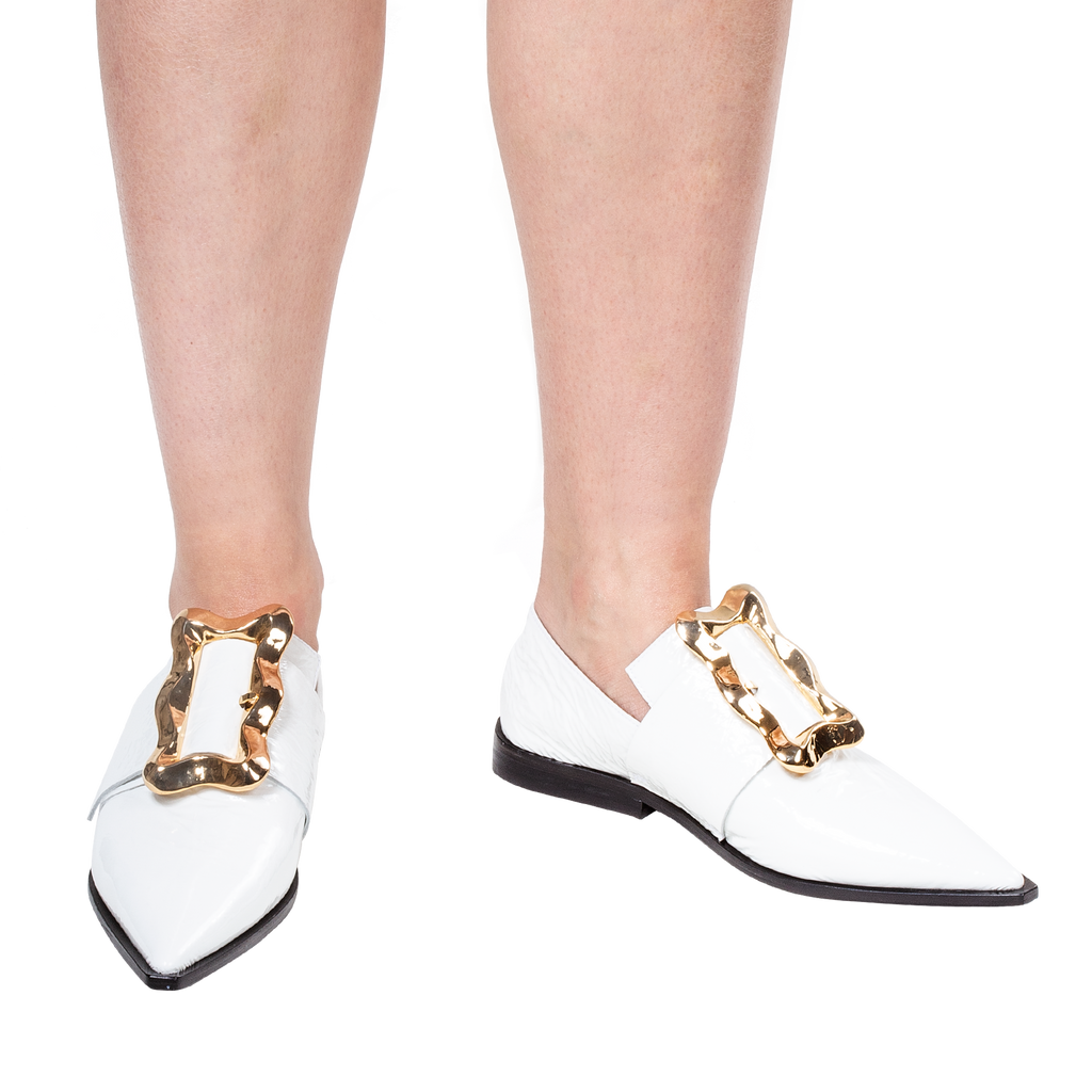 On-trend leather loafers with eye-catching metallic buckle detail. Leather upper, point toe, slip-on style, leather lining and sole and padded insole.