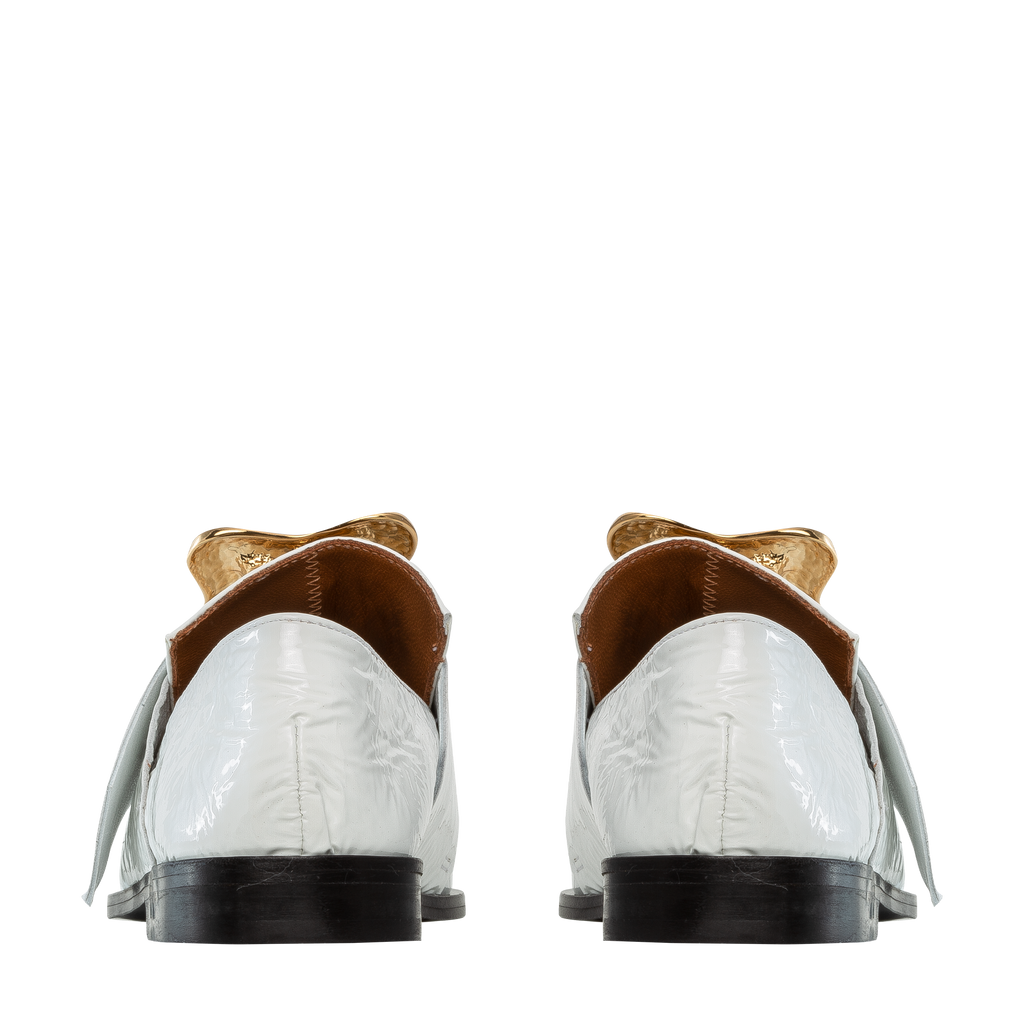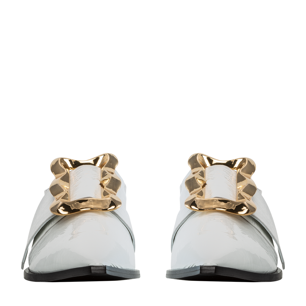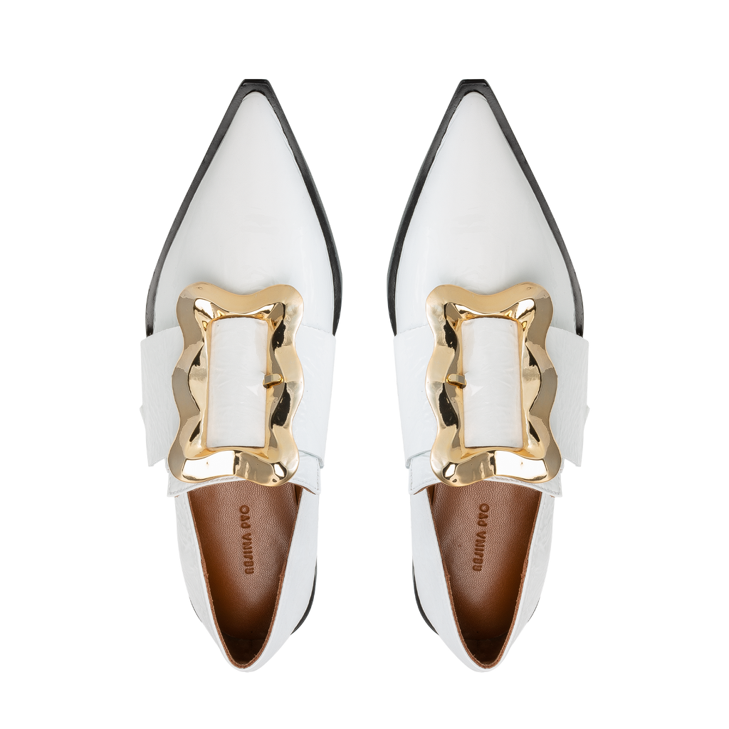 On-trend leather loafers with eye-catching metallic buckle detail. Leather upper, point toe, slip-on style, leather lining and sole and padded insole.