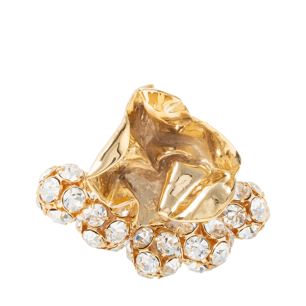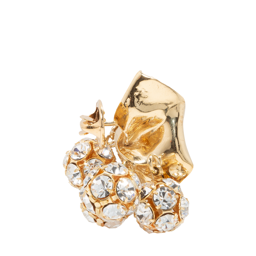 Hand formed crushed brass trimmed with rhinestone spheres. Clean gently with soft cloth.