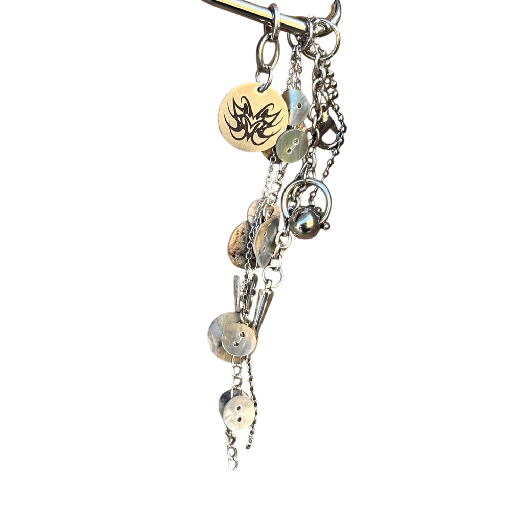 Material: Upcycled chains, pearl vintage buttons, plastic spike, logo tag