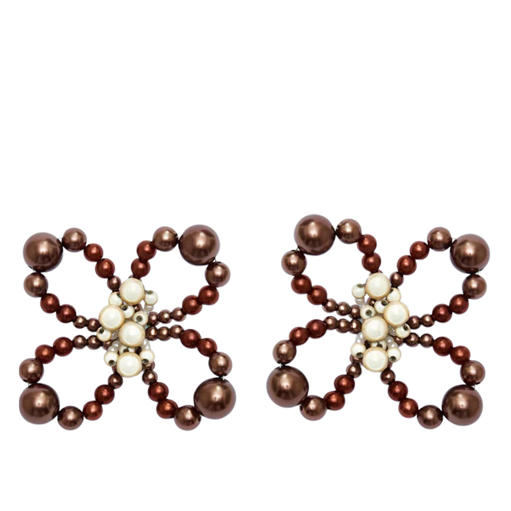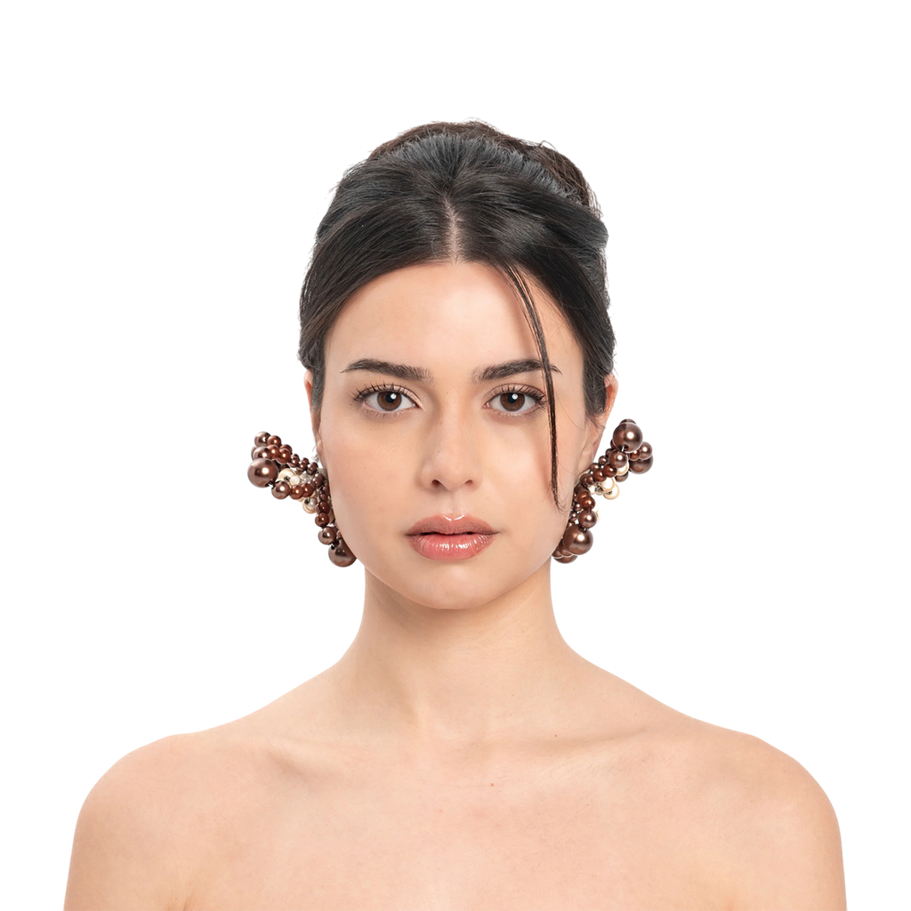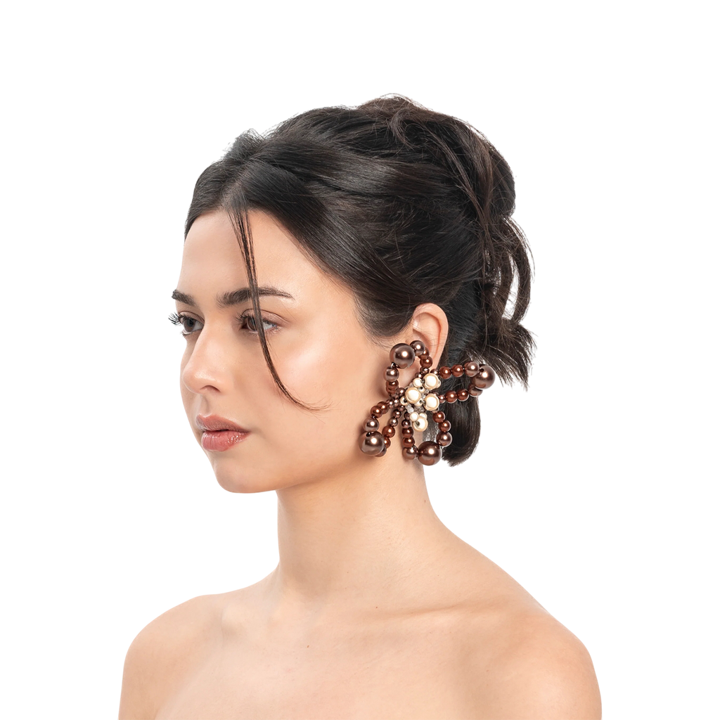 Hand-beaded earrings featuring ABS spheres with a pink-glazed backing, secured by omega and butterfly clasps. Designed with a high-reflective brown ball centerpiece. Made in Spain.