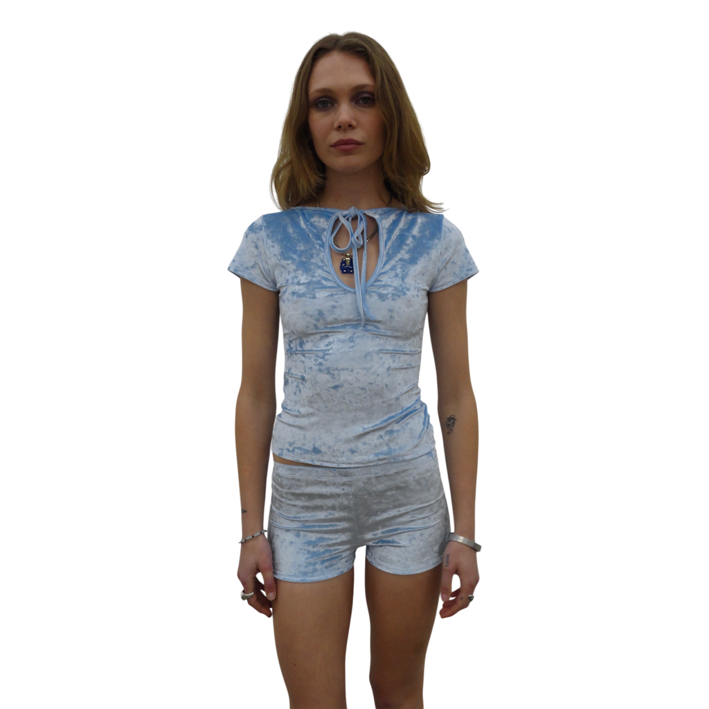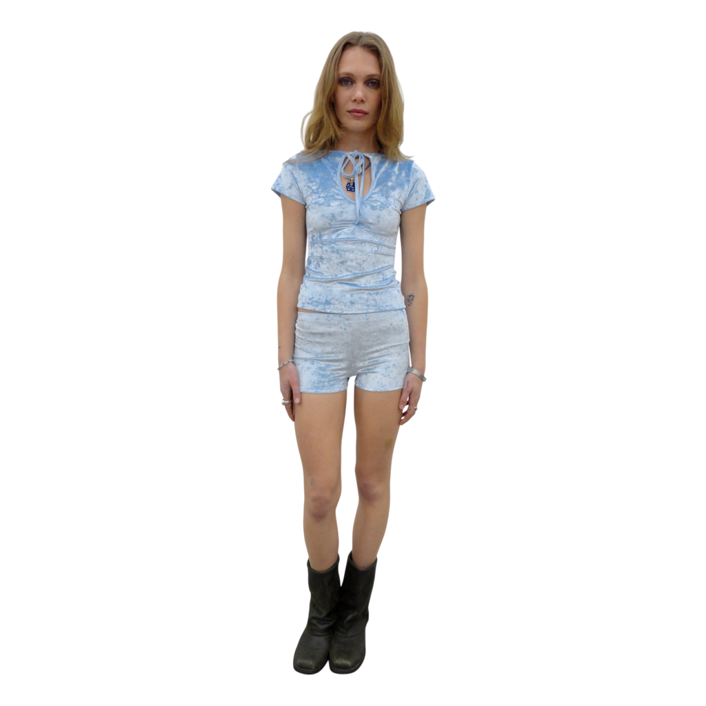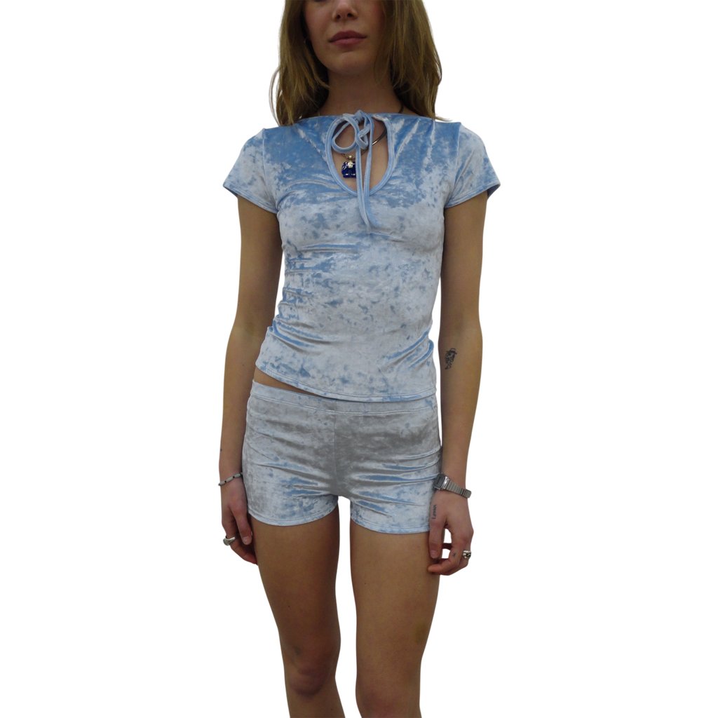 Hot shorts with elastic waistband in a deadstock ultra soft crushed velvet fabric.