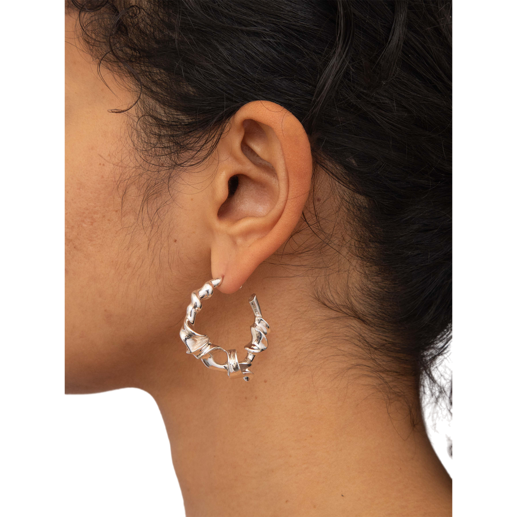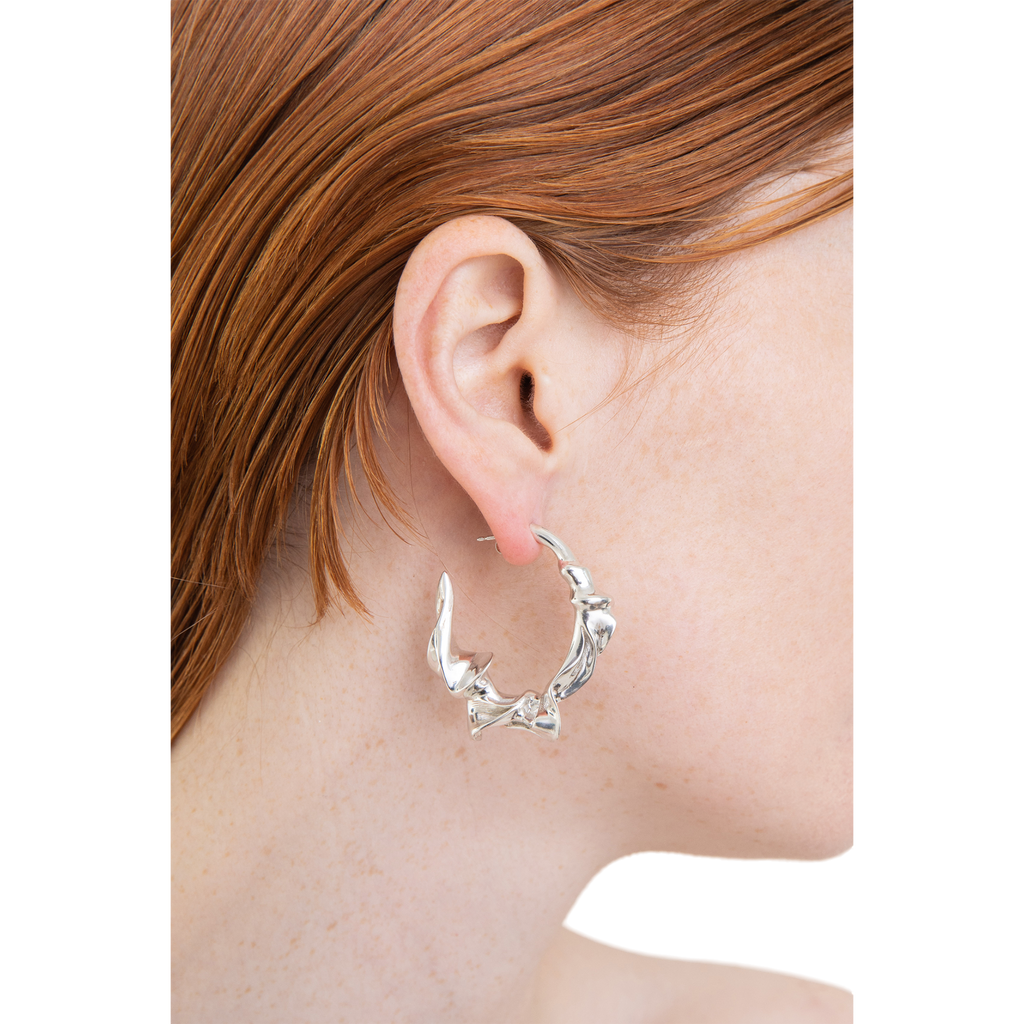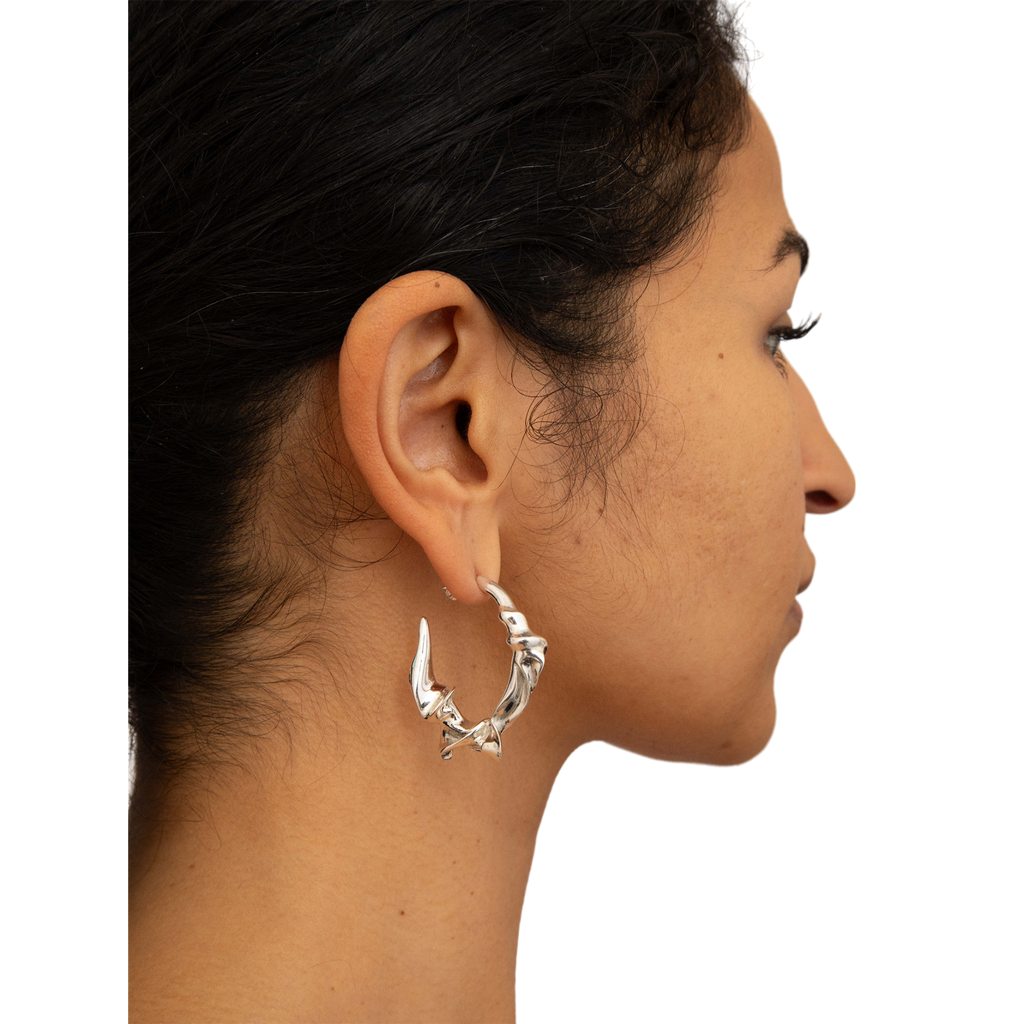 The left earring boasts dimensions of 3.8cm x 3.6cm, weighing approximately 19 grams, while the right earring measures 3.6cm x 3.7cm, with a weight of approximately 18 grams. Fashioned from solid recycled sterling silver, these earrings are a testament to refined artistry and sustainable style.