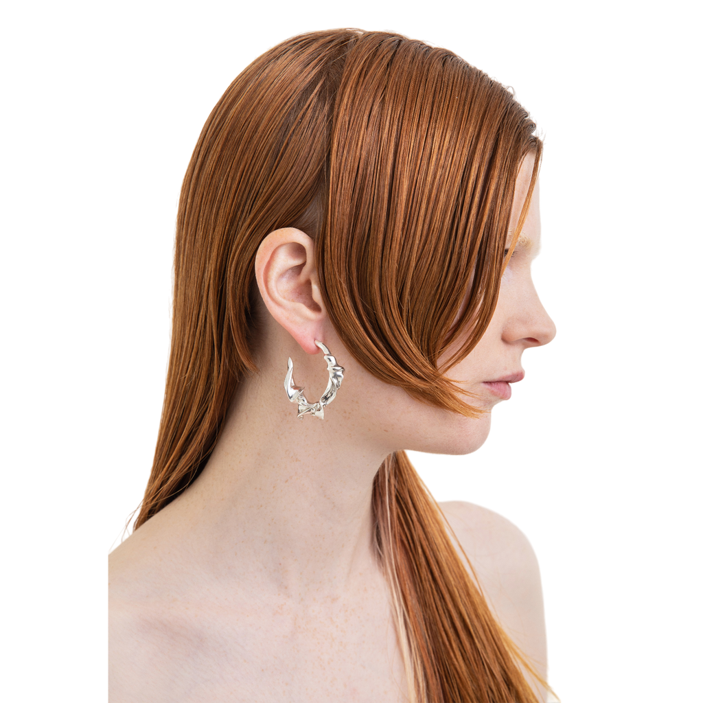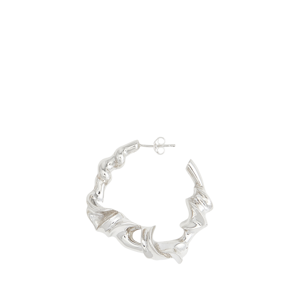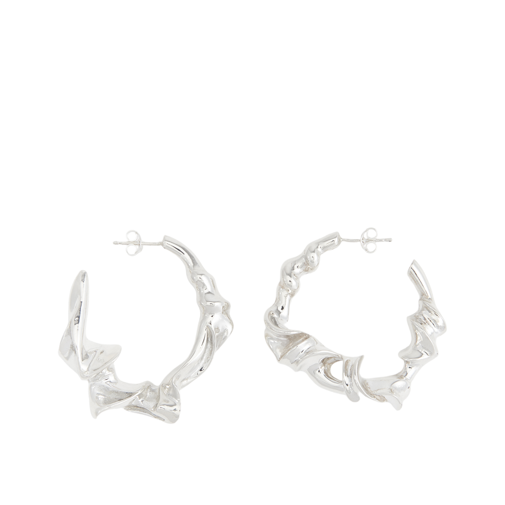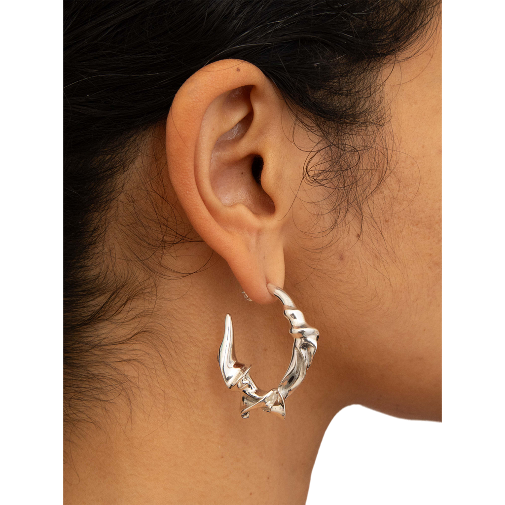 The left earring boasts dimensions of 3.8cm x 3.6cm, weighing approximately 19 grams, while the right earring measures 3.6cm x 3.7cm, with a weight of approximately 18 grams. Fashioned from solid recycled sterling silver, these earrings are a testament to refined artistry and sustainable style.