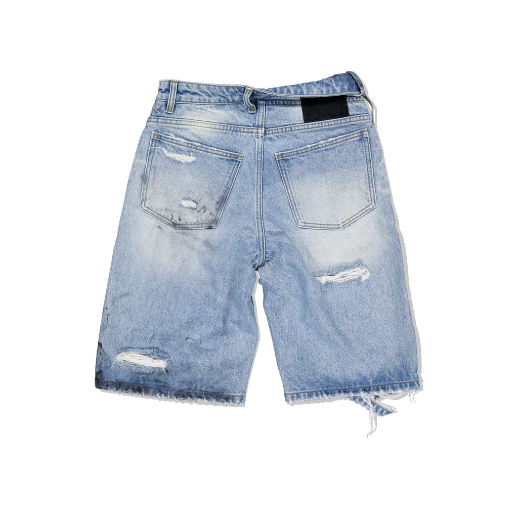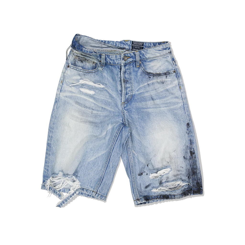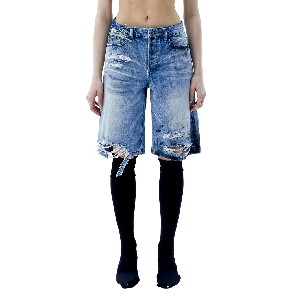 These blue Japanese denim jeans are designed for a medium fit with a mid-waist. They feature a covered zip fly, five pockets, and six belt loops for added convenience. The logo is engraved on the flex buttons, and there is a twist belt tunnel at the right waist for a stylish touch. The back is adorned with a logo inlaid suede patch. These jeans are finished with a unique dirty and damage effect for a distinctive look.