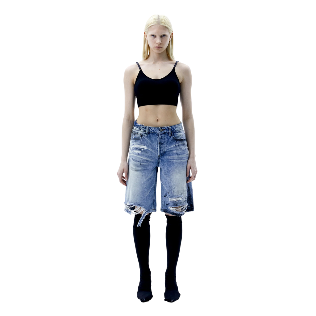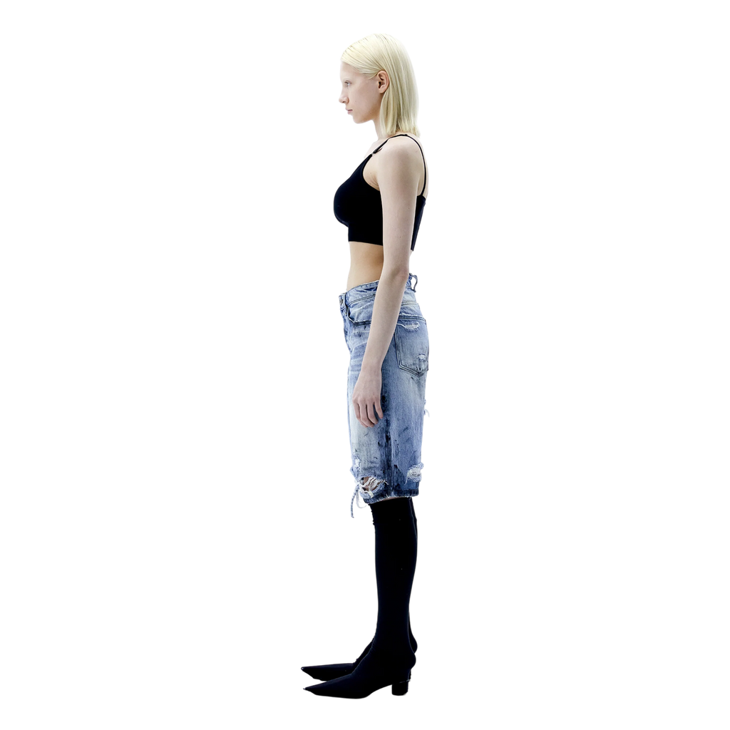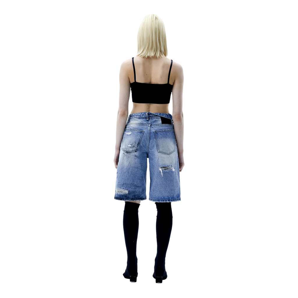 These blue Japanese denim jeans are designed for a medium fit with a mid-waist. They feature a covered zip fly, five pockets, and six belt loops for added convenience. The logo is engraved on the flex buttons, and there is a twist belt tunnel at the right waist for a stylish touch. The back is adorned with a logo inlaid suede patch. These jeans are finished with a unique dirty and damage effect for a distinctive look.