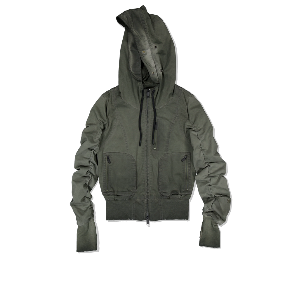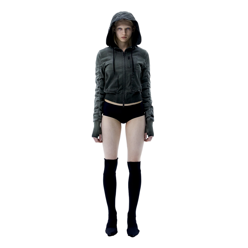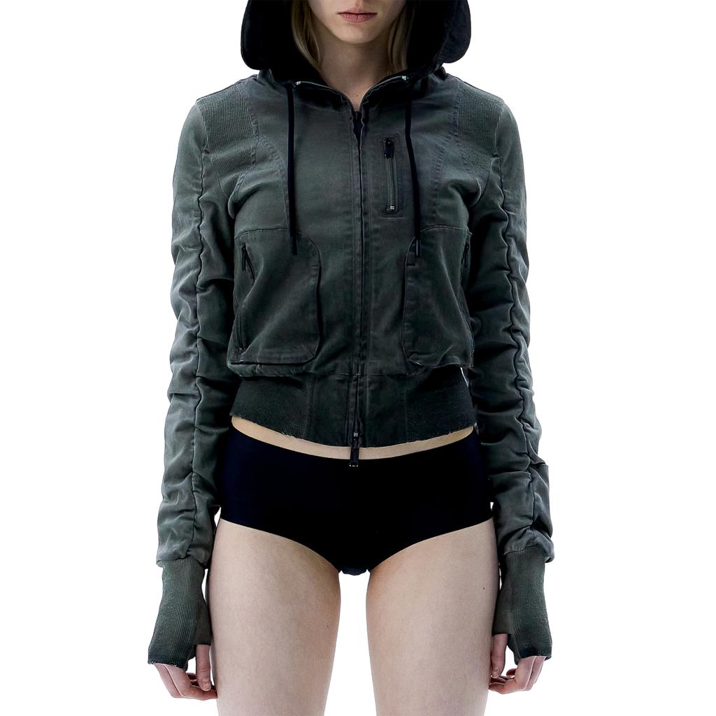 Crafted from Japanese cotton, our cropped jacket offers a stylish and comfortable fit. It features a double-ended zip fastening for added versatility. The jacket includes two cargo zipper pockets at the front, providing ample storage space. Finger hole cuffs and wrist and waistline ribbings add a unique touch to the design. Additionally, the jacket is designed with a mini snap button pocket at the left-hand sleeve for added convenience. It includes a hood with a drawcord and ribs for a snug fit, with a hidden snap button on the hood brim for added functionality. The jacket is finished with a trendy worn-out, ombre washed-out effect, adding a modern and edgy look.