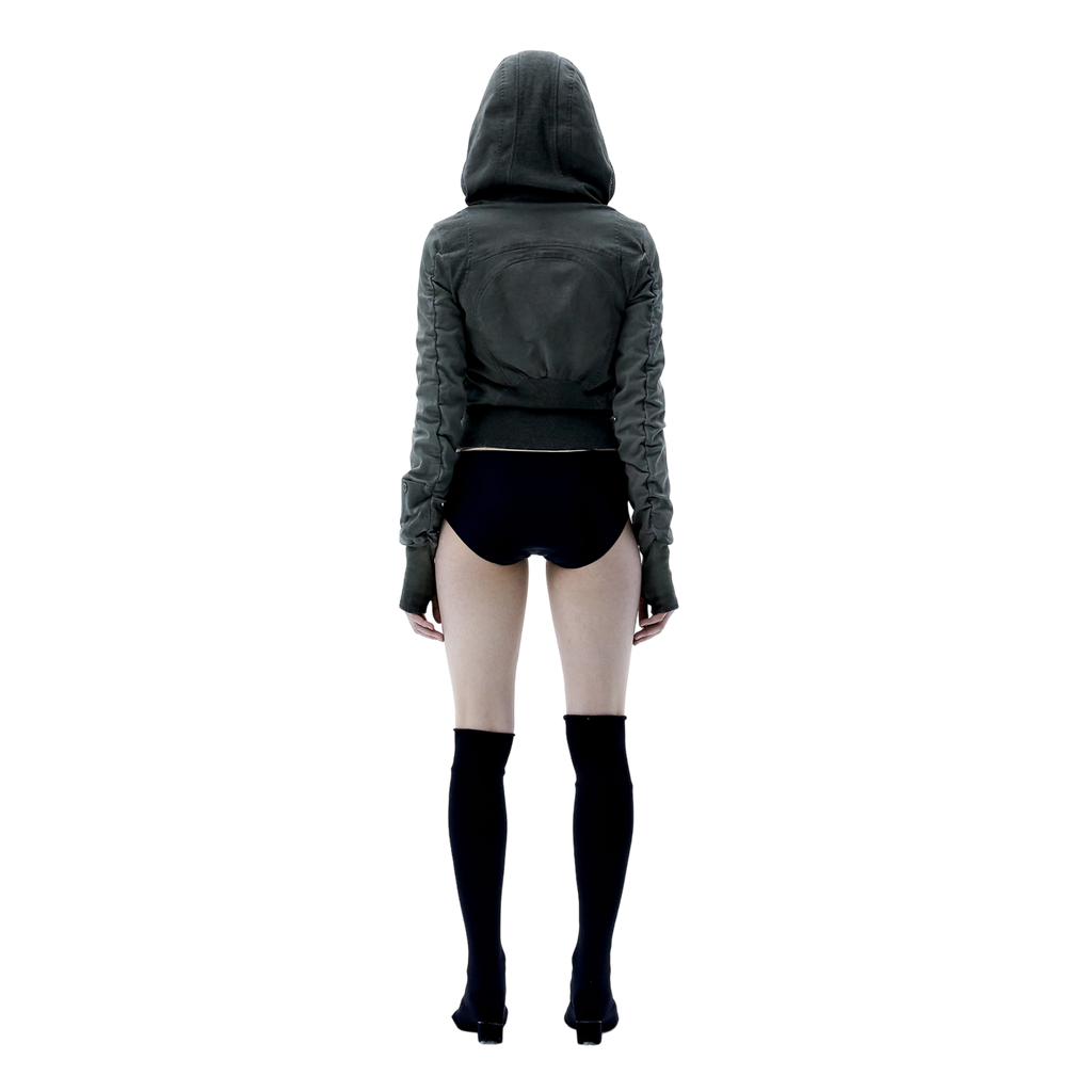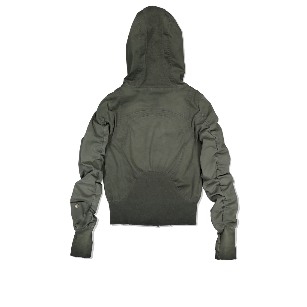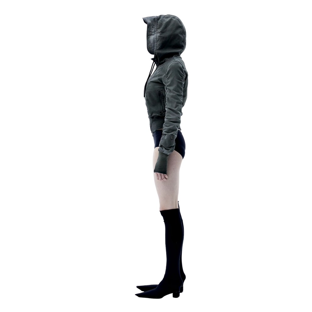 Crafted from Japanese cotton, our cropped jacket offers a stylish and comfortable fit. It features a double-ended zip fastening for added versatility. The jacket includes two cargo zipper pockets at the front, providing ample storage space. Finger hole cuffs and wrist and waistline ribbings add a unique touch to the design. Additionally, the jacket is designed with a mini snap button pocket at the left-hand sleeve for added convenience. It includes a hood with a drawcord and ribs for a snug fit, with a hidden snap button on the hood brim for added functionality. The jacket is finished with a trendy worn-out, ombre washed-out effect, adding a modern and edgy look.