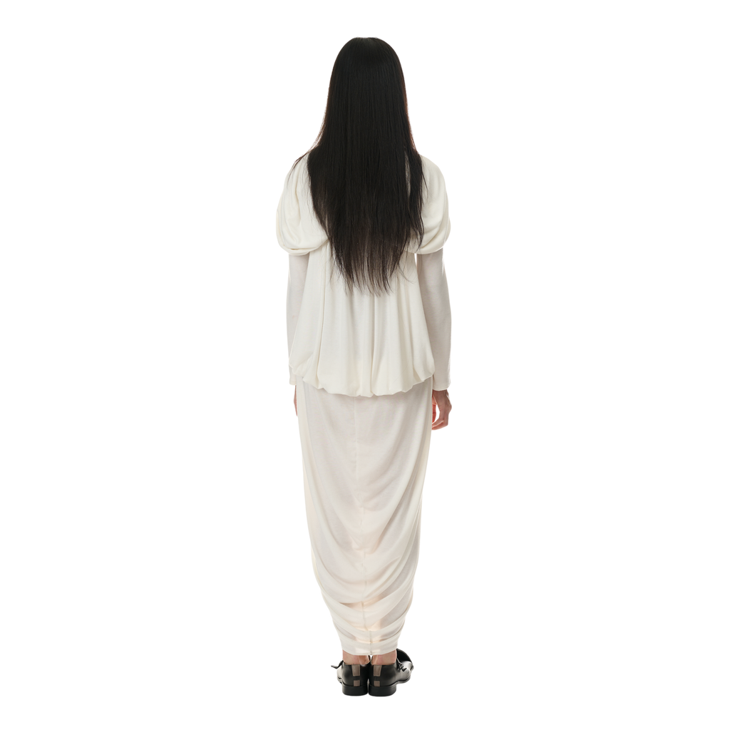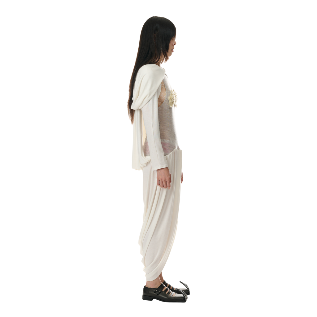 The Double Hooded Window Motif Dress, crafted from an ultra-soft 75% rayon and 25% wooljersey, features a draped, curtain-inspired bottom with soft gathering for a flowing silhouette. The grey bodice is adorned with window motifs made from faux lamb fur. Its versatile double hoods can be styled draped over the shoulders or pulled up for extra coverage.