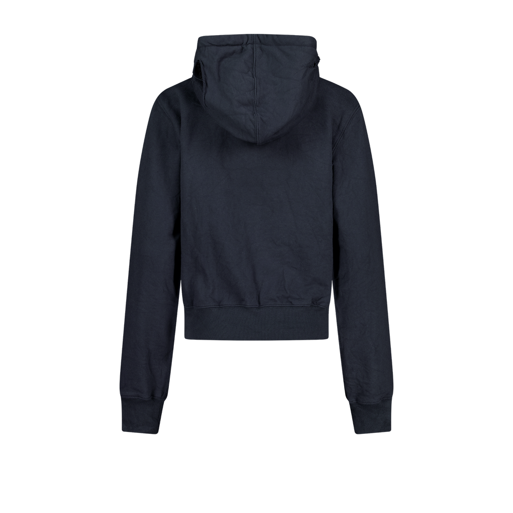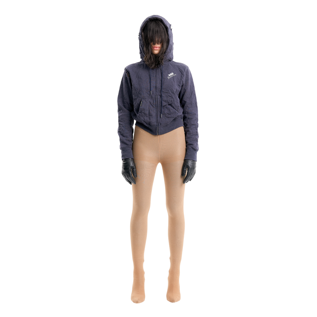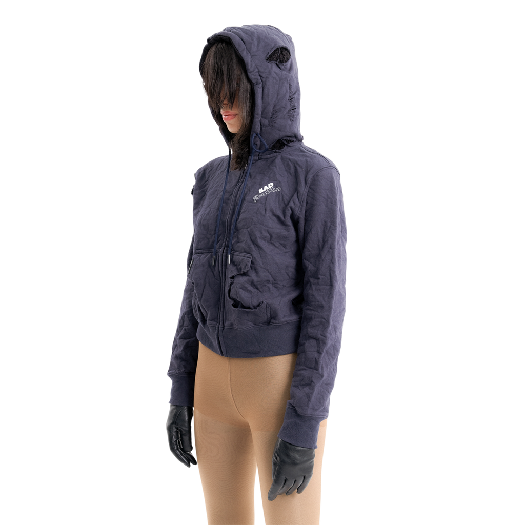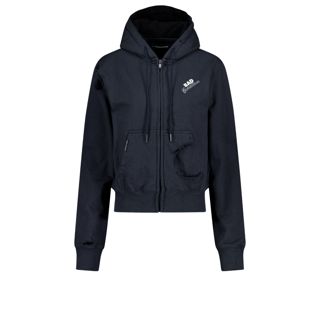Hood with drawstrings and distressed kangaroo pocket on the left side.