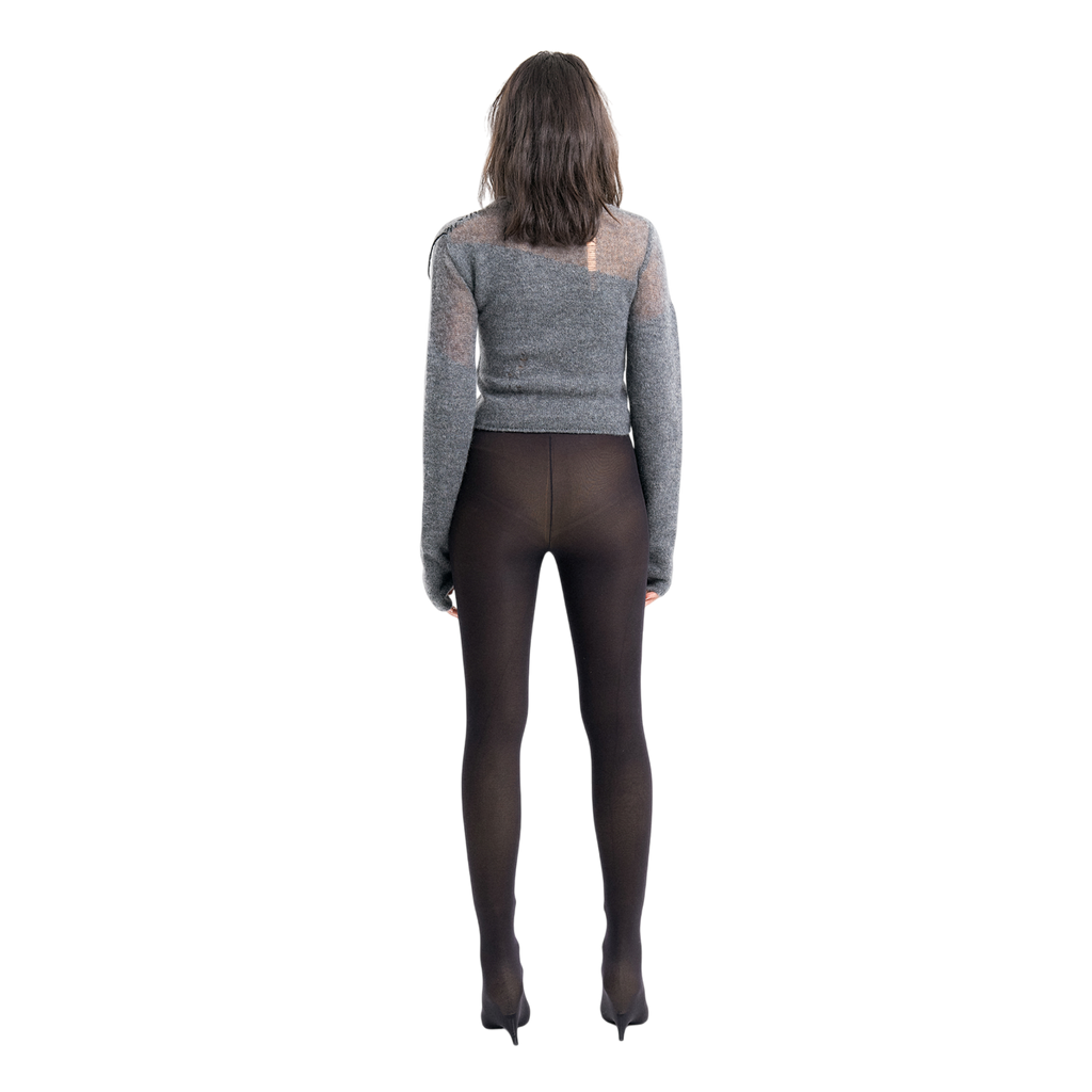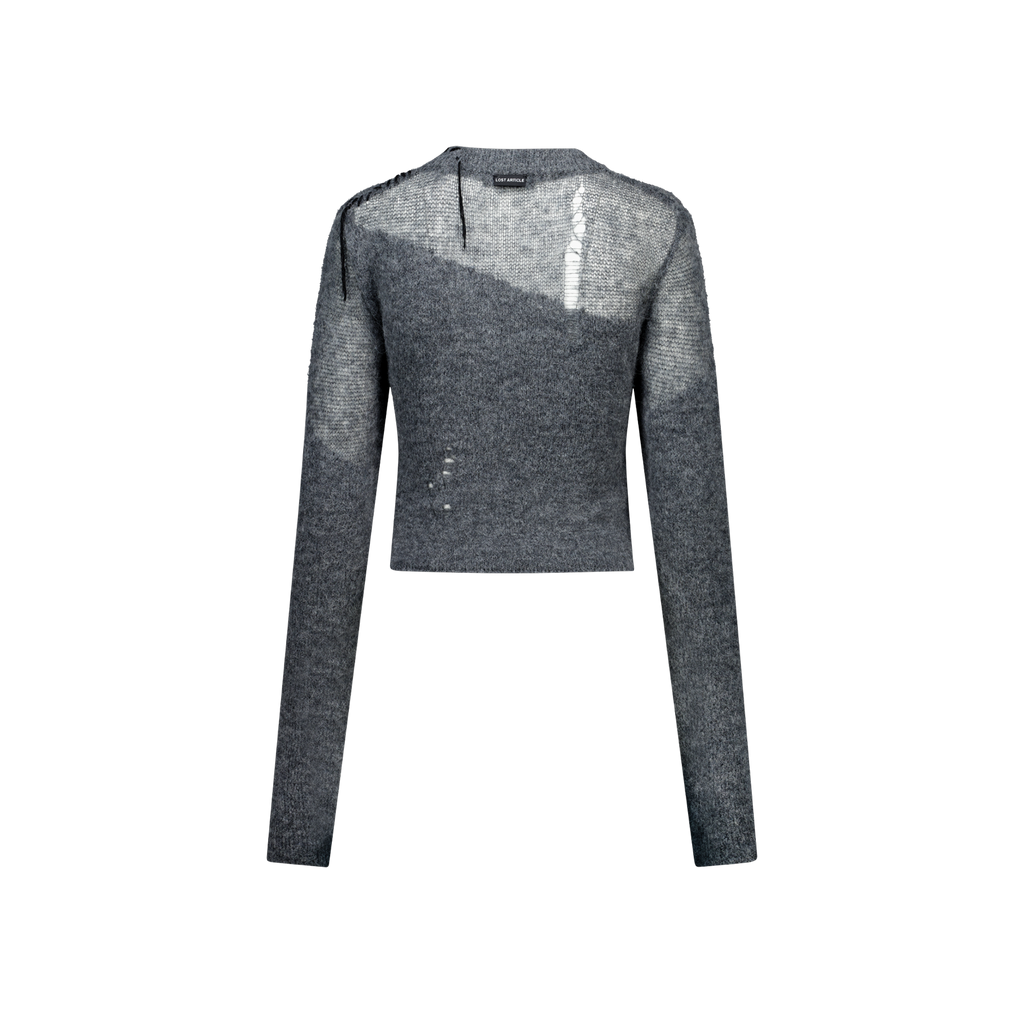 Sheer knit with asymmetrical lines and hand-stitched details.