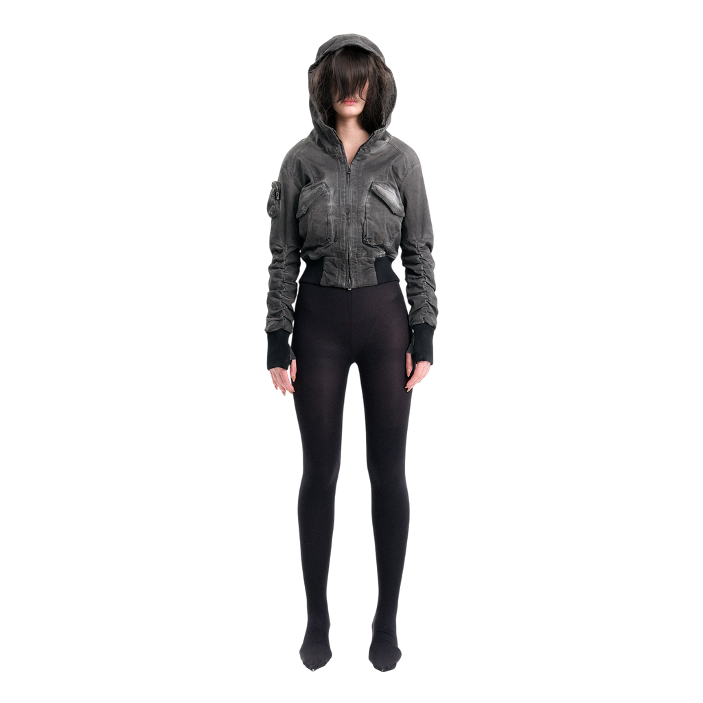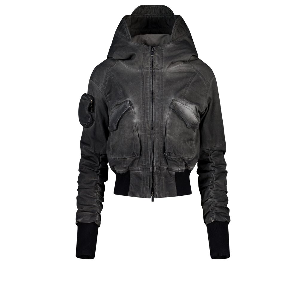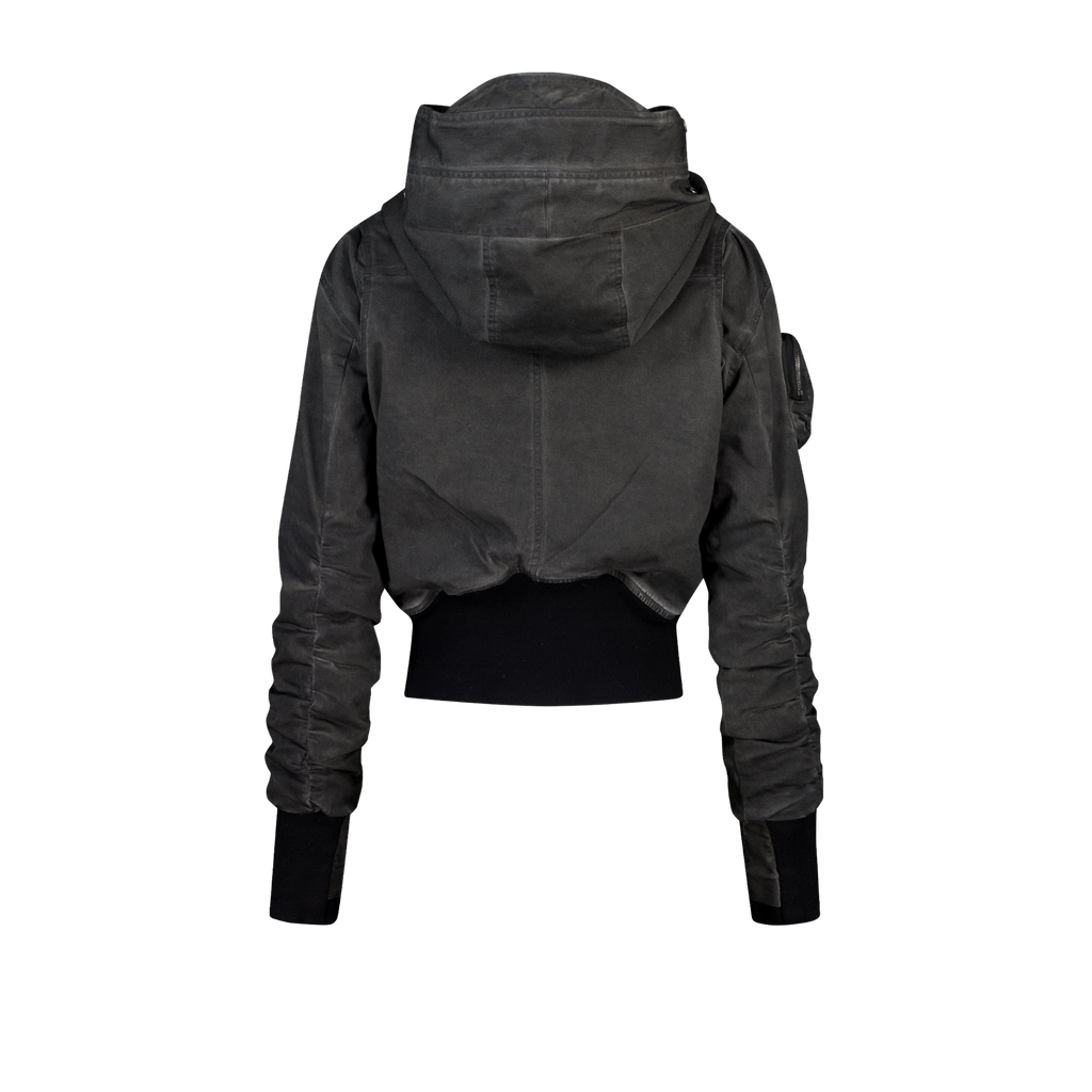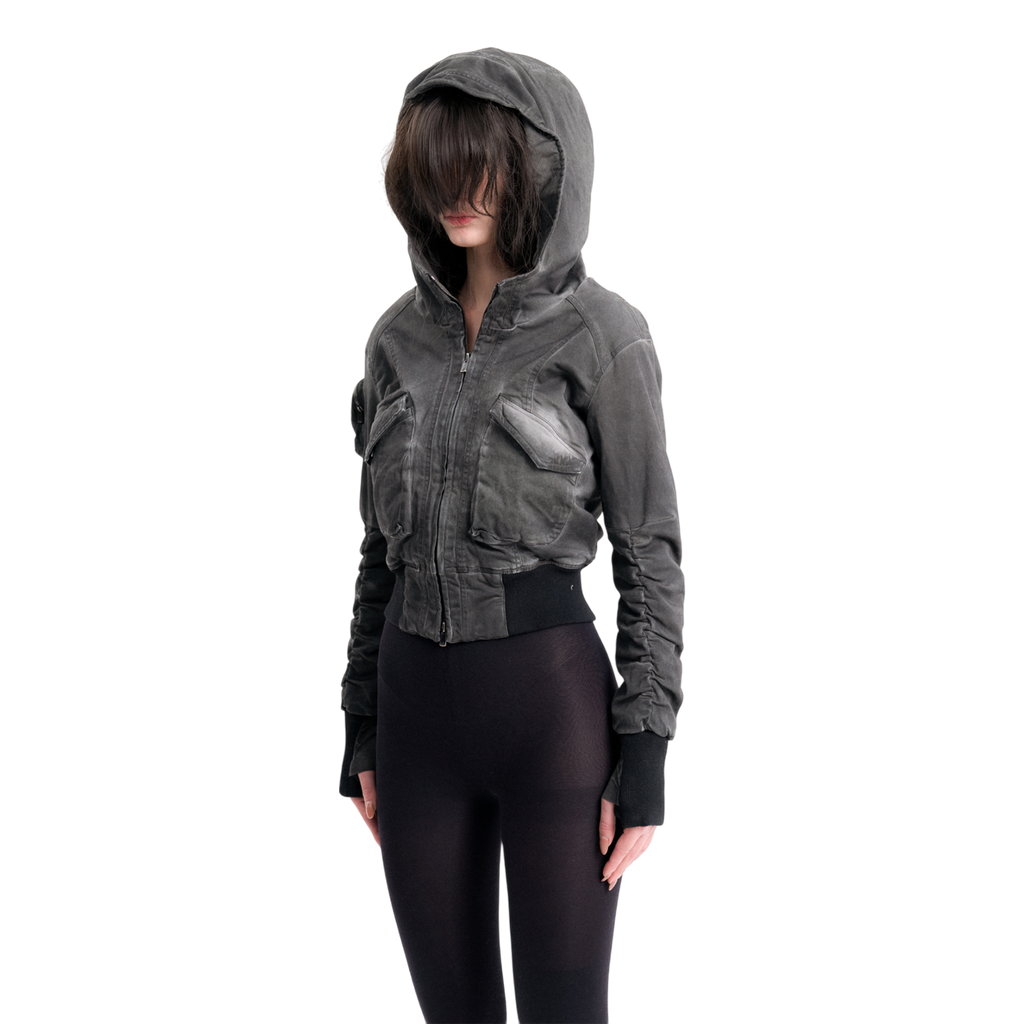Mini cargo pocket on the right sleeve and a hood with wires.