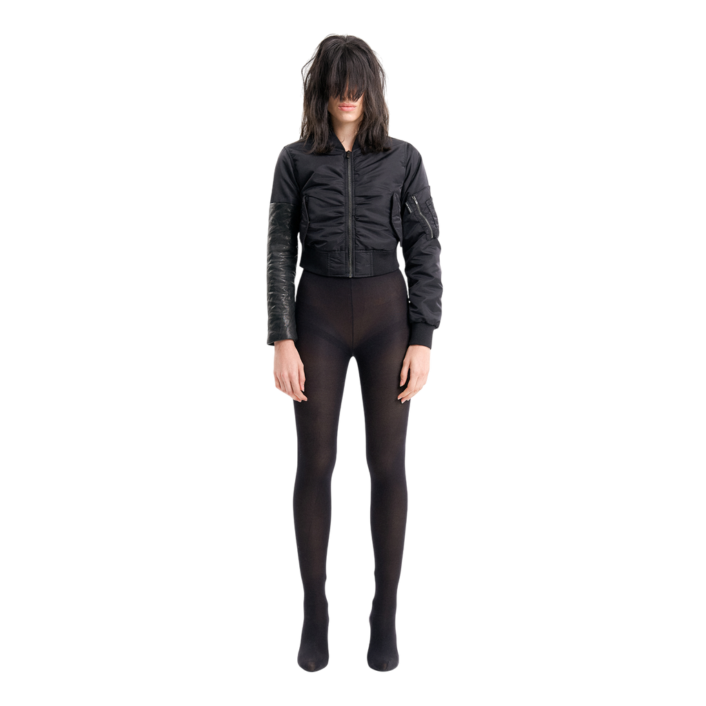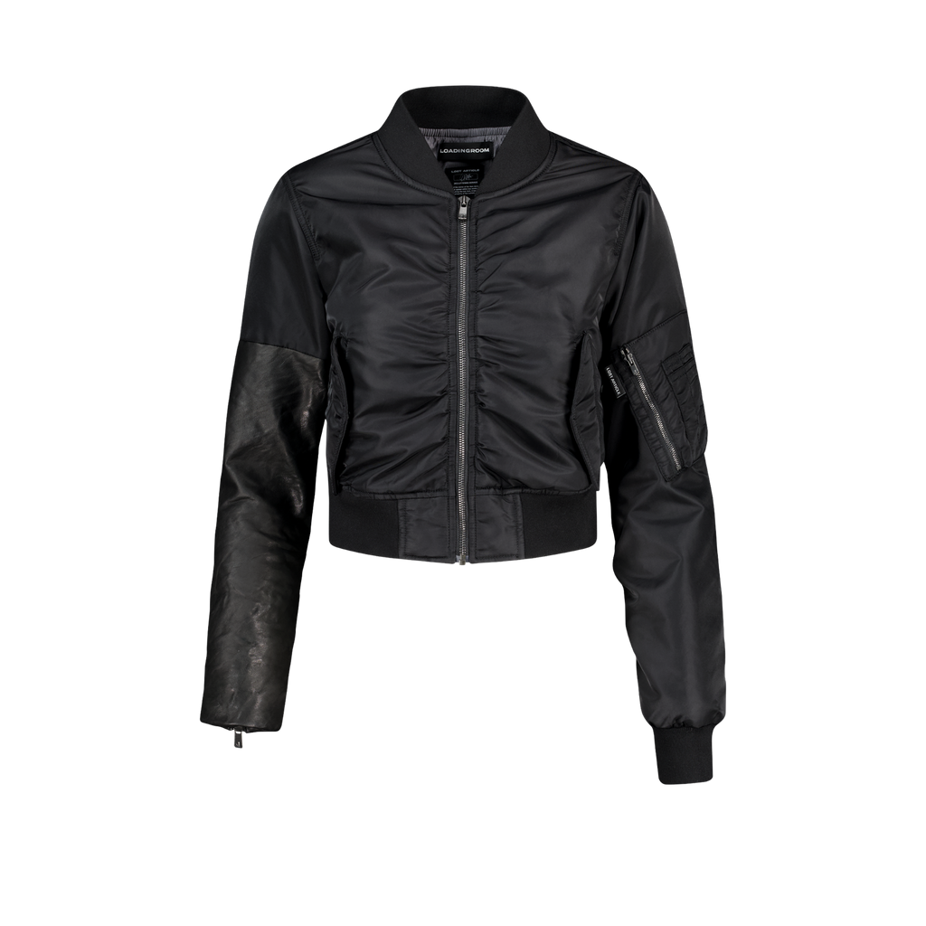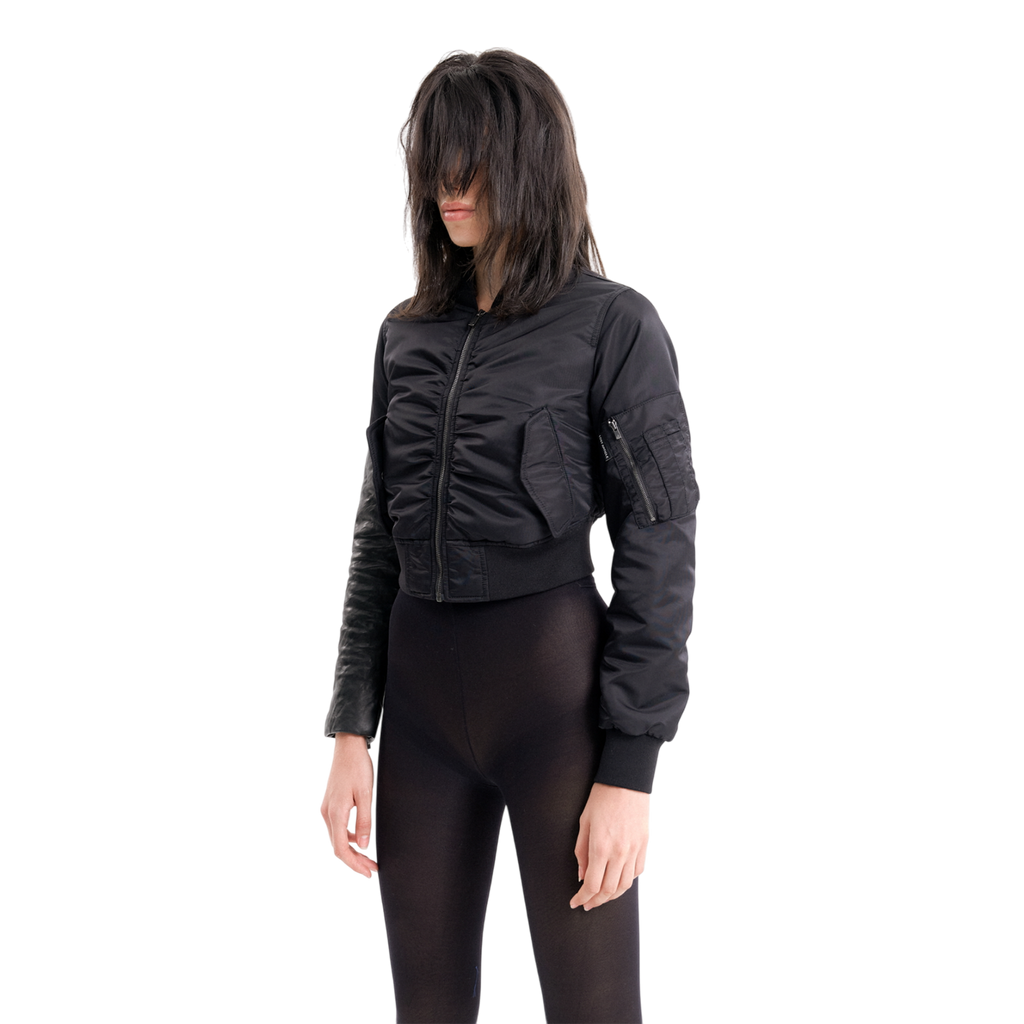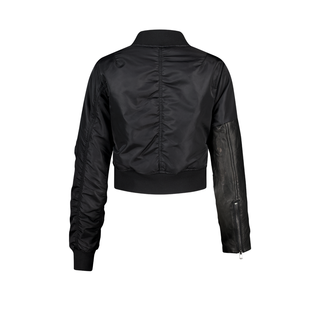 Cropped fit with a front zipper fastening and unbalanced sleeve design.