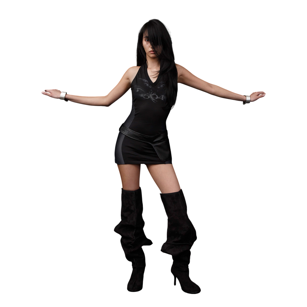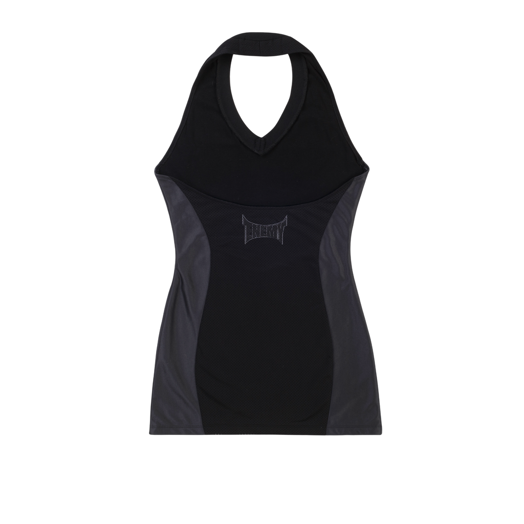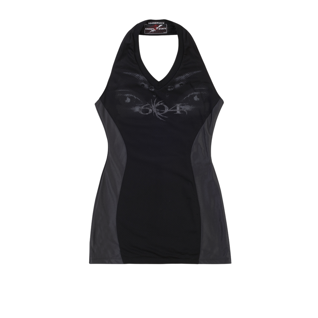 A slim-fitting halterneck dress crafted from mesh fabric featuring an all-over graphic print by 604SERVICE. Part of the 0625 Enemy of State season, the piece is finished with a signature woven label at the hem. Designed with an open back and fully lined to reduce sheerness, this dress combines bold visual impact with thoughtful construction.