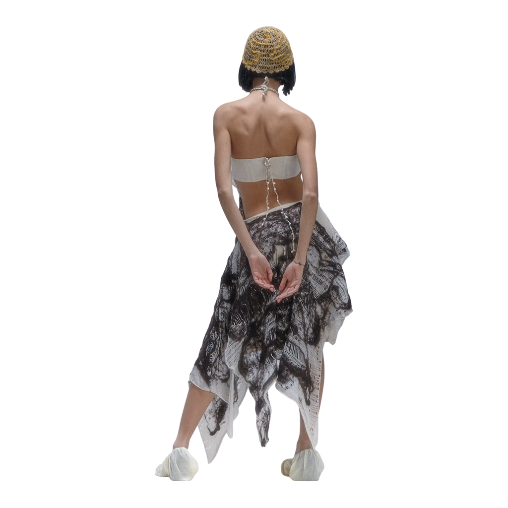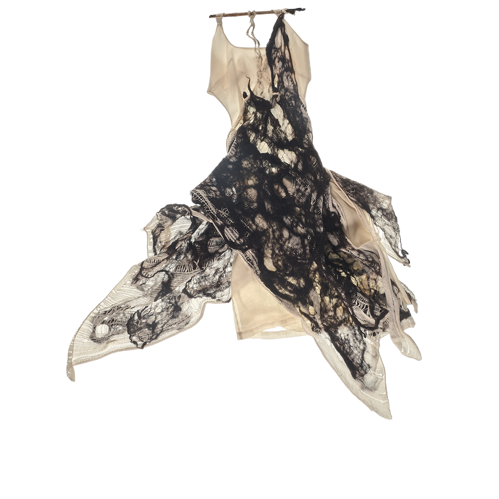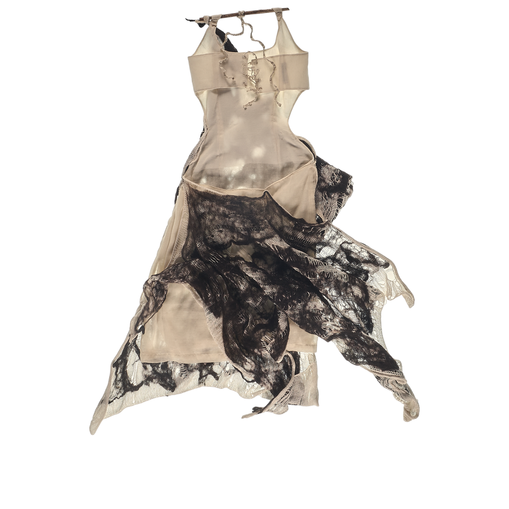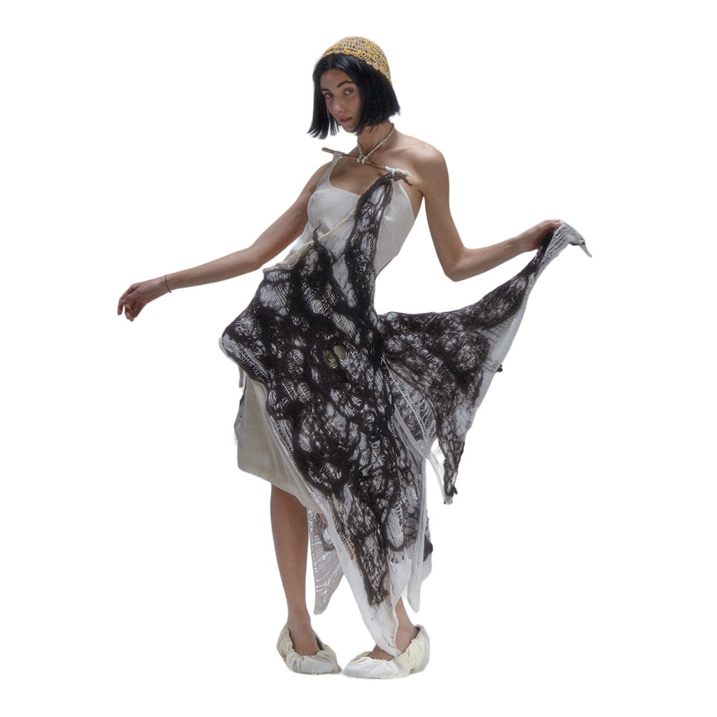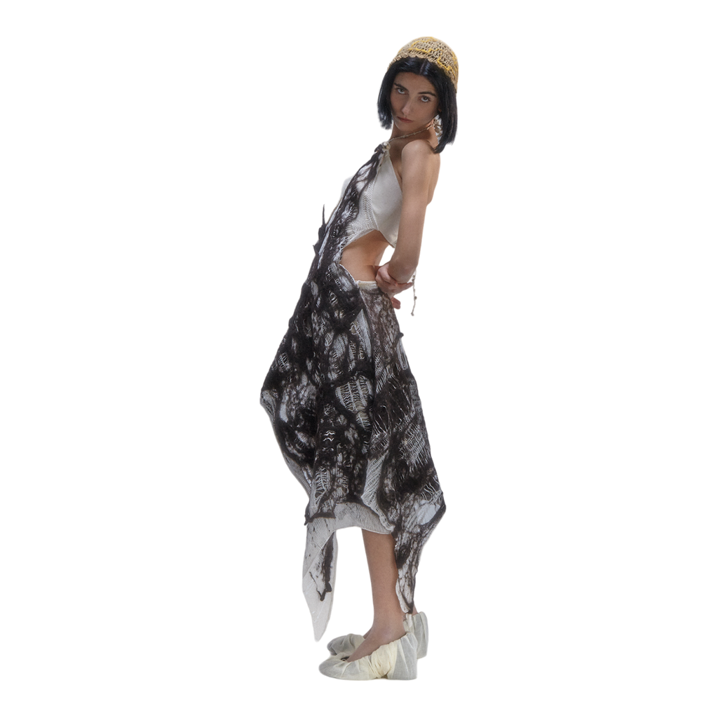 The Mid-Leg Length Open Back Dress features a front panel closed with a wood stick and crochet lace to be held at the neck. The back panel is closed with handmade crochet lace, and the whole dress is covered with a layer of handmade felt knit.