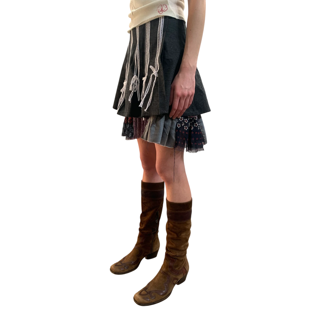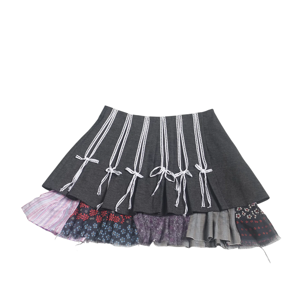 Patchwork lining extends from the skirt (fabric may vary as it's made from scrap materials).