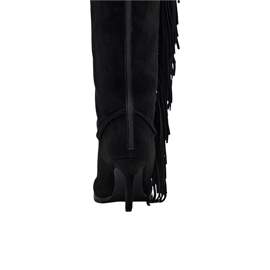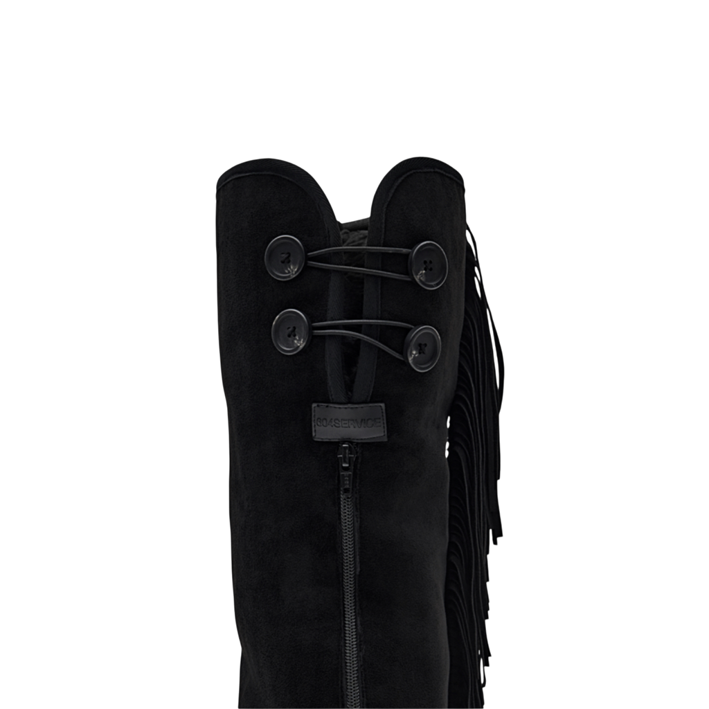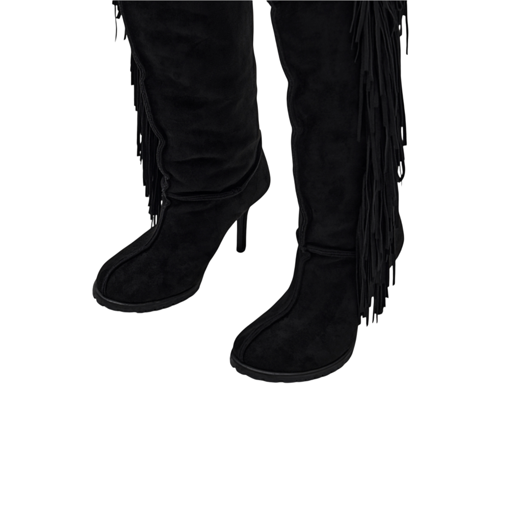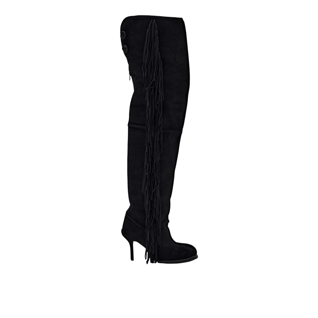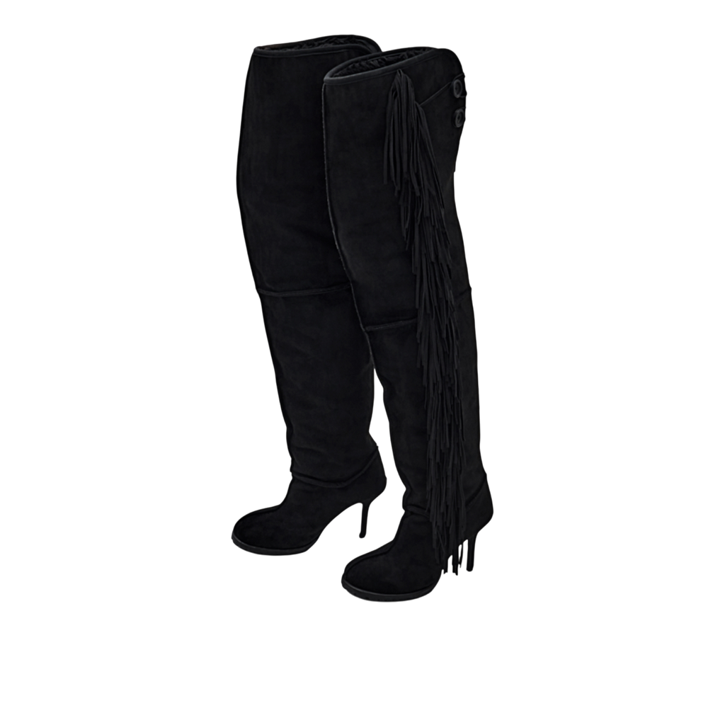 Fringe Thigh-High Suede Shearling Heeled Boots