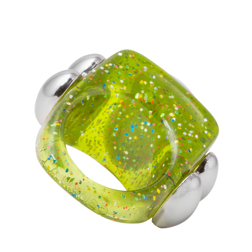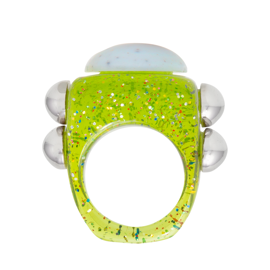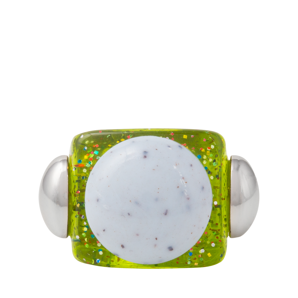 Material: Gypsy silver oval, blue circle on a base of a glittery green square ring.