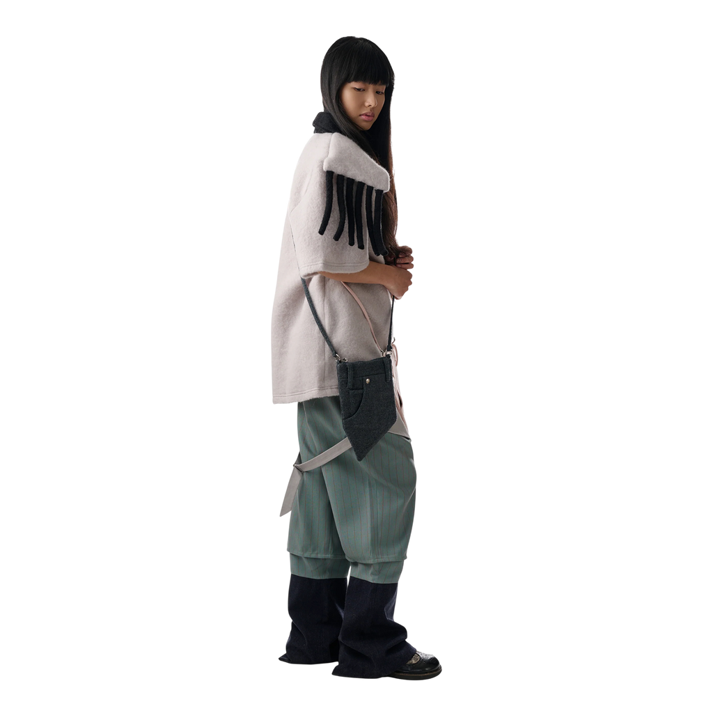 Features an attached fringed scarf detail draped over the shoulder.